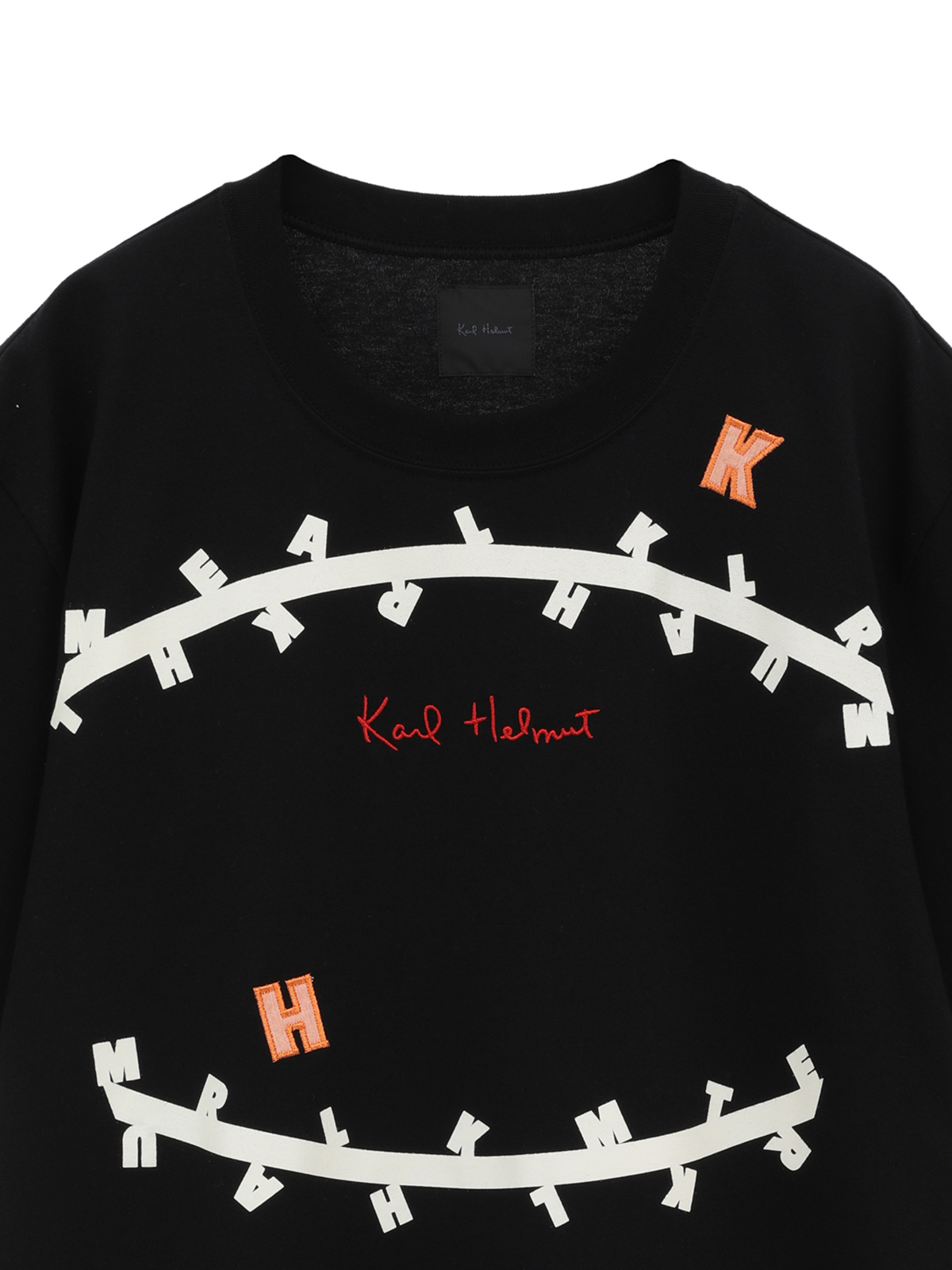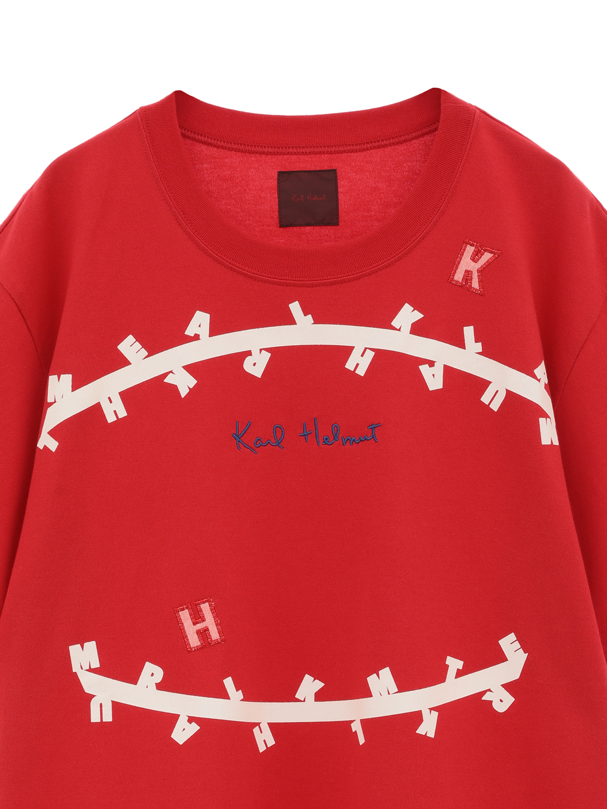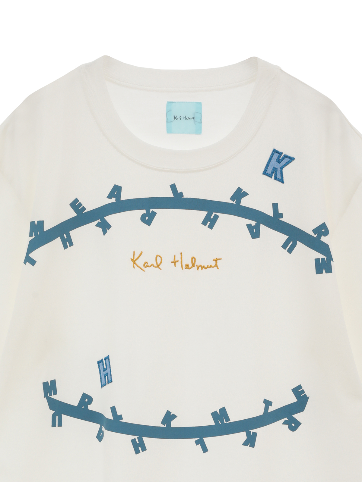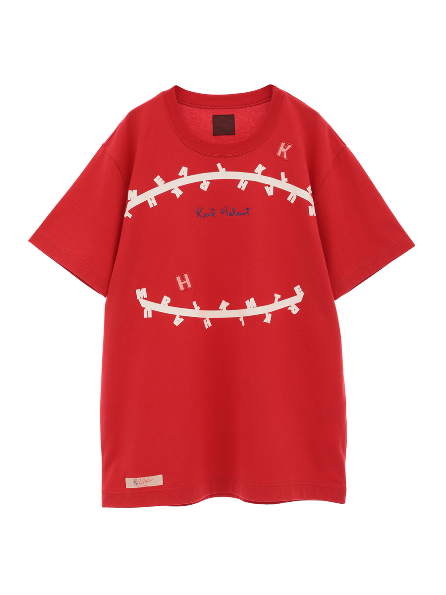 無造作に引いた2本のラインのうえに、KARL HELMUTのイニシャルロゴをランダムに並べたユニークで面白みのあるプリントがとても印象的なTシャツ。
