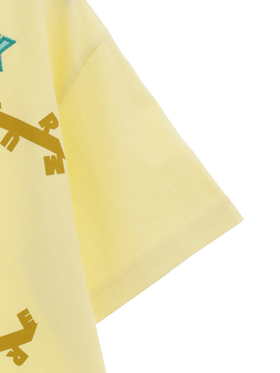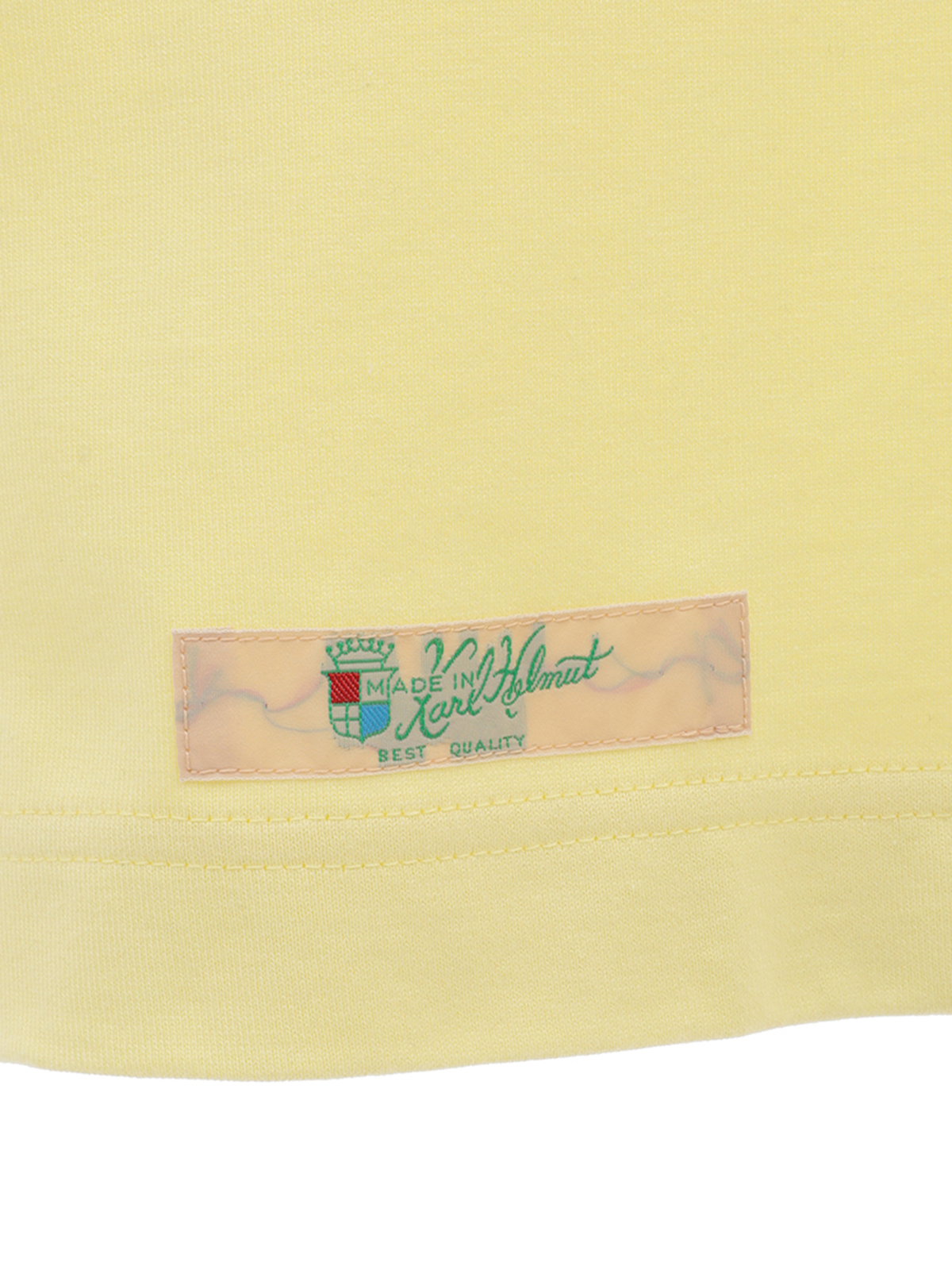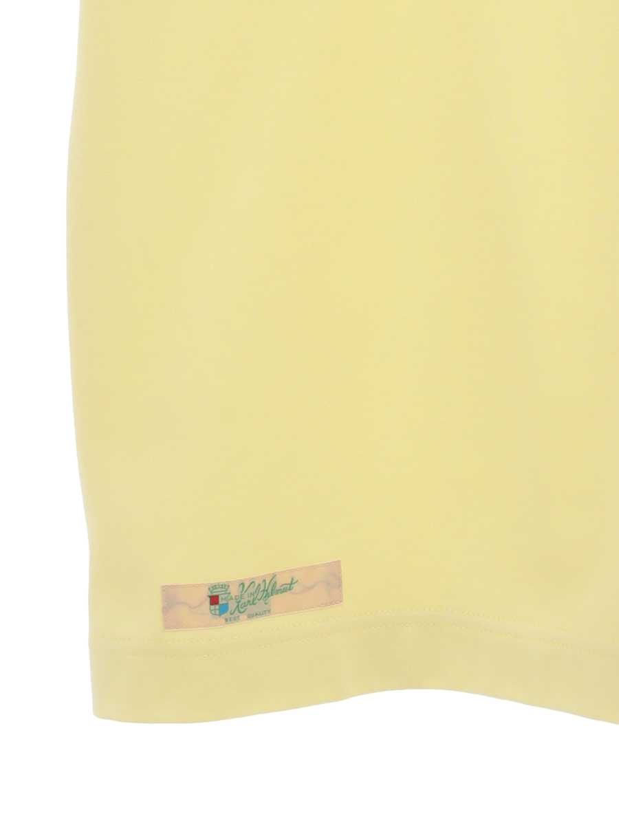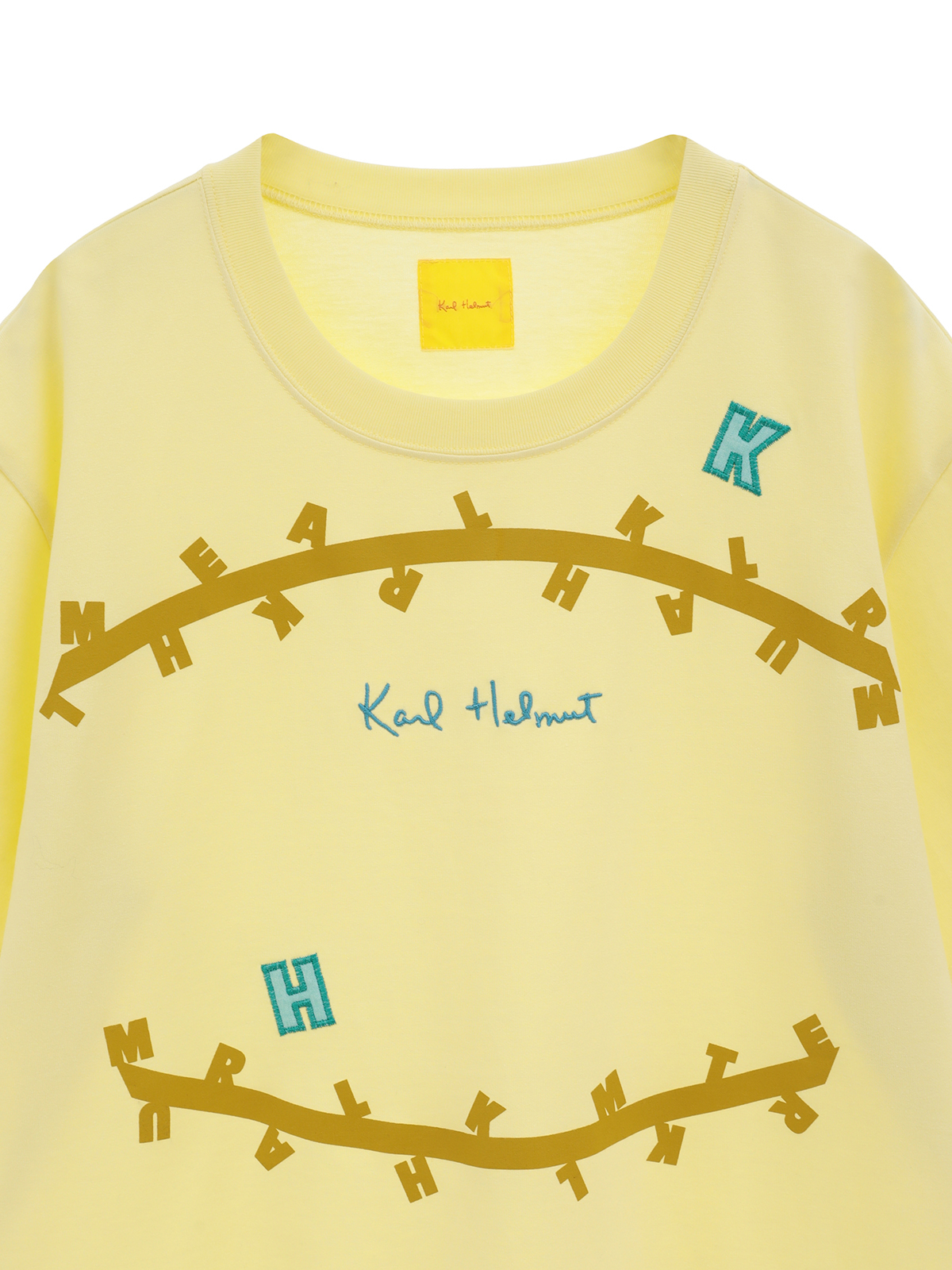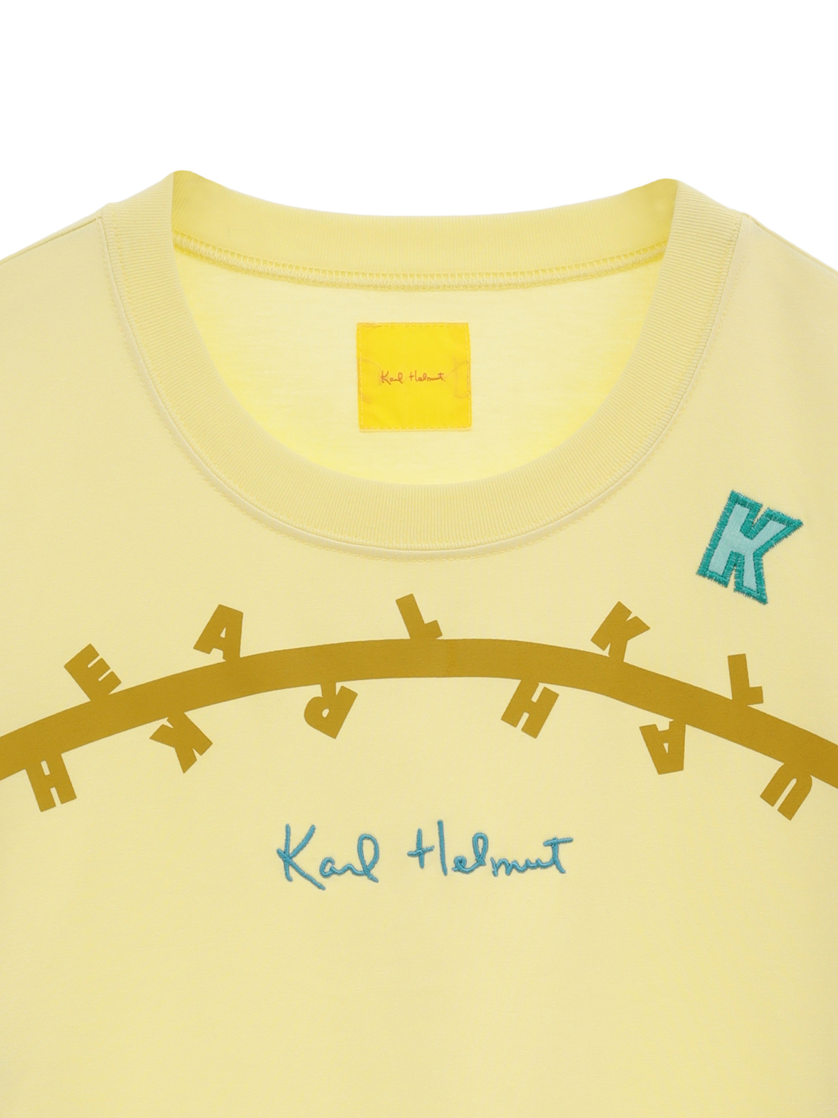 無造作に引いた2本のラインのうえに、KARL HELMUTのイニシャルロゴをランダムに並べたユニークで面白みのあるプリントがとても印象的なTシャツ。