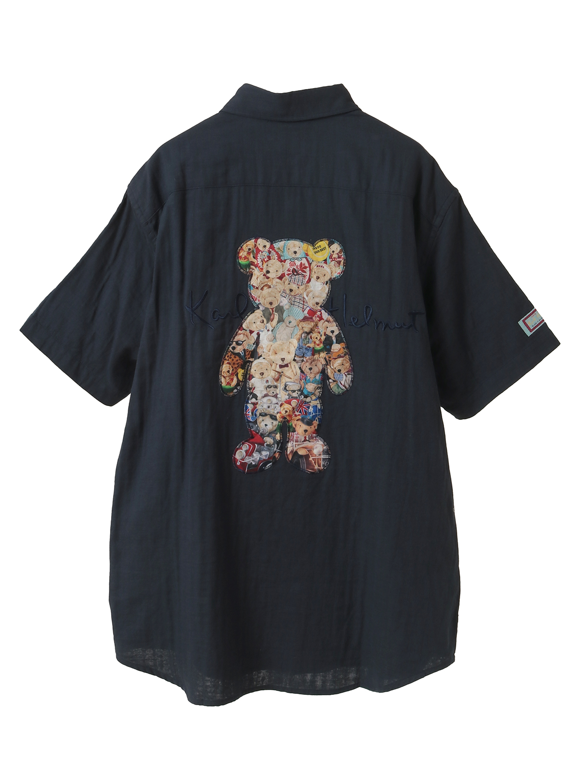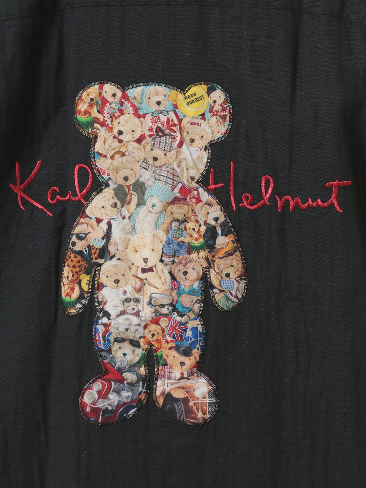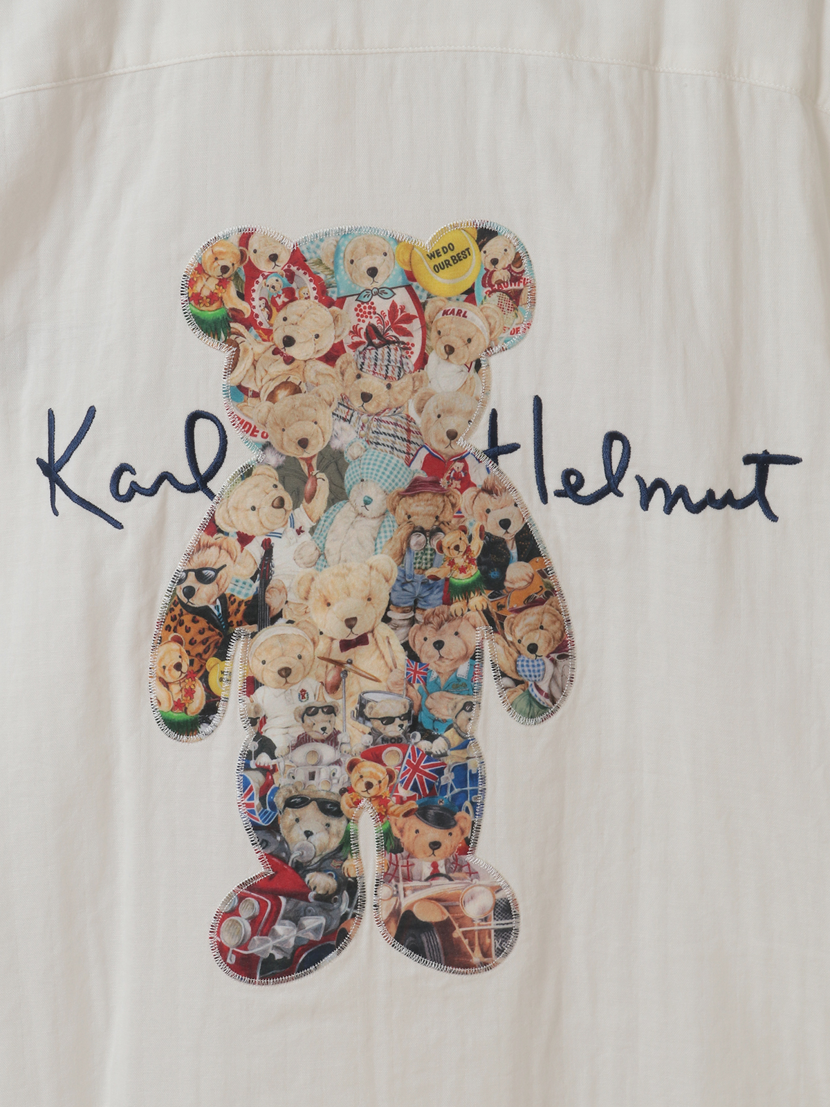 Karlくんのシルエットのなかに、さまざまなKarlくんのアートを敷き詰めた巨大アップリケを背中にあしらった後ろすがたがとっても可愛いシャツブラウス。アップリケを挟むようにロゴ刺繍を添えてアクセントに。