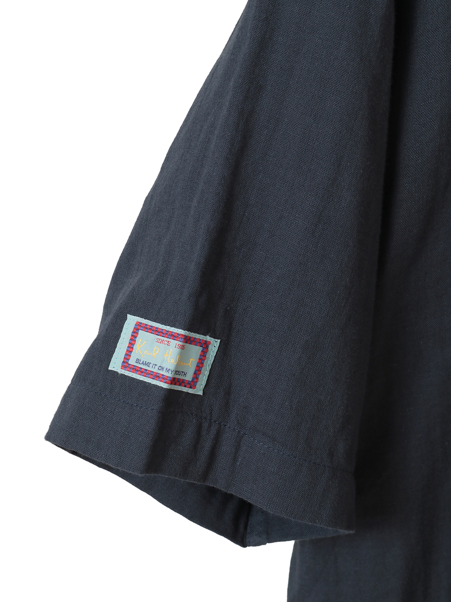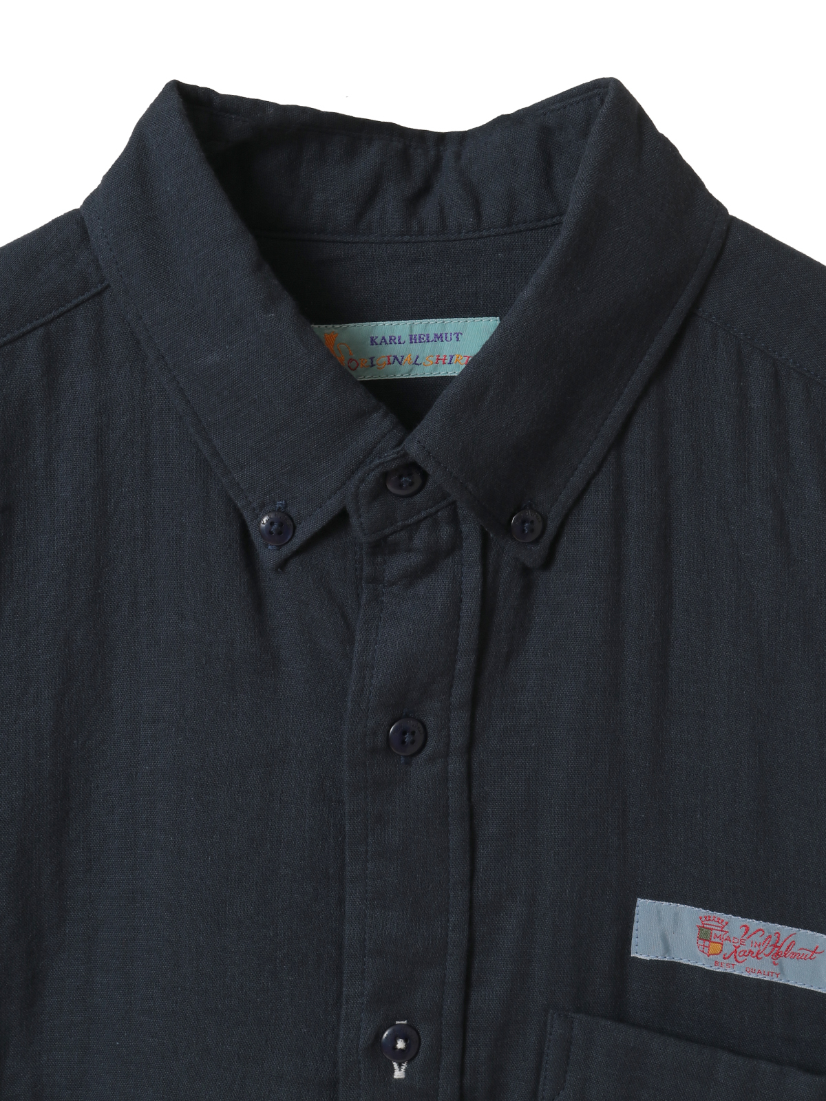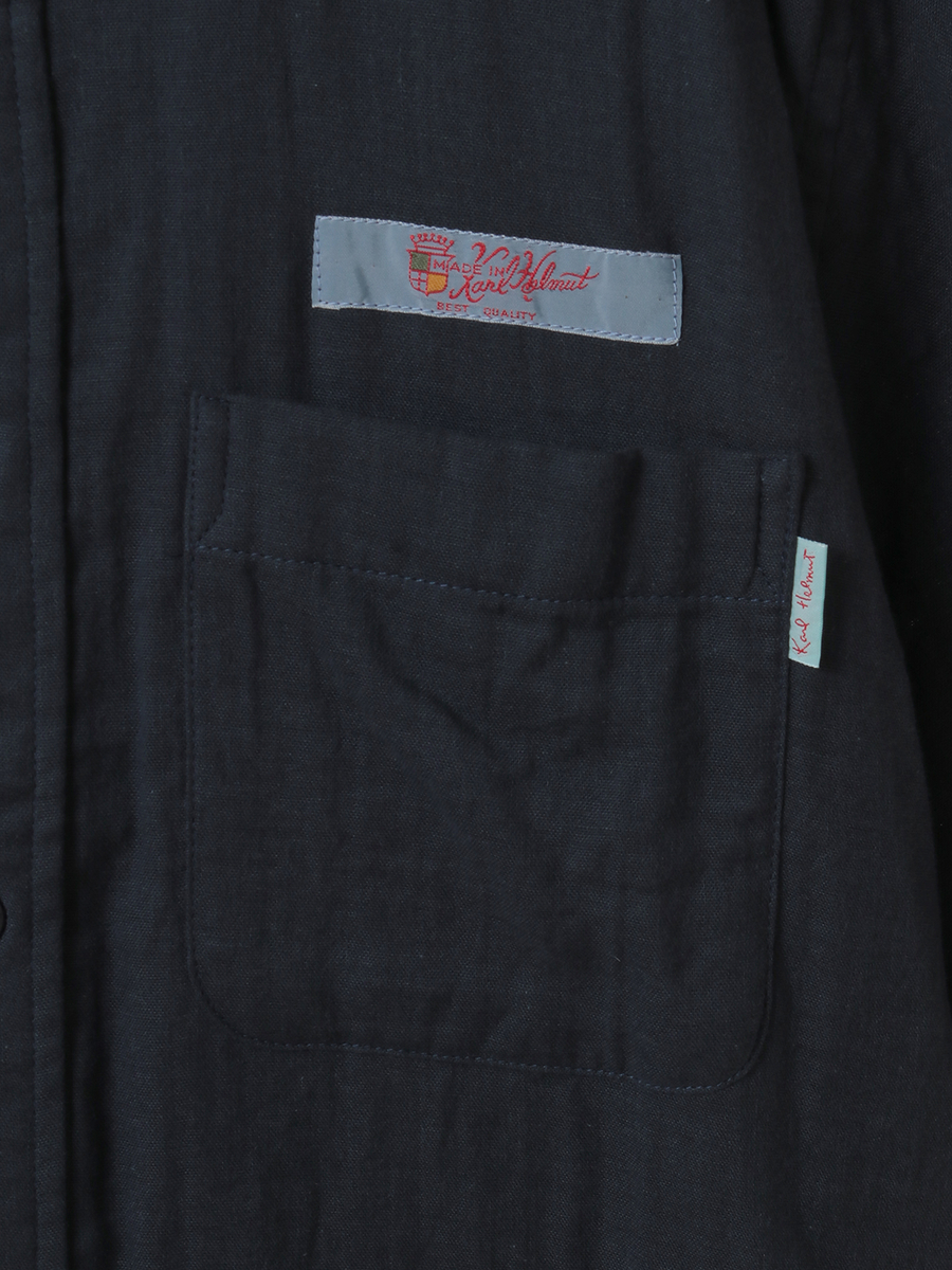 Karlくんのシルエットのなかに、さまざまなKarlくんのアートを敷き詰めた巨大アップリケを背中にあしらった後ろすがたがとっても可愛いシャツブラウス。アップリケを挟むようにロゴ刺繍を添えてアクセントに。
