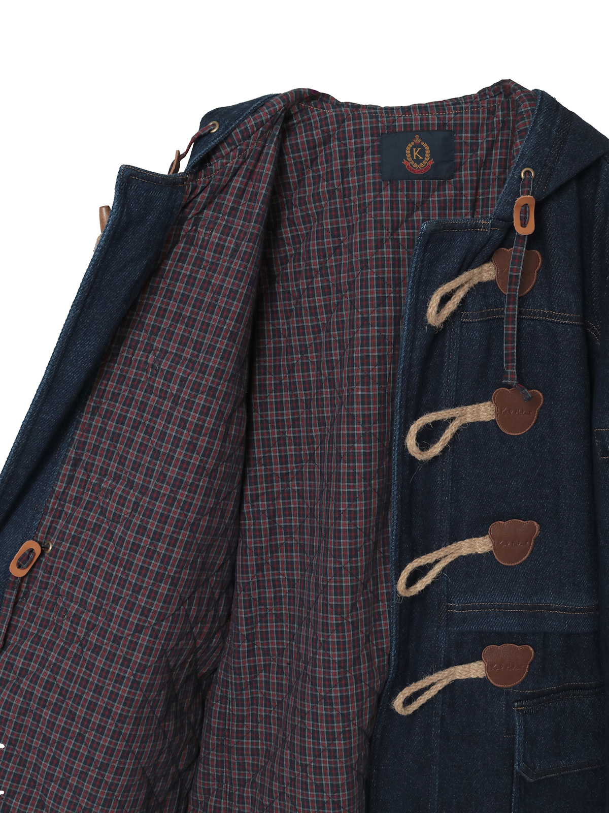 オリジナルで作製したクマシルエットを形取った革パッチがポイントのダッフルコート。