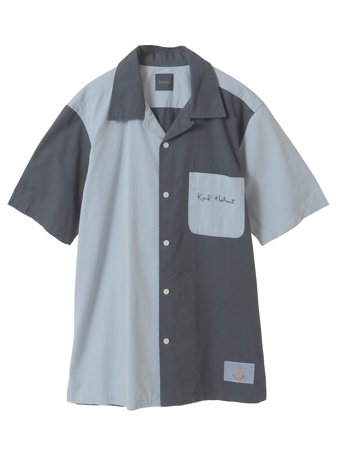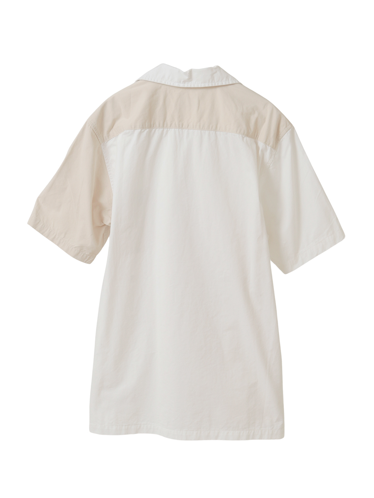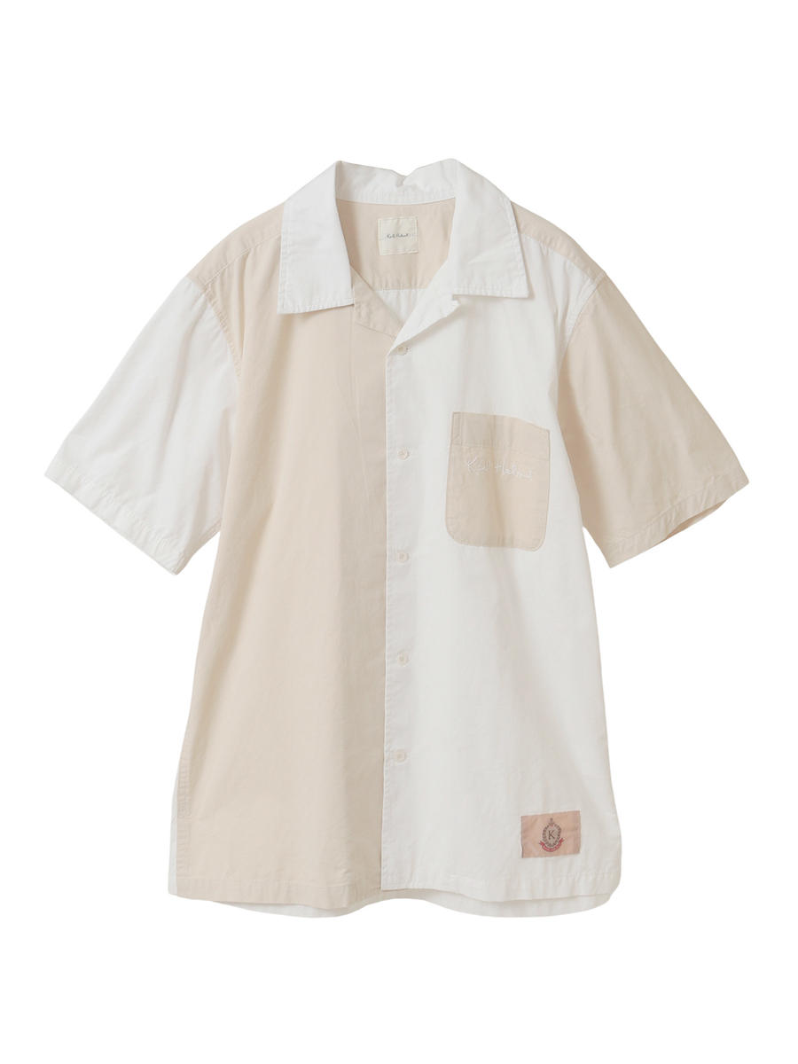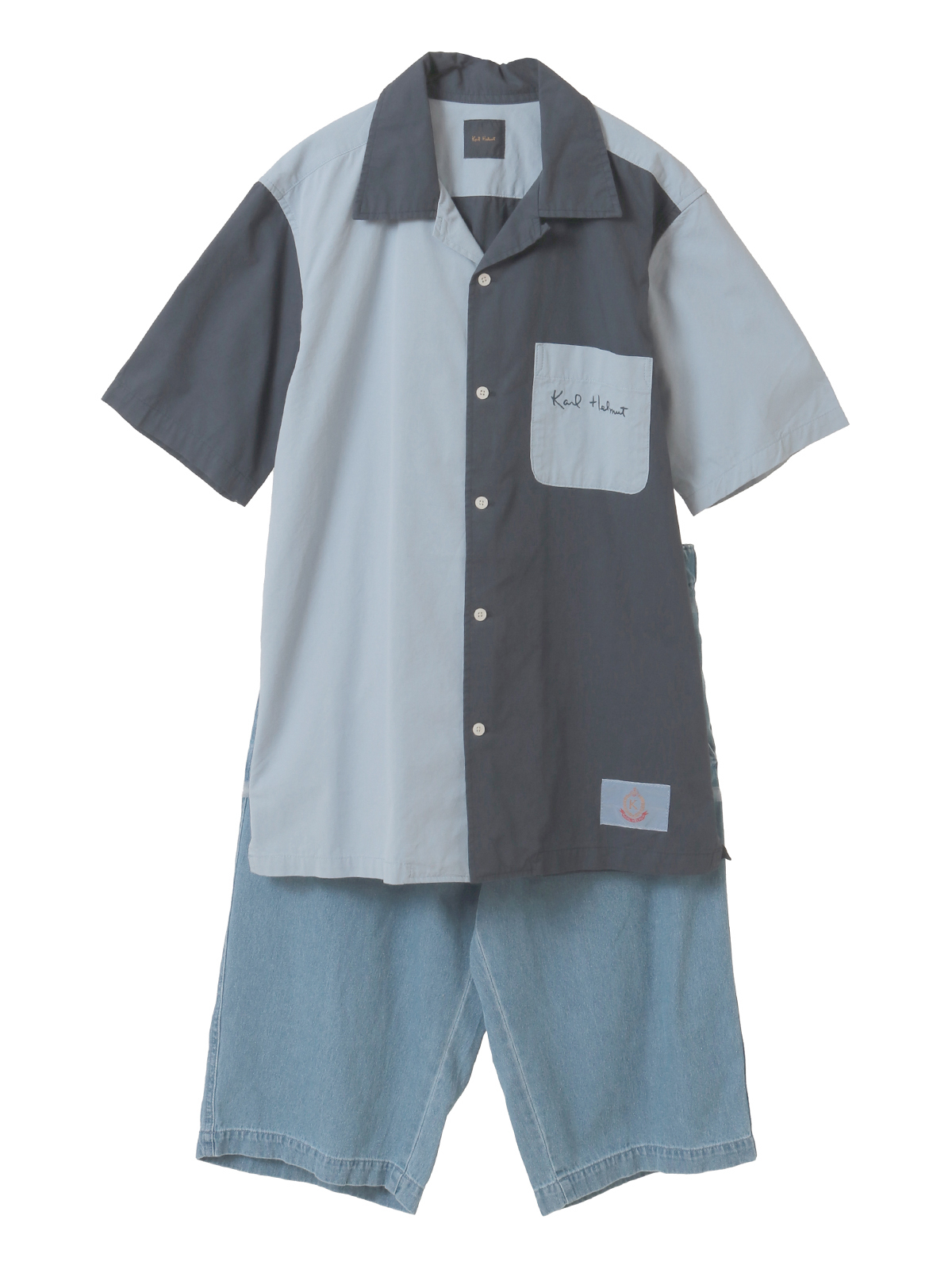 パーツごとに配色使いにして組み合わせたパッチワークのようなデザインがとても印象的、遊びごころあふれるシャツブラウスに、薄手デニムのハーフパンツを合わせた爽やかなセットアップに。