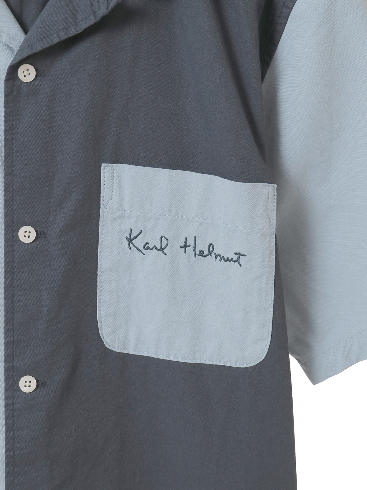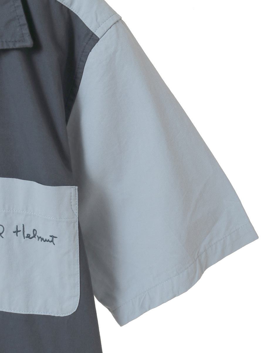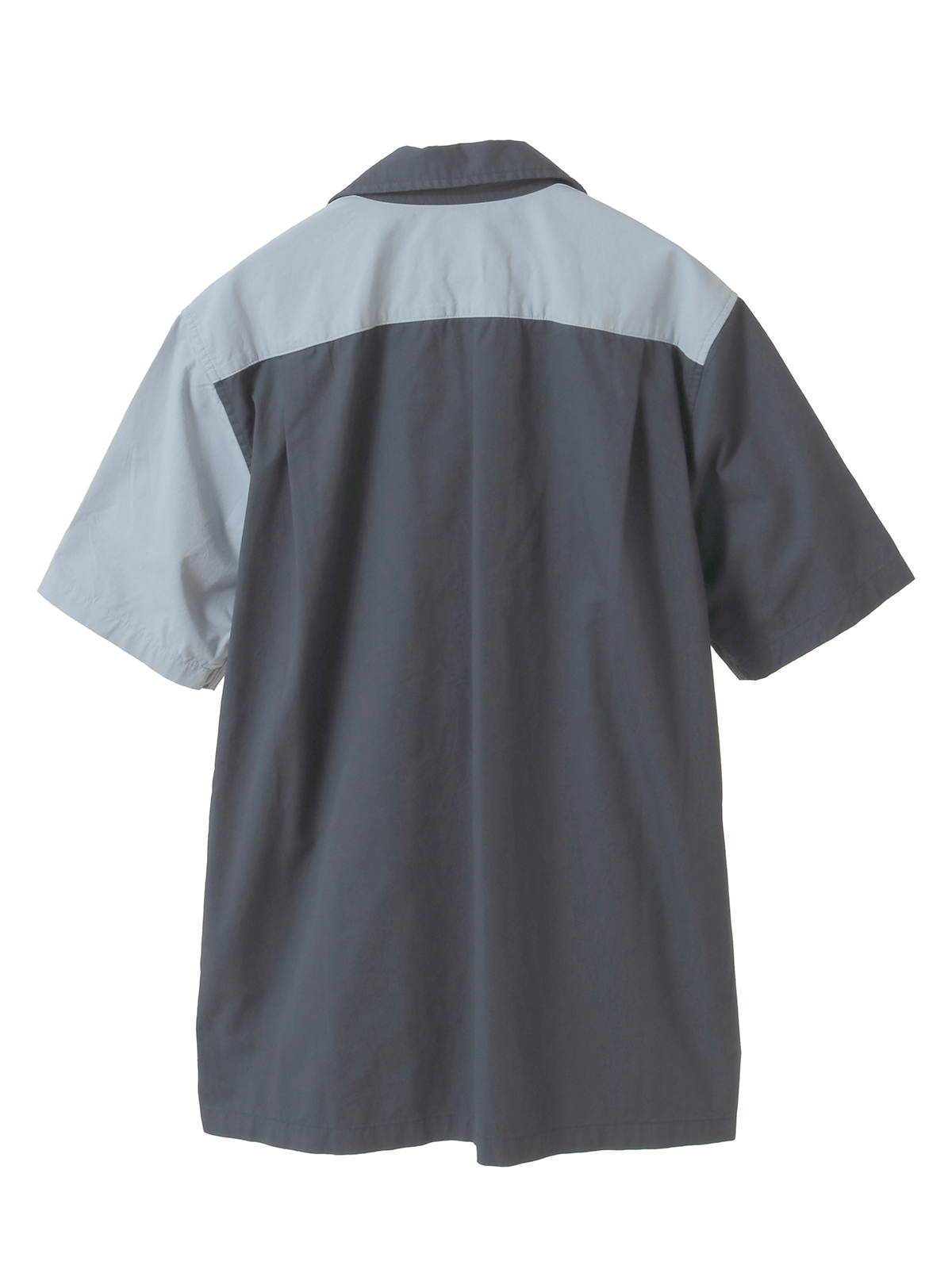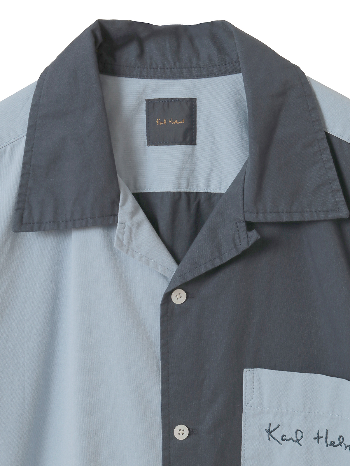 パーツごとに配色使いにして組み合わせたパッチワークのようなデザインがとても印象的、遊びごころあふれるシャツブラウスに、薄手デニムのハーフパンツを合わせた爽やかなセットアップに。