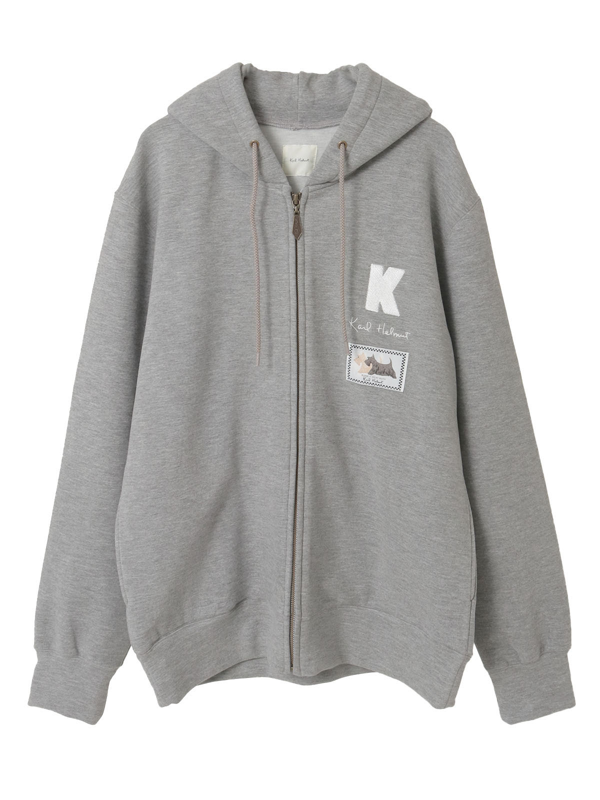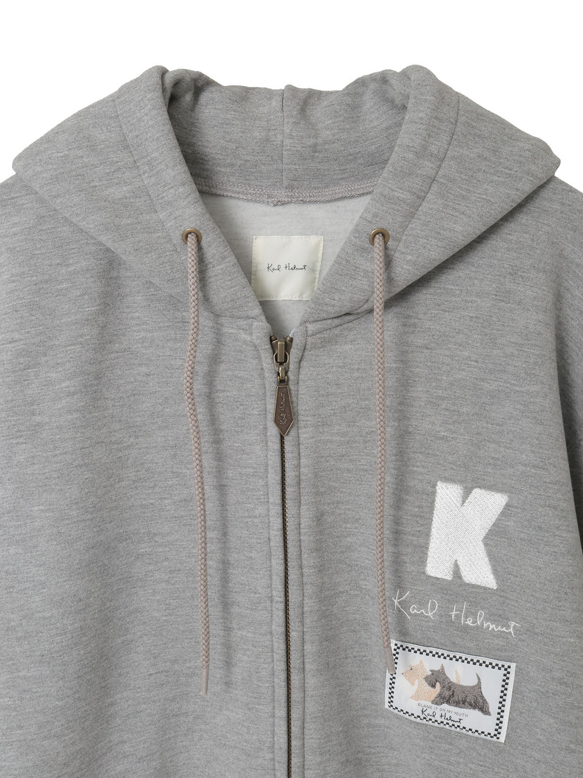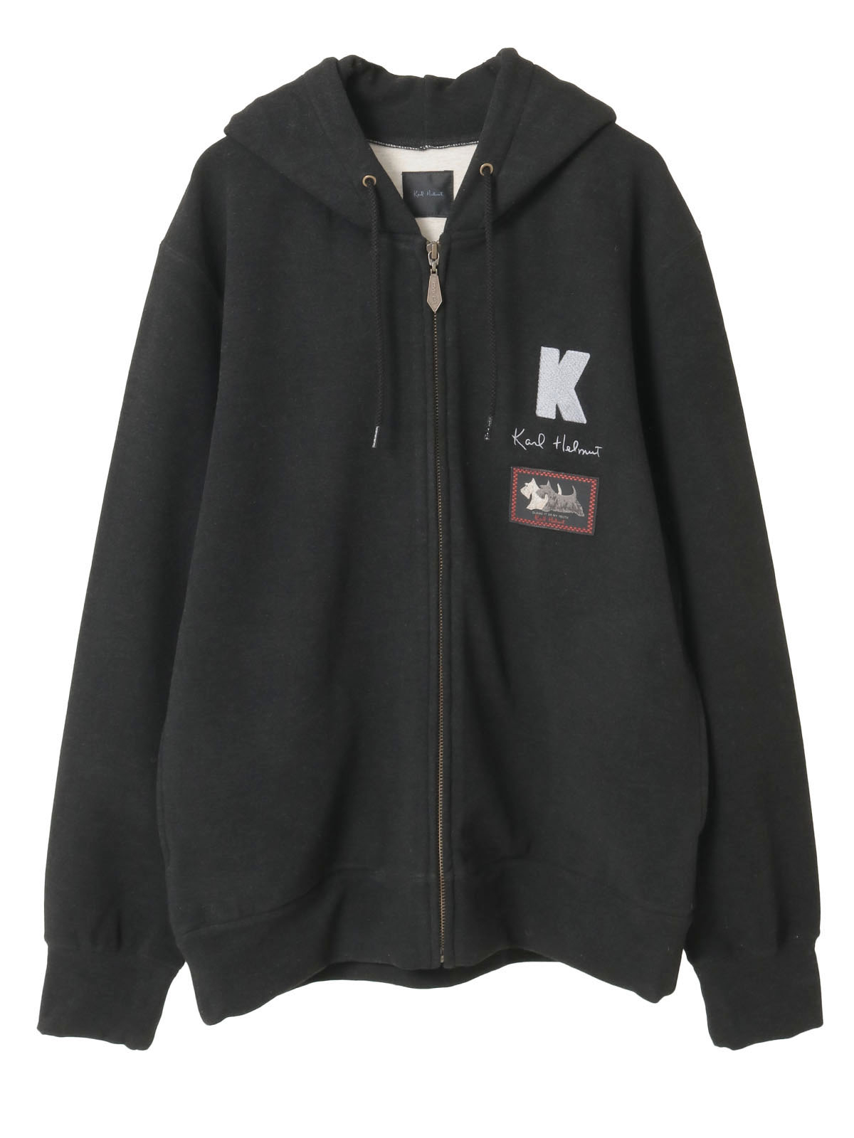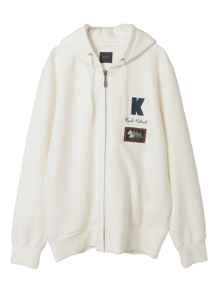 左胸にはKロゴのワンポイント刺繍を施して。その下にはさらにロゴ刺繍とテリアネームワッペンを添えて。