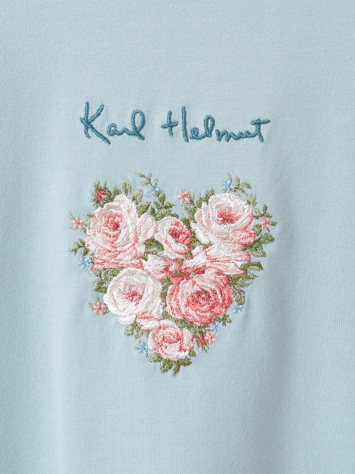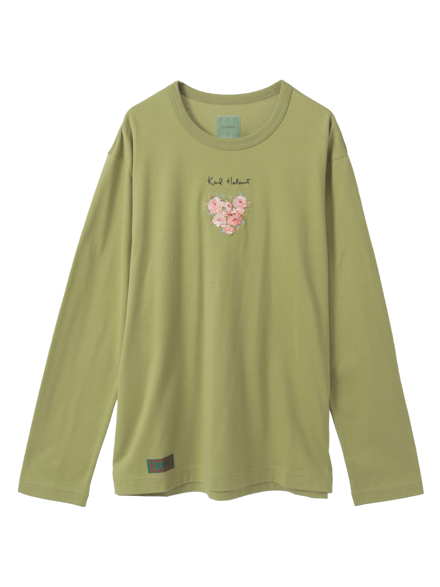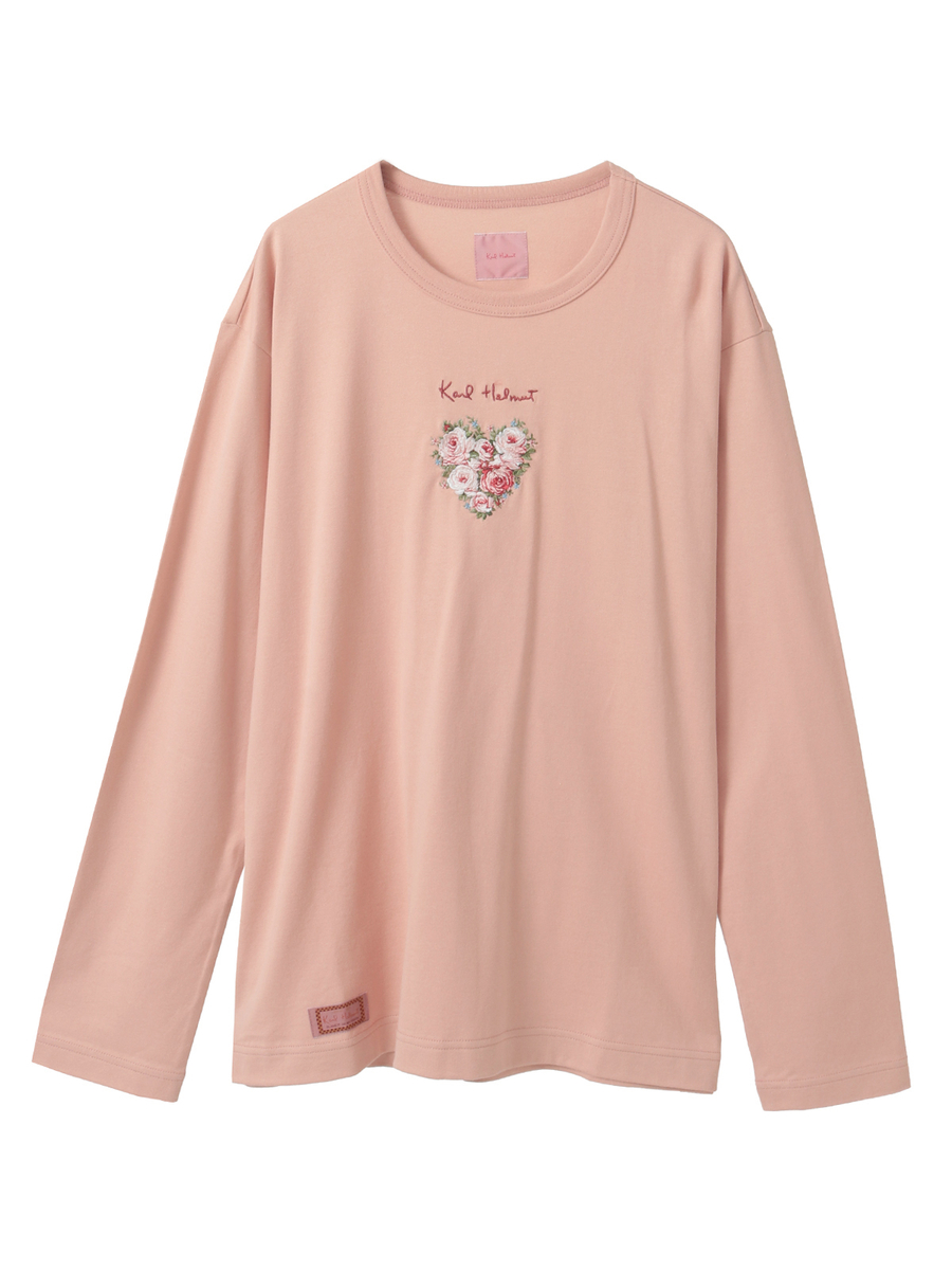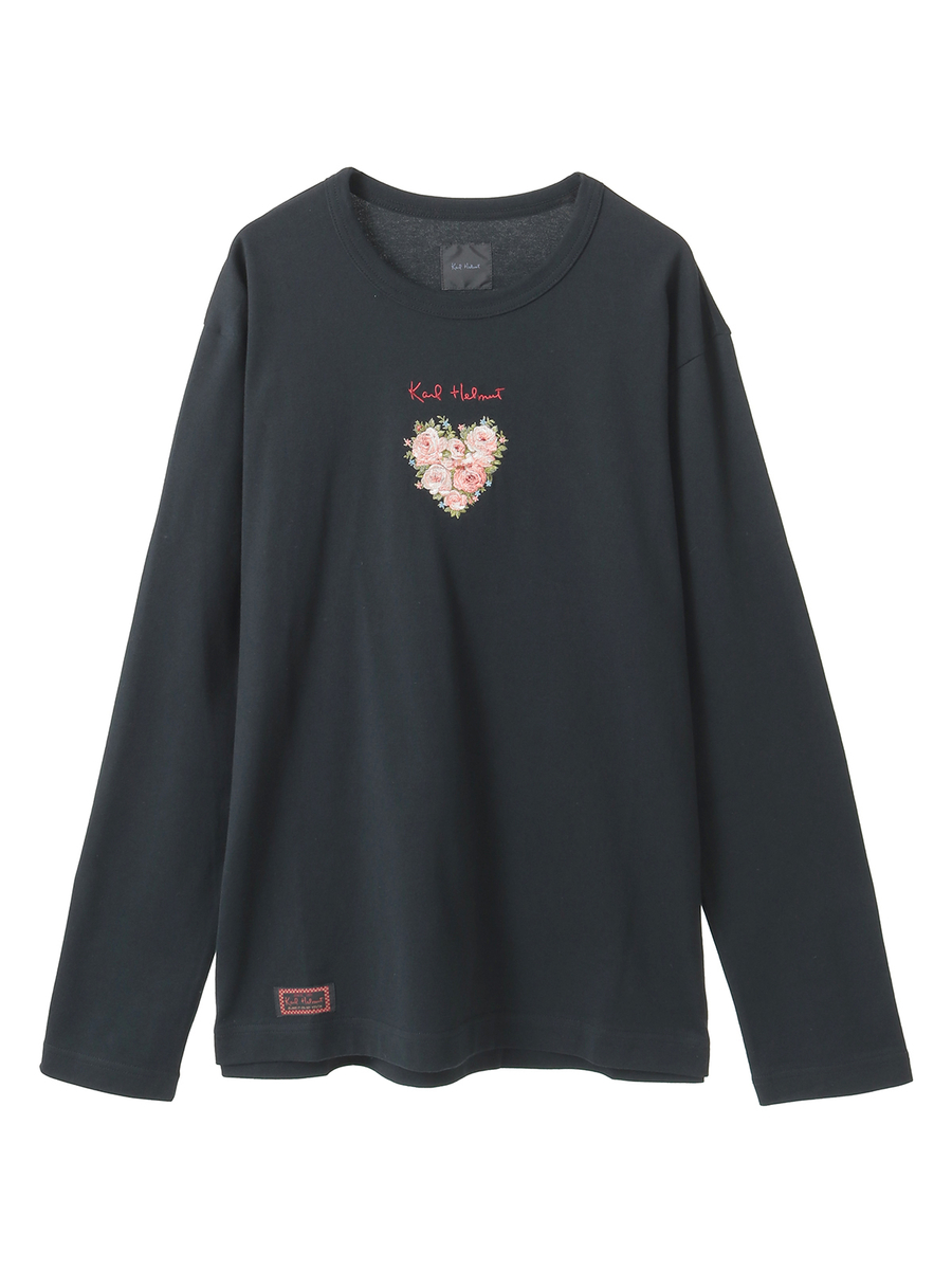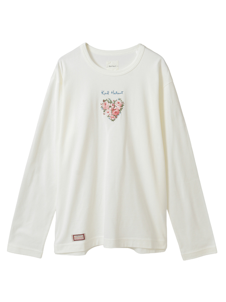 「小バラプリント」からハートに束ねたブーケのアートをそのままワンポイント刺繍にしたカットソー。