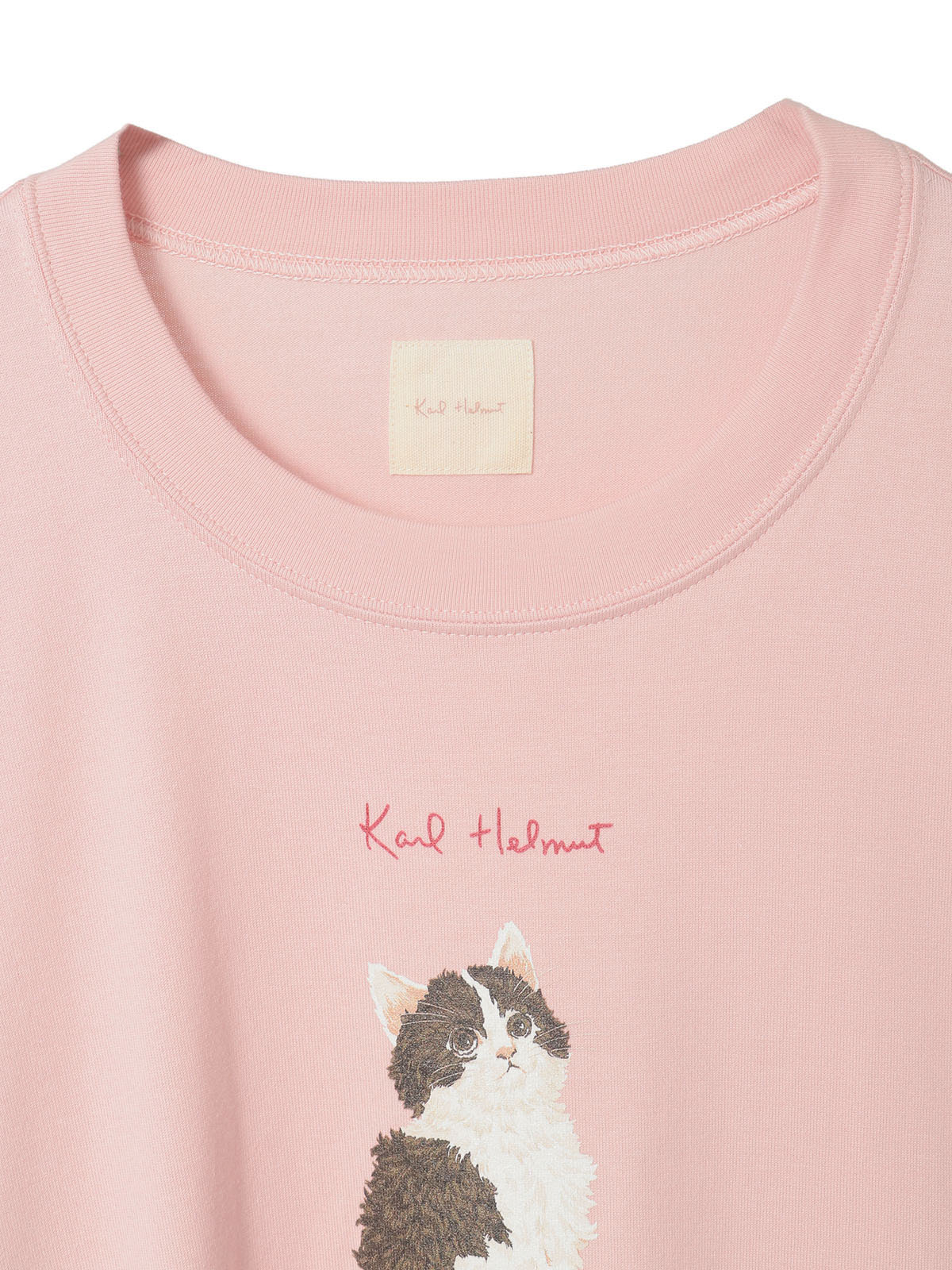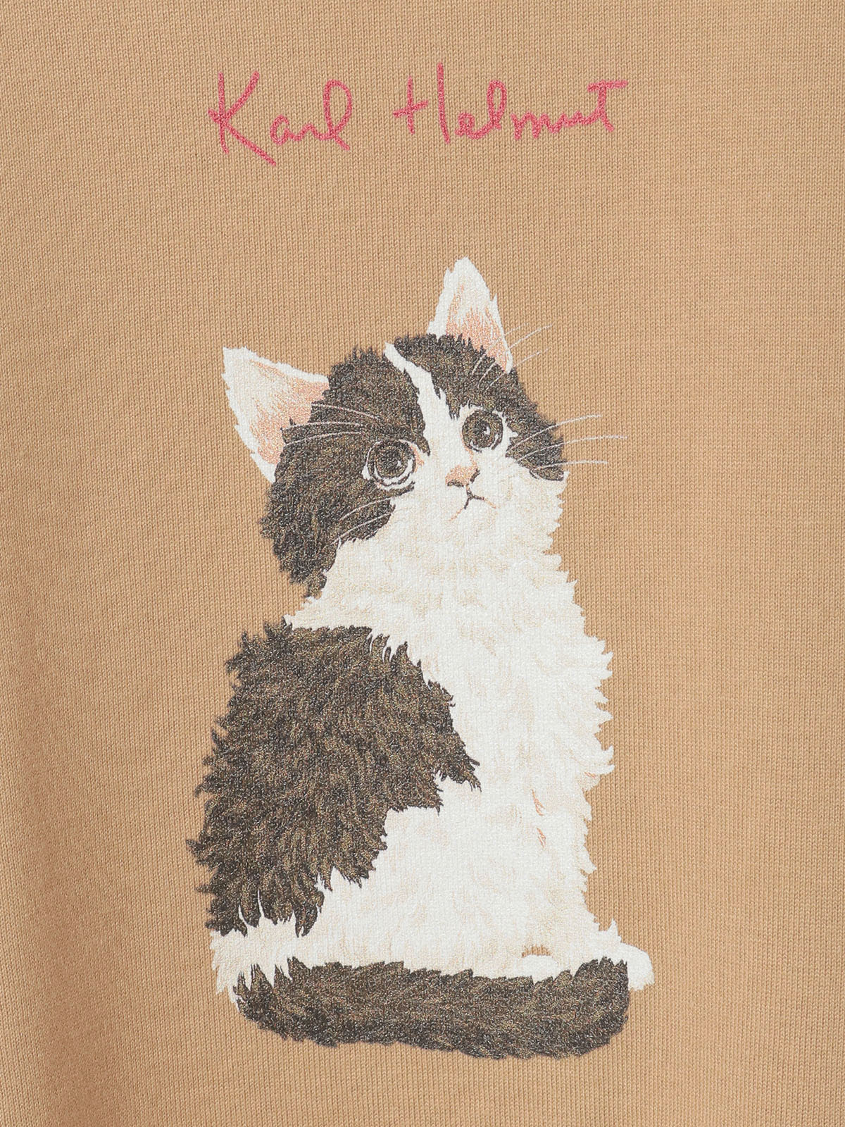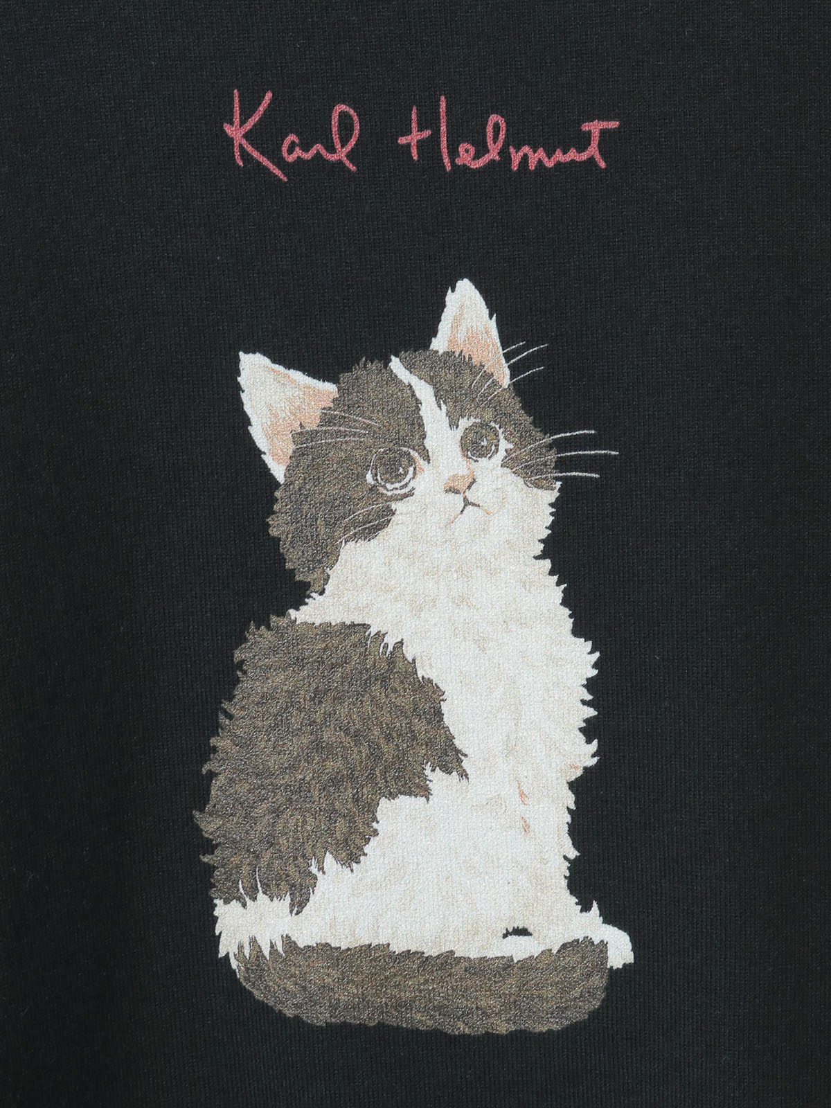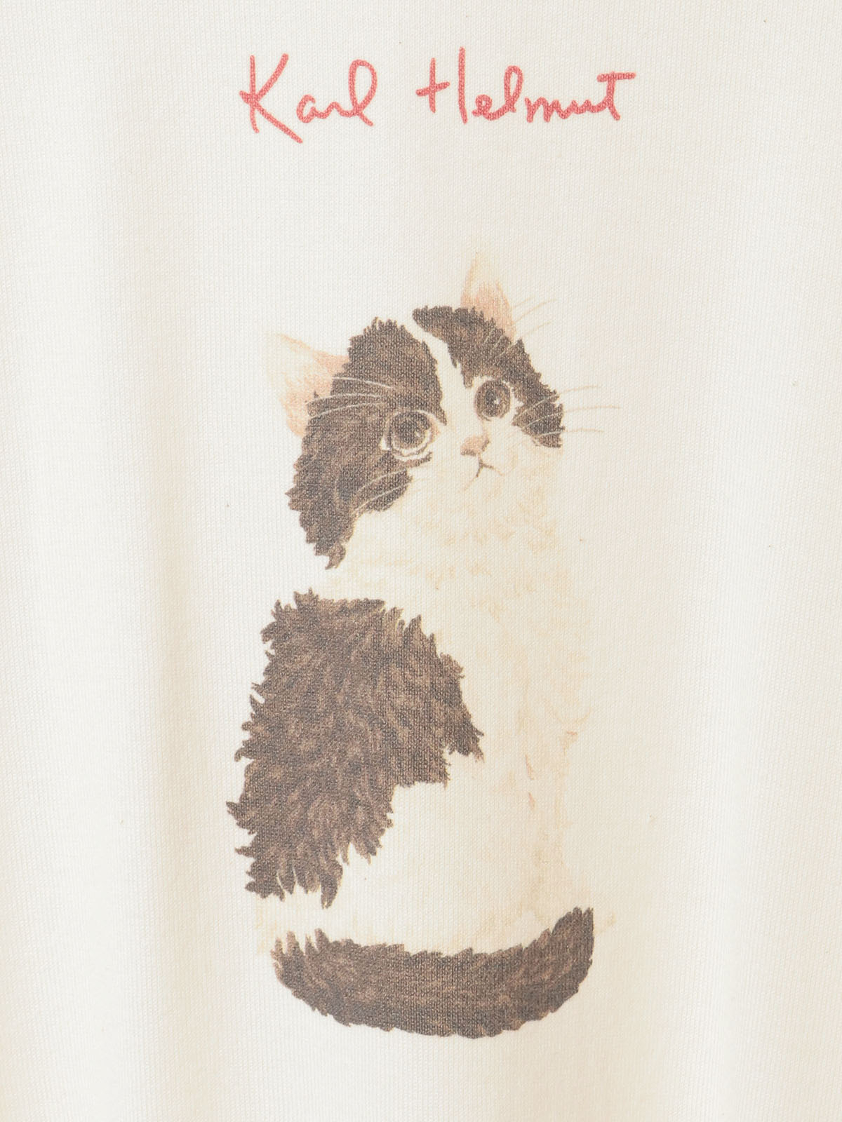 「猫プリント」から、あどけない表情が可愛らしい、上を見上げるネコちゃんをピックアップ、フロントにロゴとともにプリントした長袖カットソー。