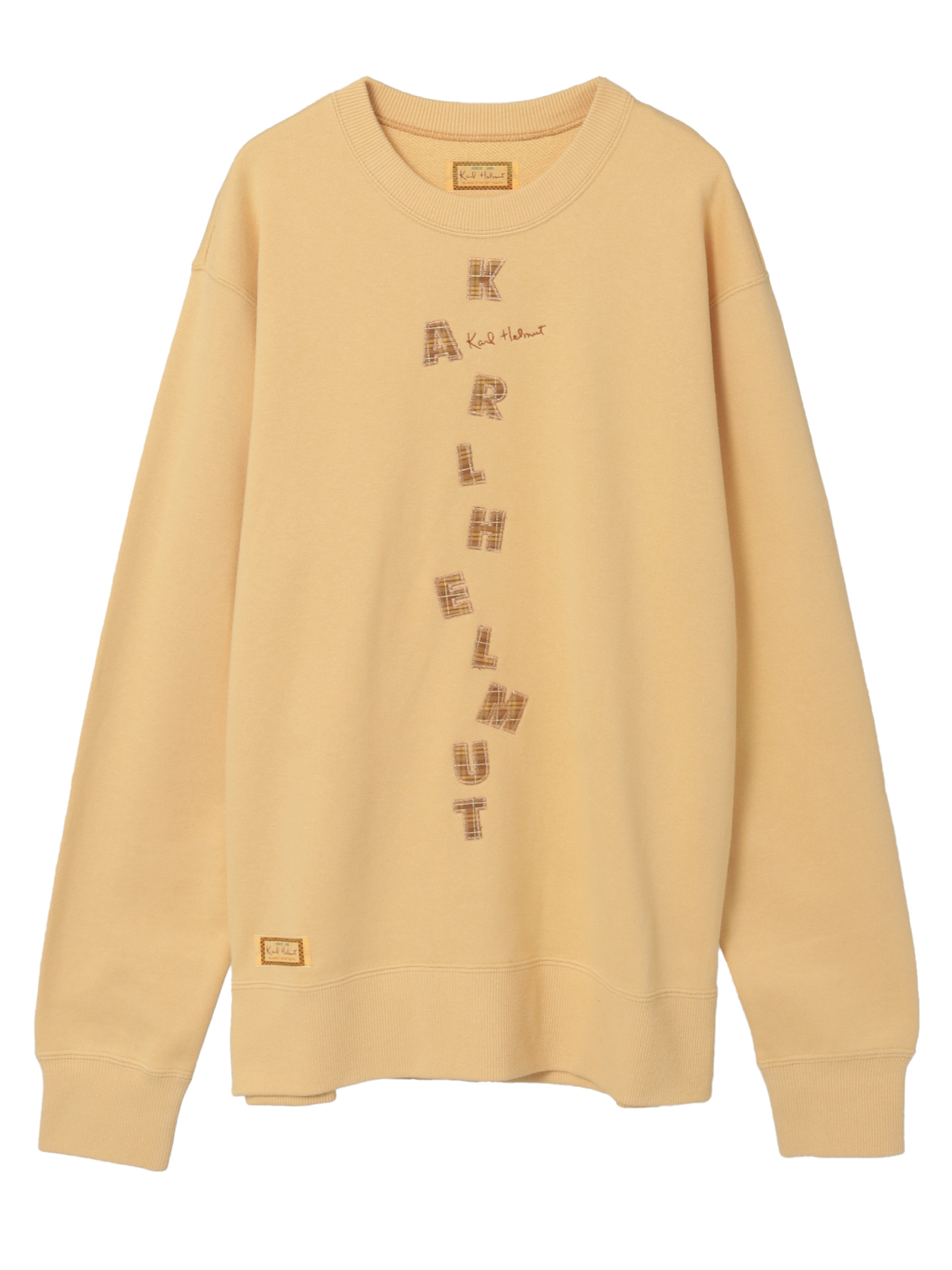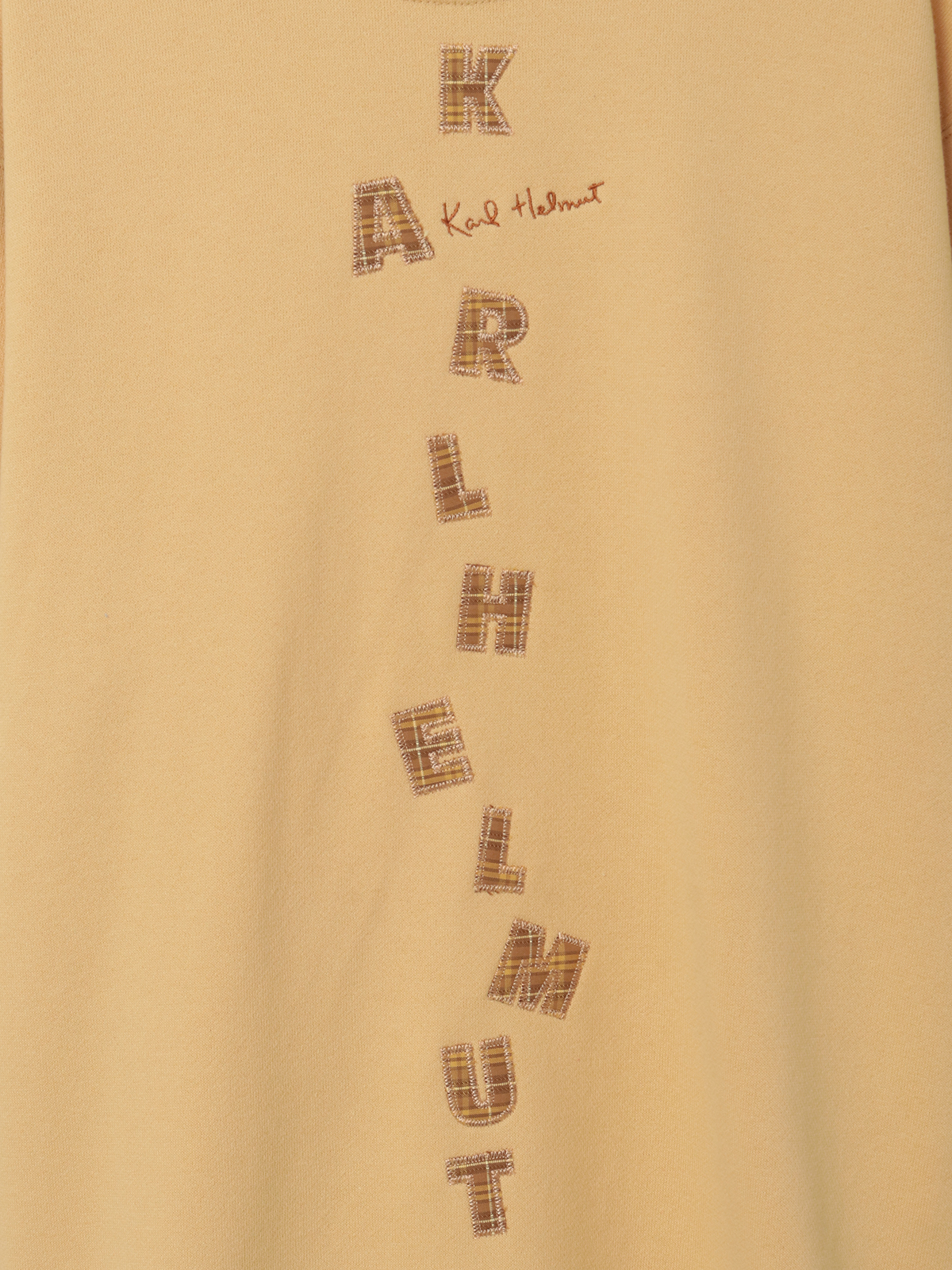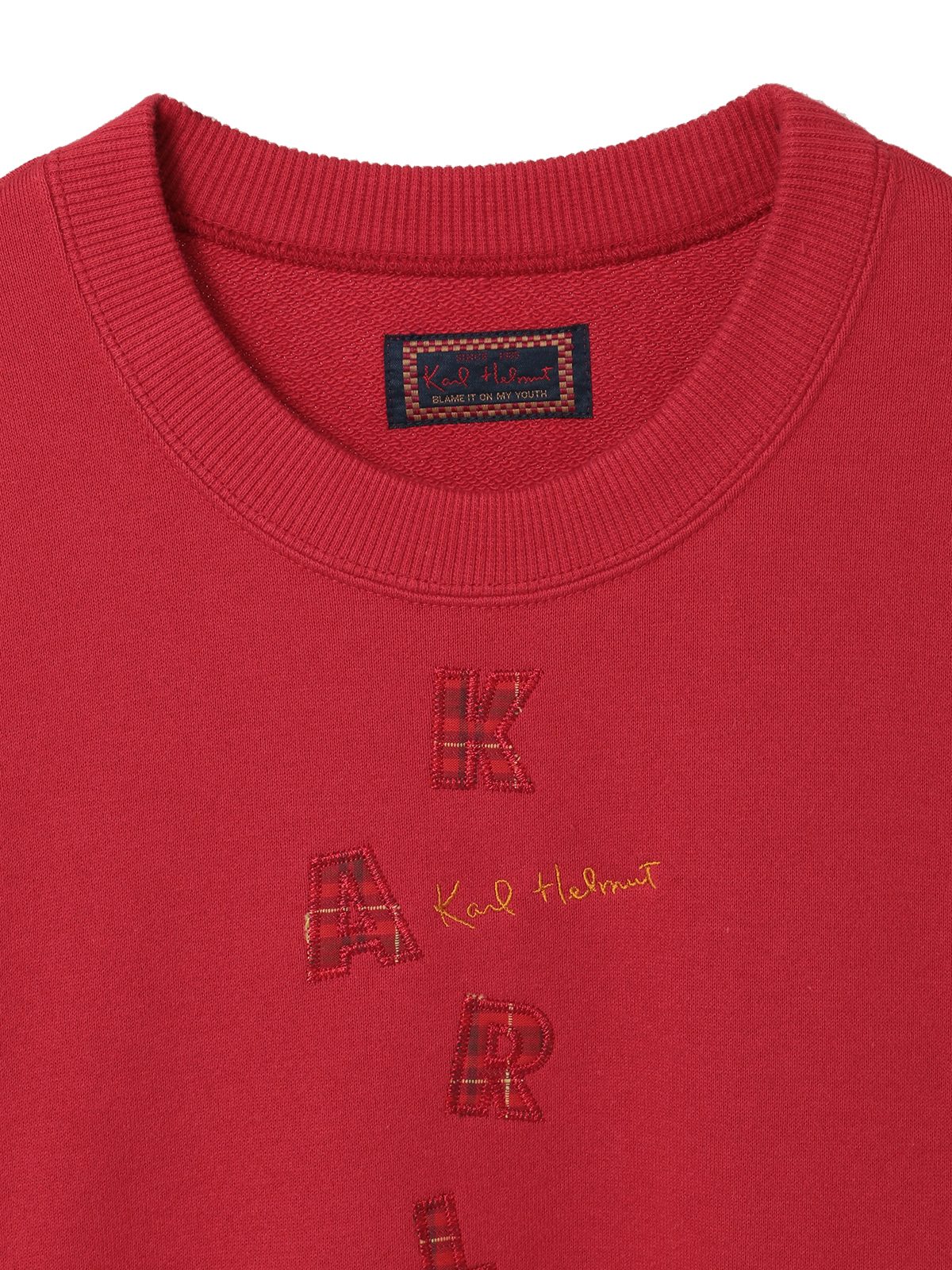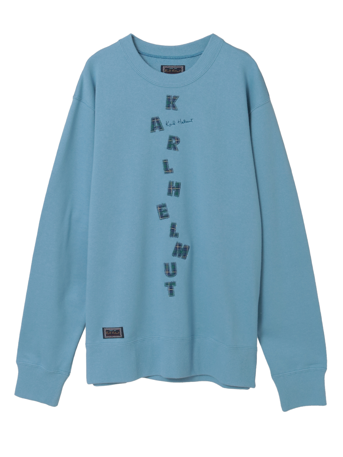 KARL HELMUTのイニシャルロゴを、オリジナルのコードチェックでそれぞれミニアップリケにしてあしらったトレーナー。