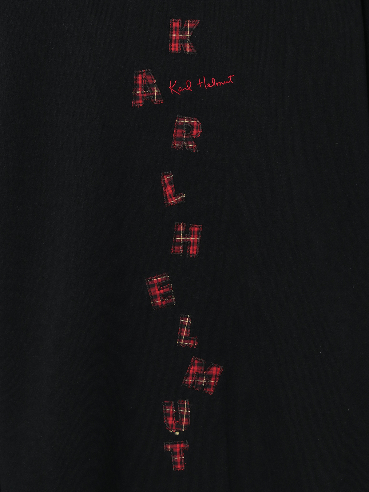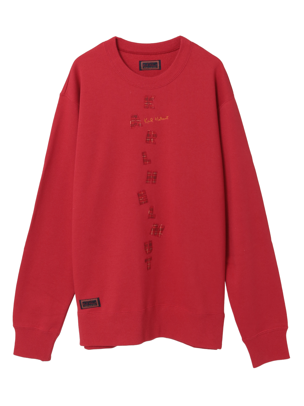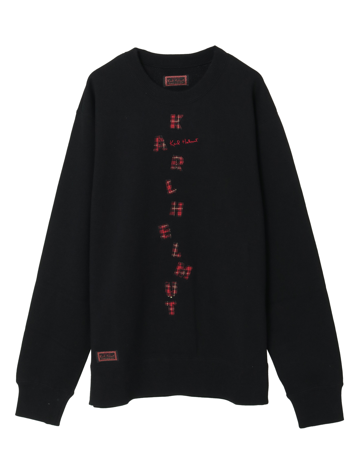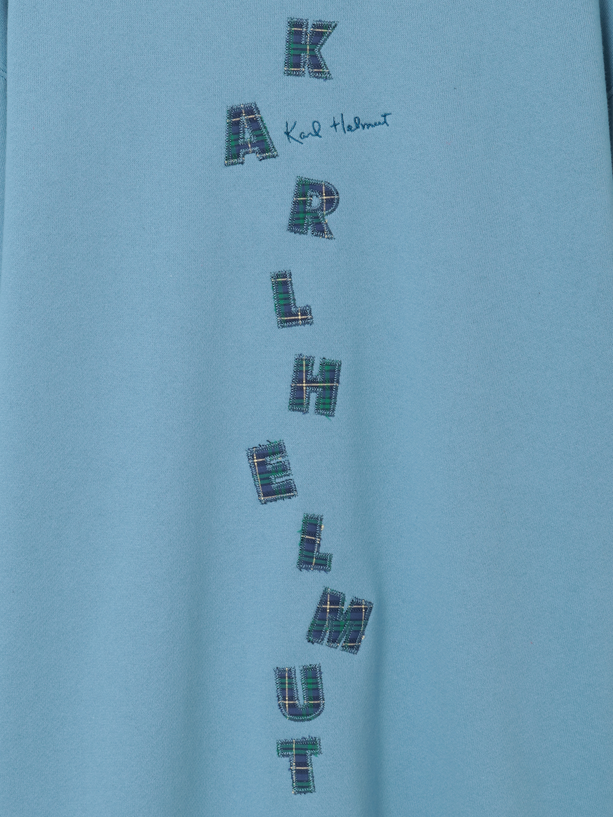 KARL HELMUTのイニシャルロゴを、オリジナルのコードチェックでそれぞれミニアップリケにしてあしらったトレーナー。