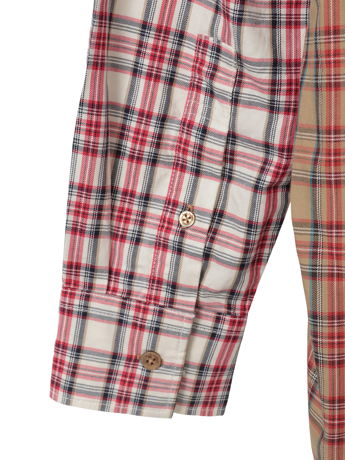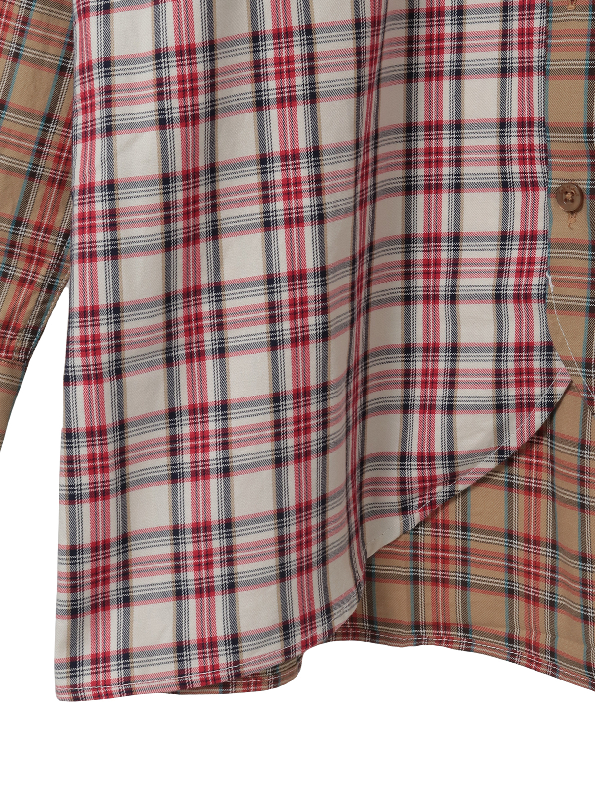 オリジナルタータンチェックを2色、パーツごとに組み合わせたパッチワーク風のデザインが楽しめるシャツブラウス。