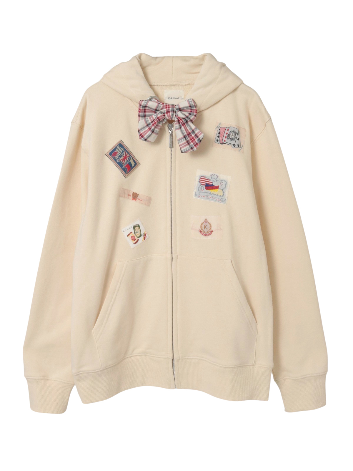 フロントに、ロゴをあしらったネームワッペンを中心に、トランプネームやエンブレムネーム、ビール缶ネームなど、さまざまなカールヘルムらしいネームワッペンをあしらったパーカー。