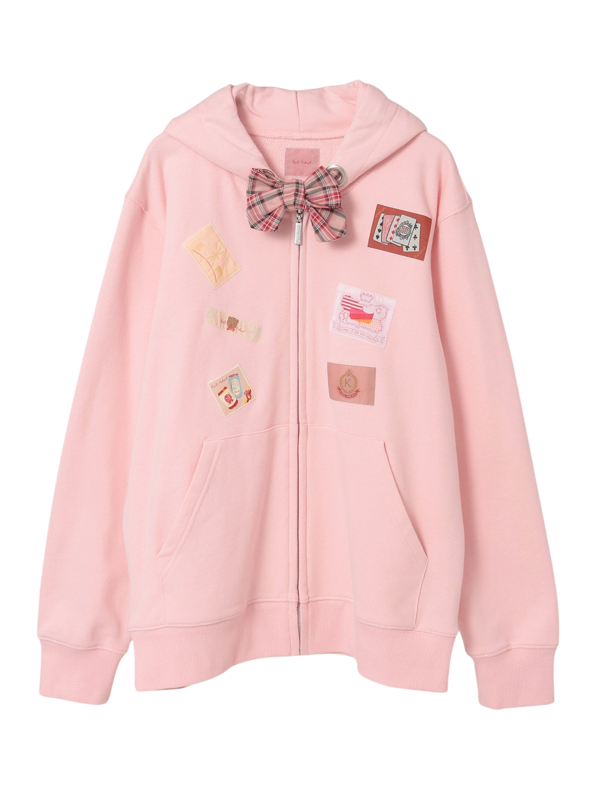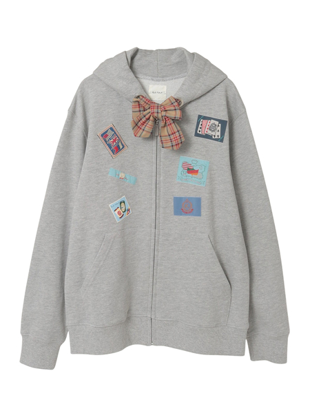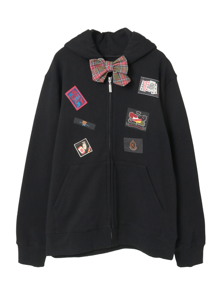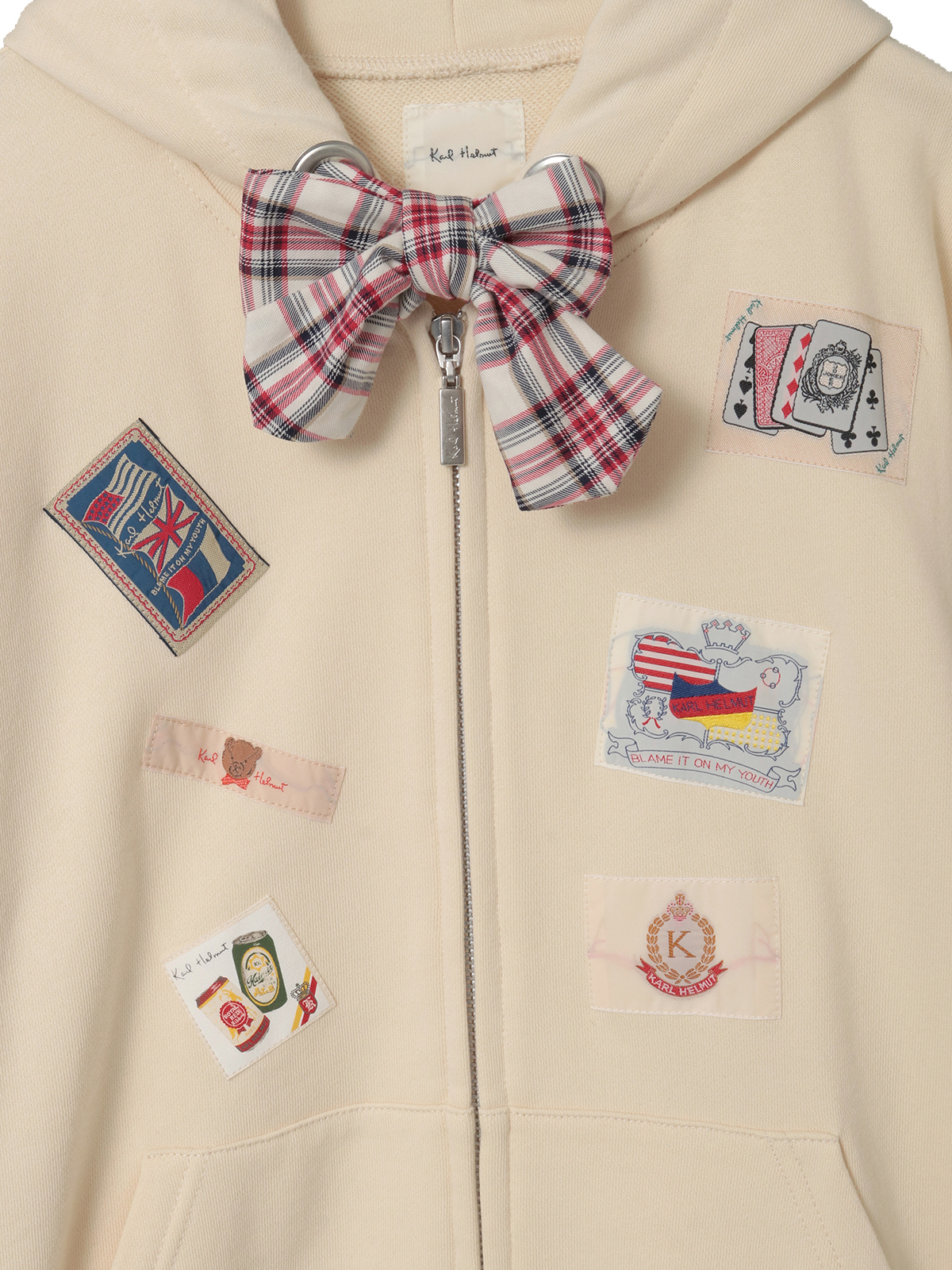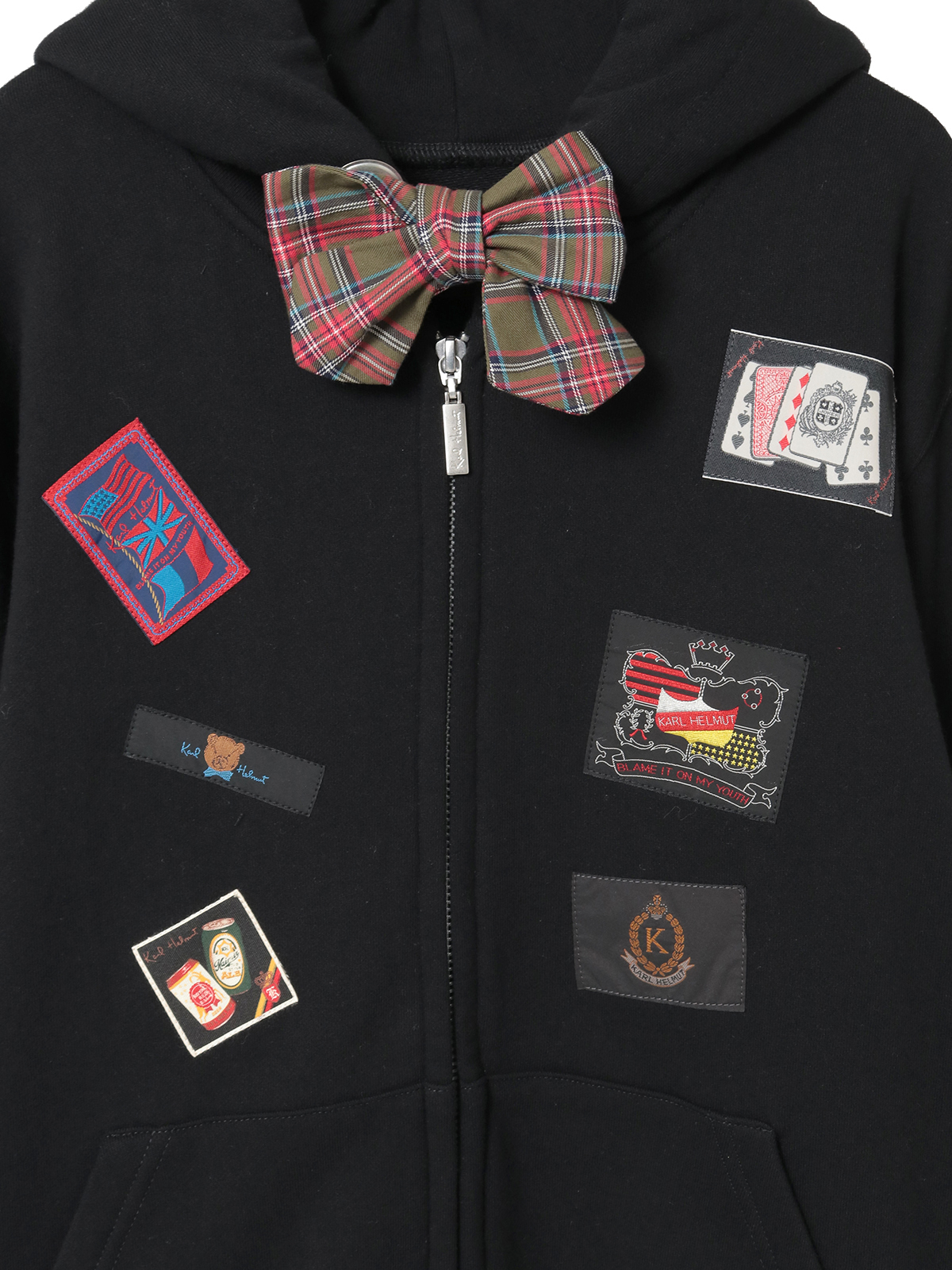 フロントに、ロゴをあしらったネームワッペンを中心に、トランプネームやエンブレムネーム、ビール缶ネームなど、さまざまなカールヘルムらしいネームワッペンをあしらったパーカー。