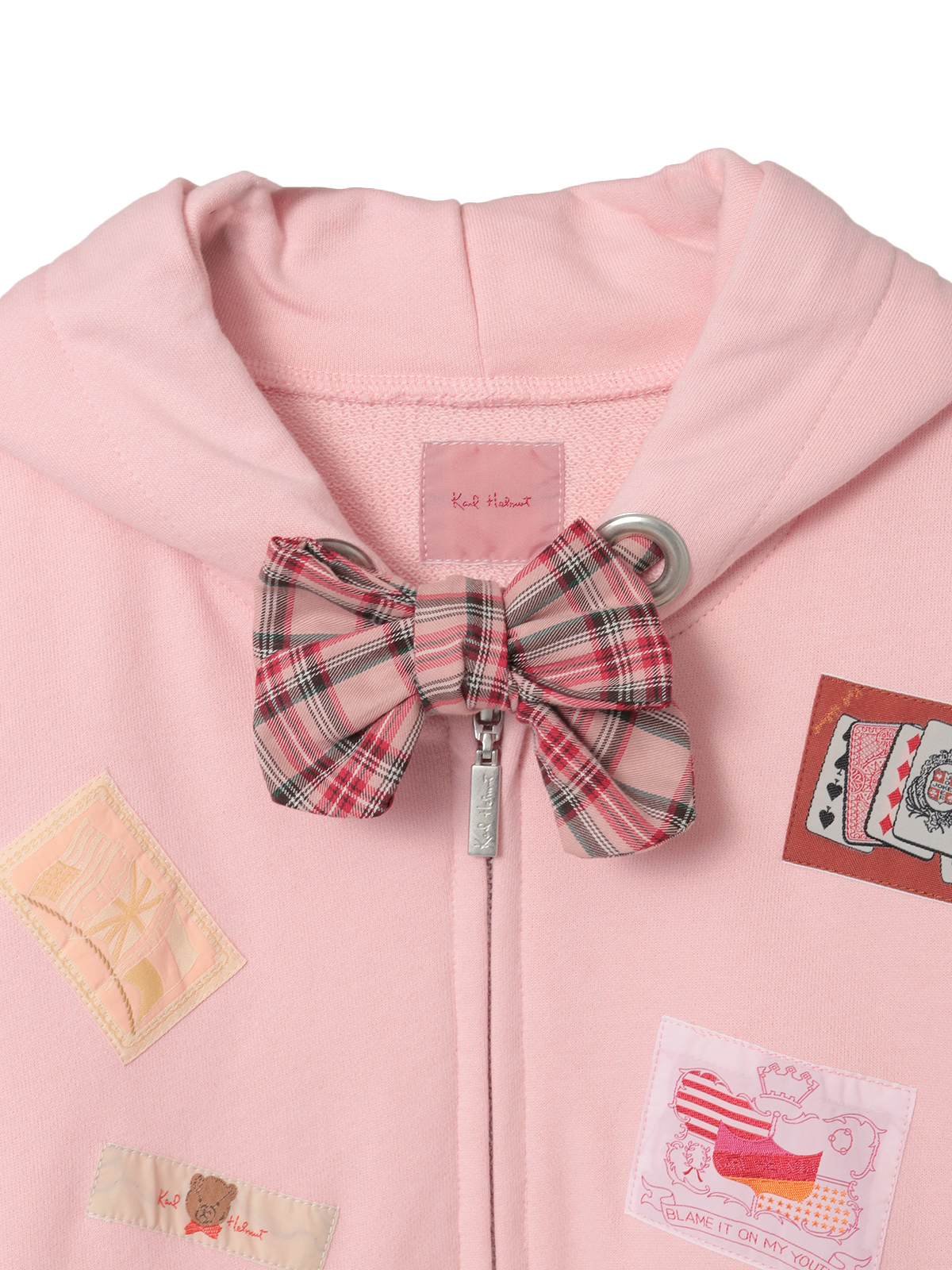 フードの紐が普通のスピンドルではなく、フロントで結ぶとオリジナルタータンチェックのリボンタイになるユニークなデザイン。