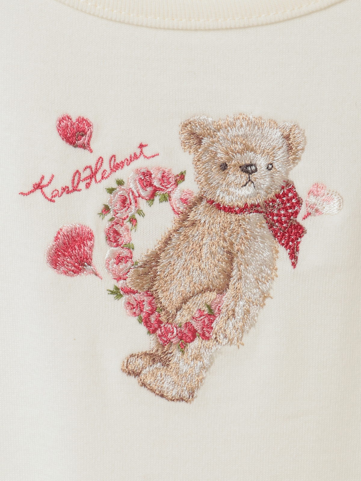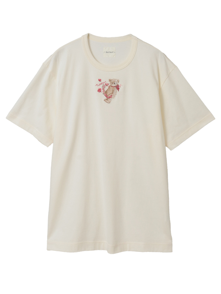 「テディローズプリント」に描かれた、幸せなローズ色に輝く薔薇の花たちと、穏やかな陽だまりのように優しく微笑むテディベアをモチーフに、フロントにワンポイント刺繍を施したTシャツ。