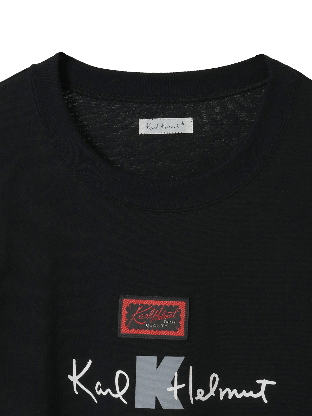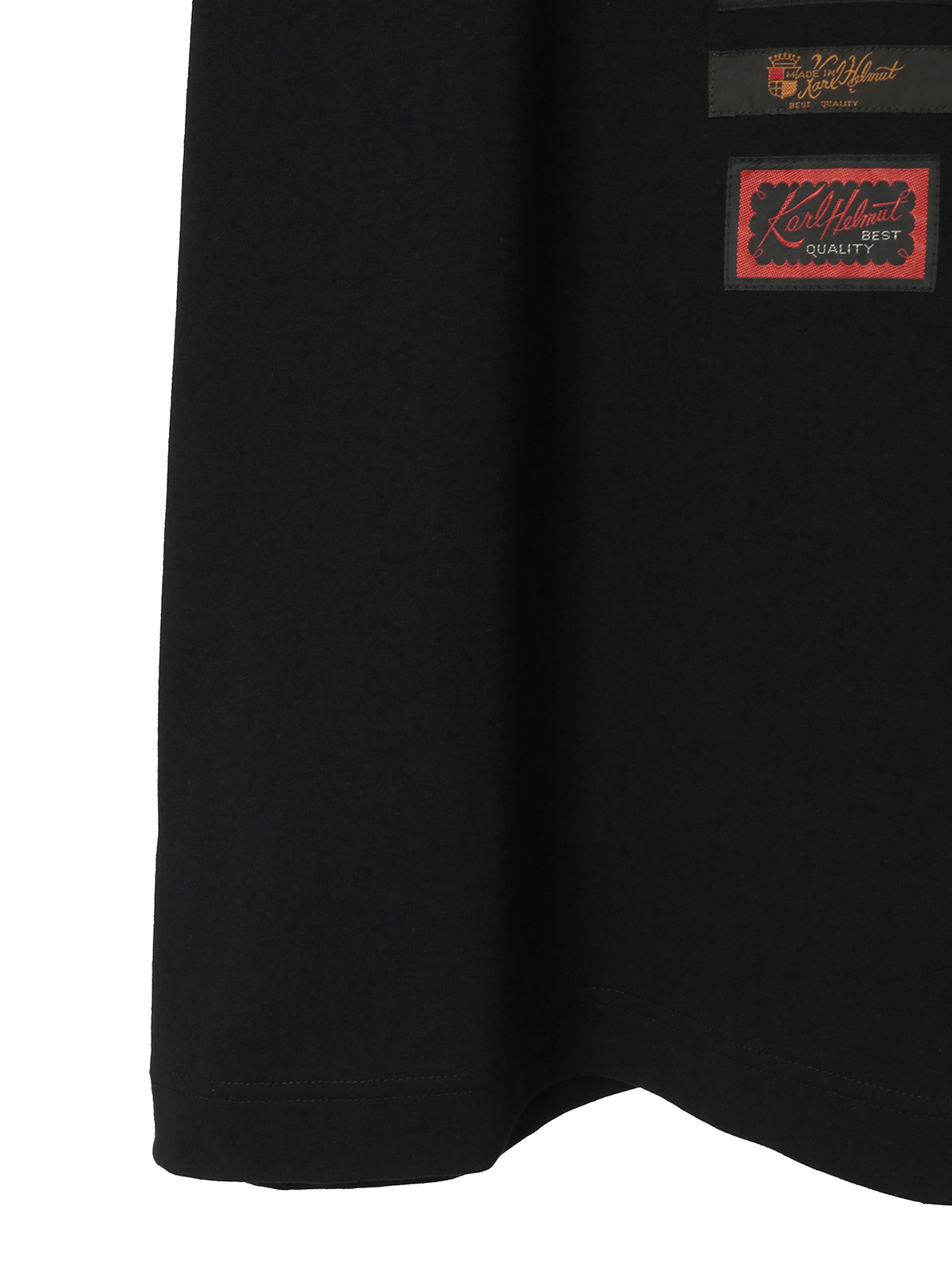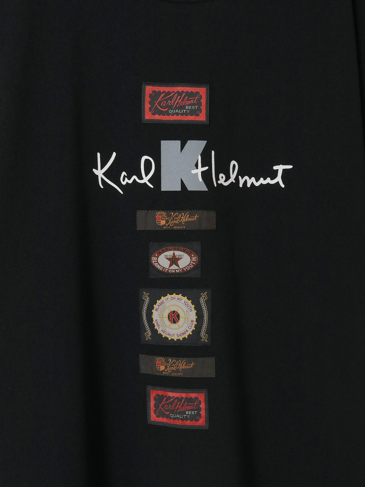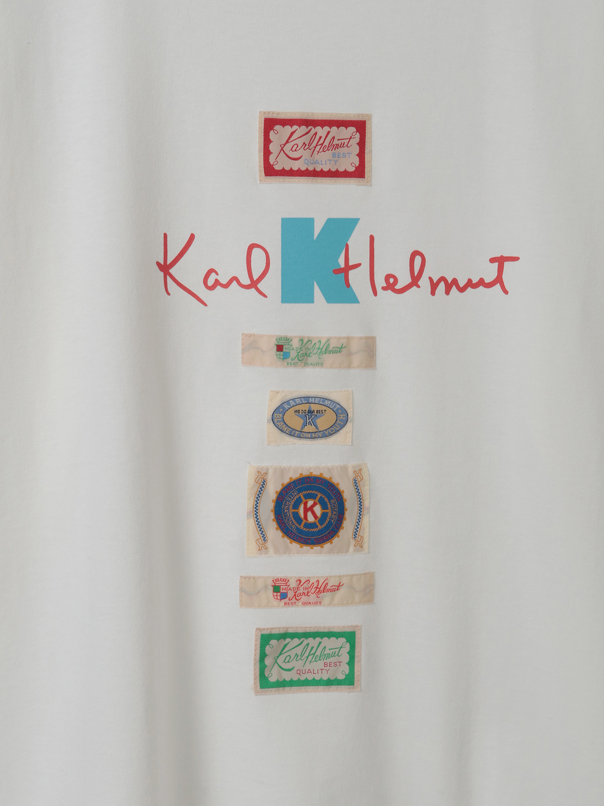 Karl Helmutのロゴプリントに、Kロゴプリント、そしてロゴをモチーフにした4種のネームワッペンを色違い含めて6個、縦のラインに並べたデザインがにぎやかなTシャツ。