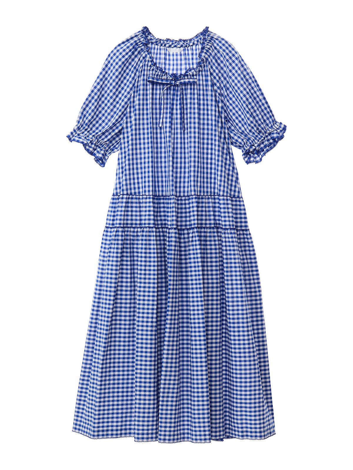 軽めのパフスリーブに、ウエストあたりから切り替えの入ったティアードタイプ。ラグランのデザインでゆったりとしたシルエットはさらりと着やすく人気のデザインに。首まわりには軽くゴムが入っていて首もとのリボンで調節もできます。