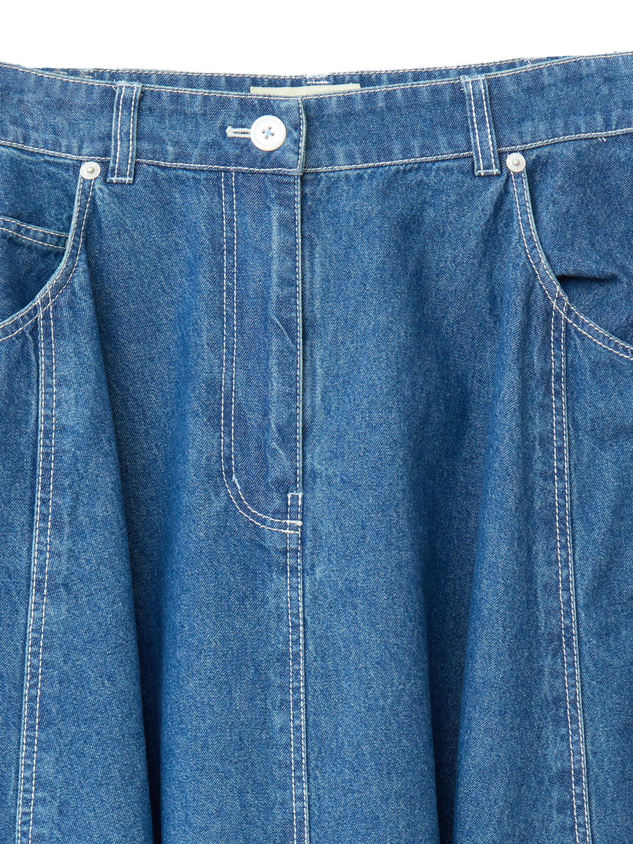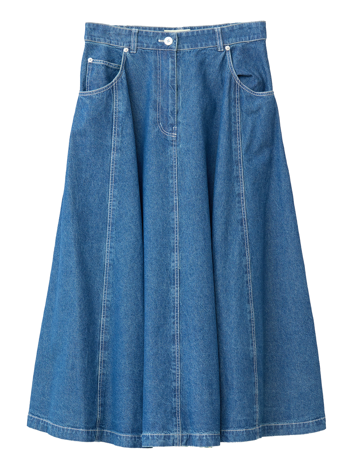 フロントはシンプルなデニムのロングスカートで、縦のラインに剥ぎ合わせたフレアなシルエットが大人っぽい雰囲気に。前と後ろで雰囲気が異なる遊びごころ溢れるアイテムに。