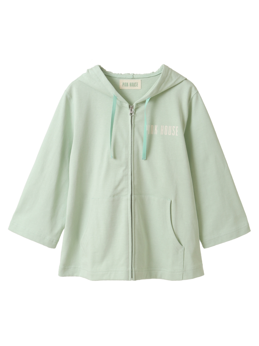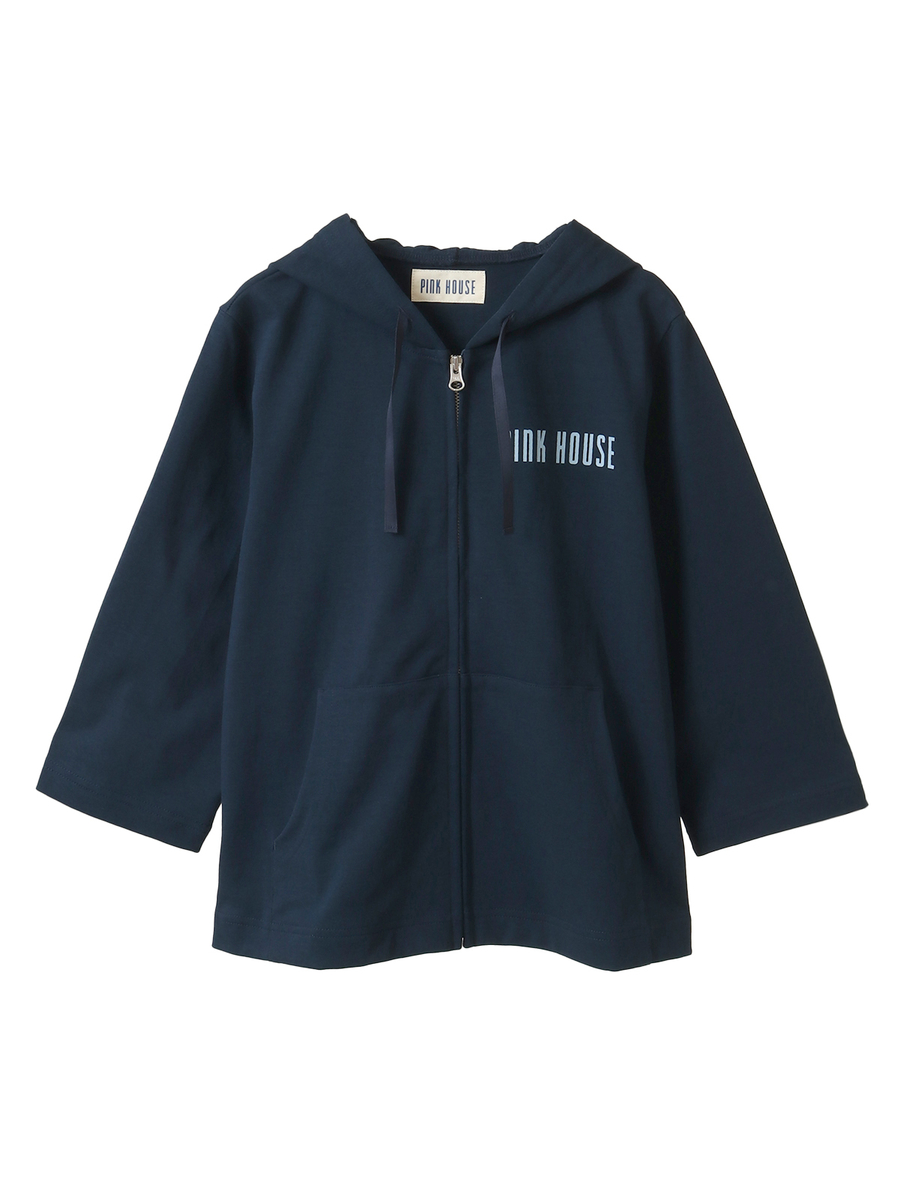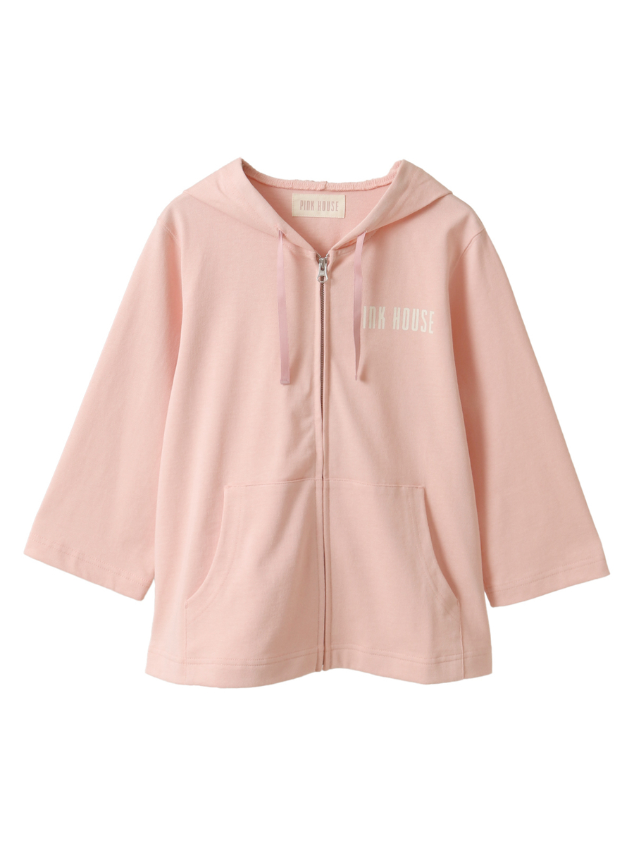 背中にあしらったPINK HOUSEのロゴアップリケがあじさいカラーになっている後ろすがたがとっても可愛いパーカー。