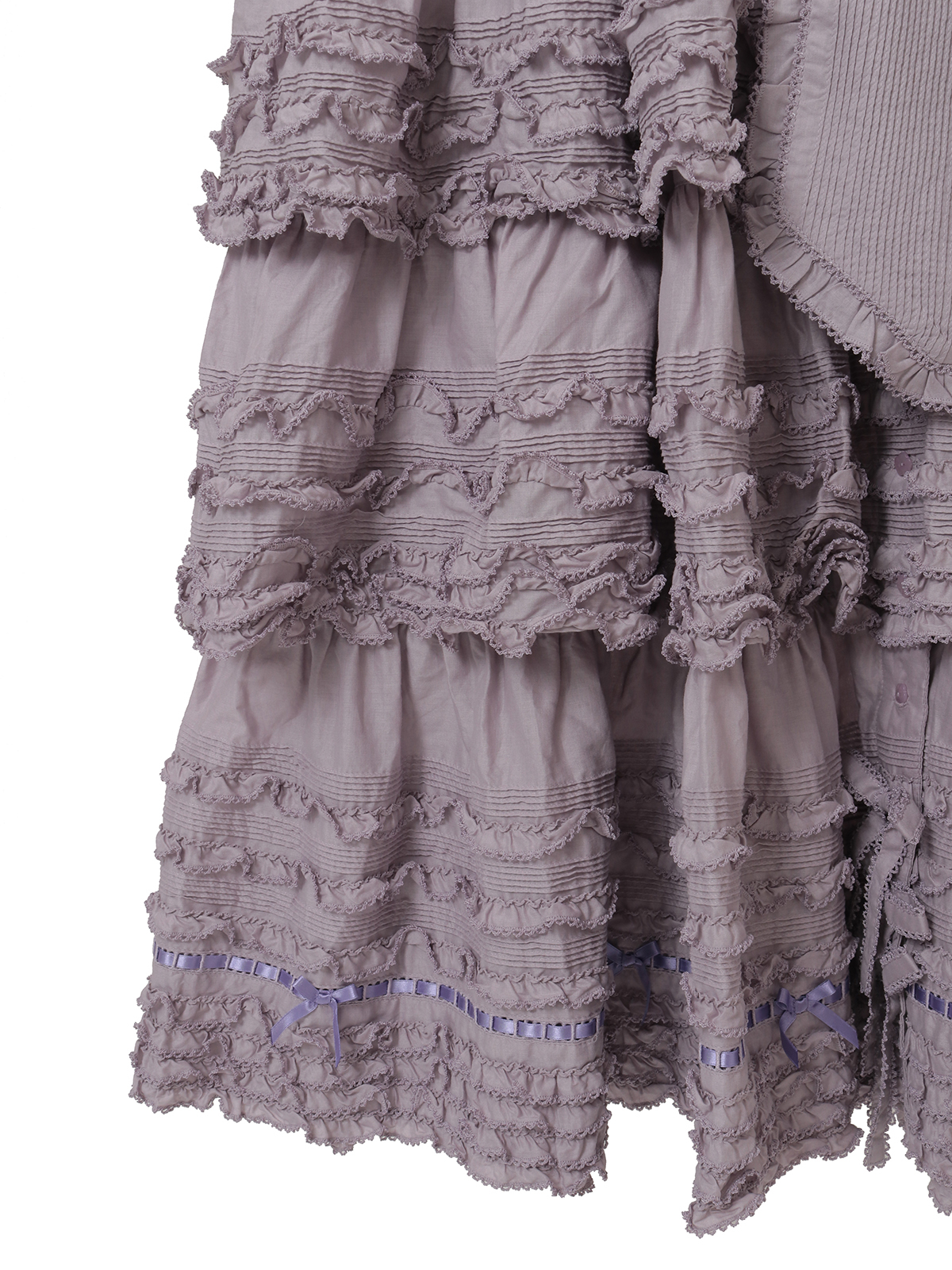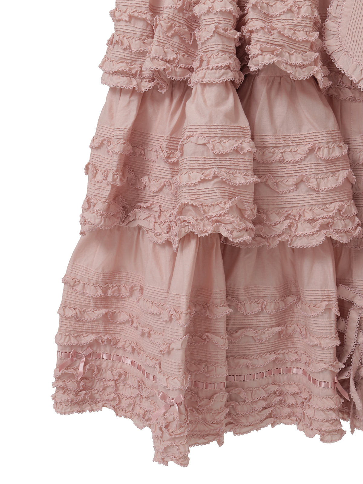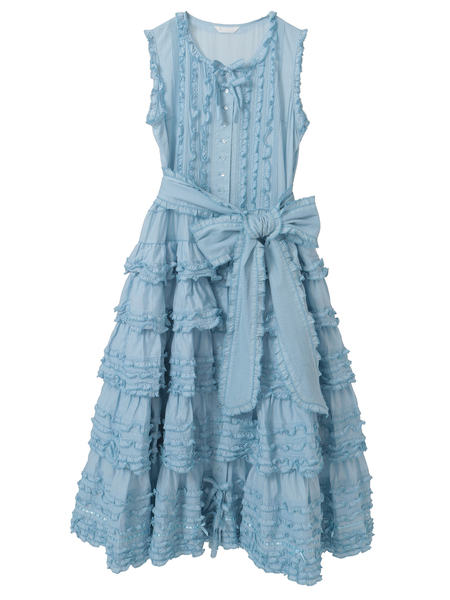 ピンタックにピコフリルといった繊細なデティールを、フロントまわりや華やかなフリル使いのスカート部分にふんだんに贅沢にあしらった綿ローンのノースリーブワンピース。