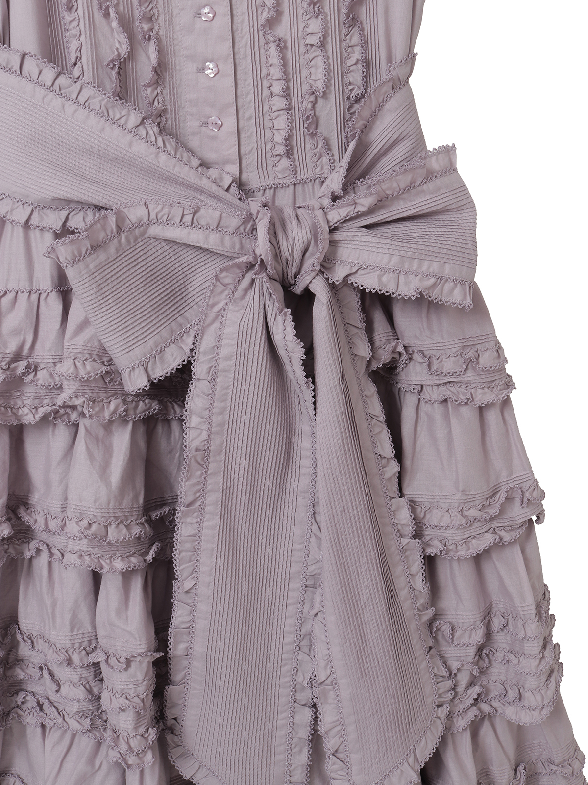 ピンタックを幾重にも重ね合わせてピコフリルの縁取りを添えた大ぶりのサッシュベルトは、ウエストまわりで結ぶととても華やかに。