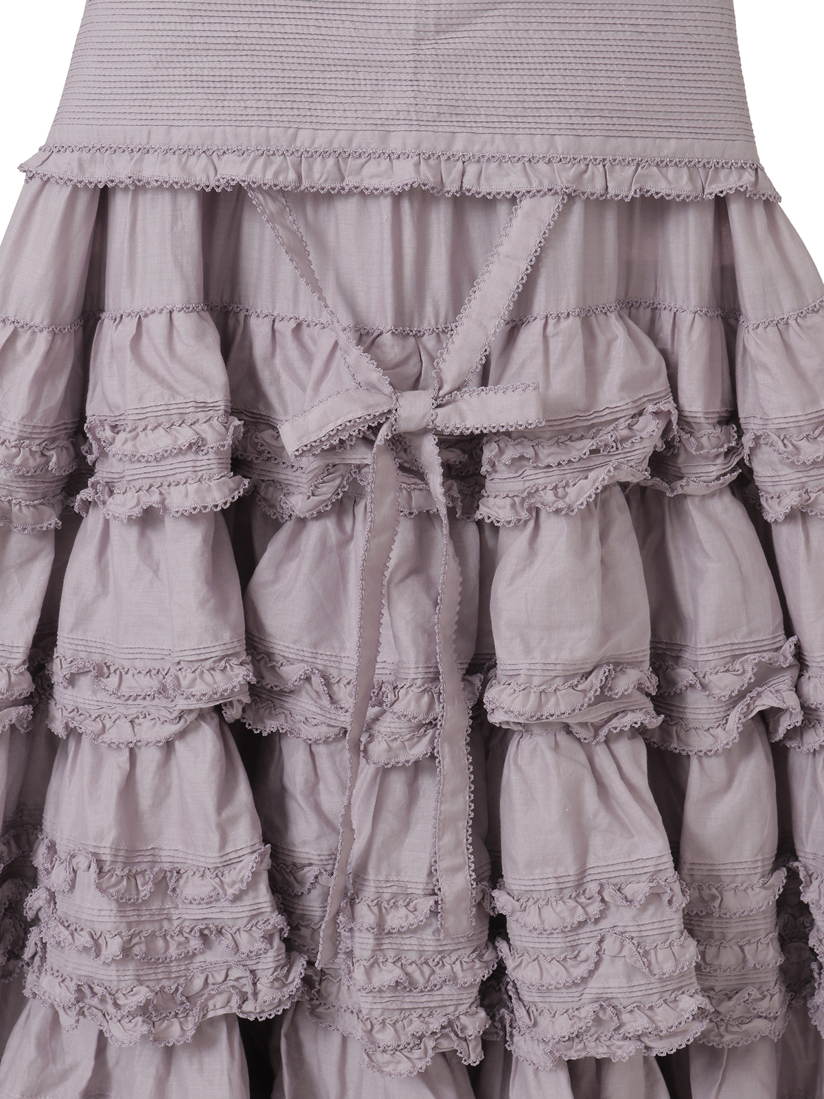 スカート部分には5段にも重ね合わせた段々フリルデザインで、それぞれのフリルのところには、さらにピコフリルとピンタックをあしらって華やかに。裾に近づくにつれてフリル感もより華やかでデコラティブに、分量感たっぷりでゴージャスでとても華やかに仕上がりました。