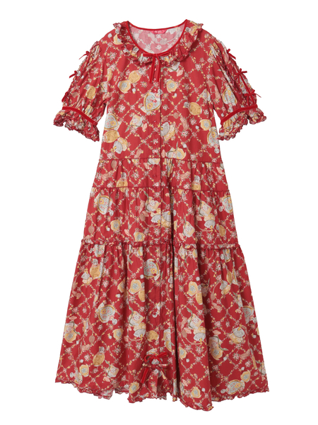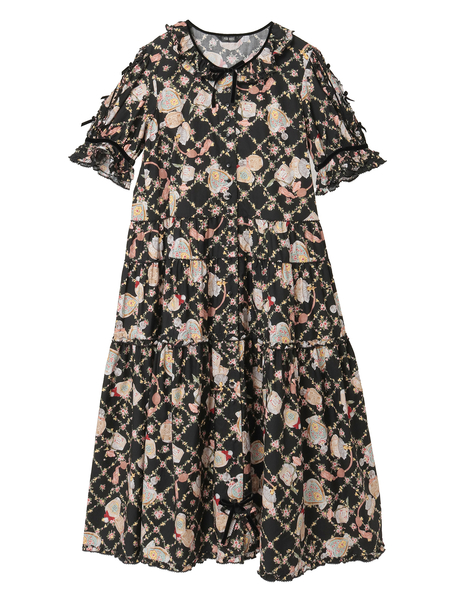 パフスリーブに、ウエストあたりから切り替えを入れて裾にかけて広がる分量感たっぷりなティアードシルエットのロングワンピースは、いわゆる王道ワンピースのデザイン。