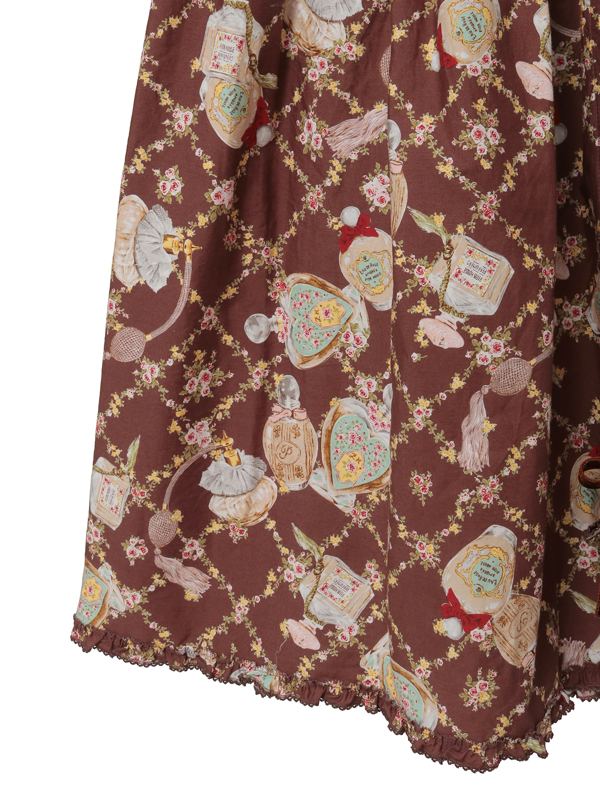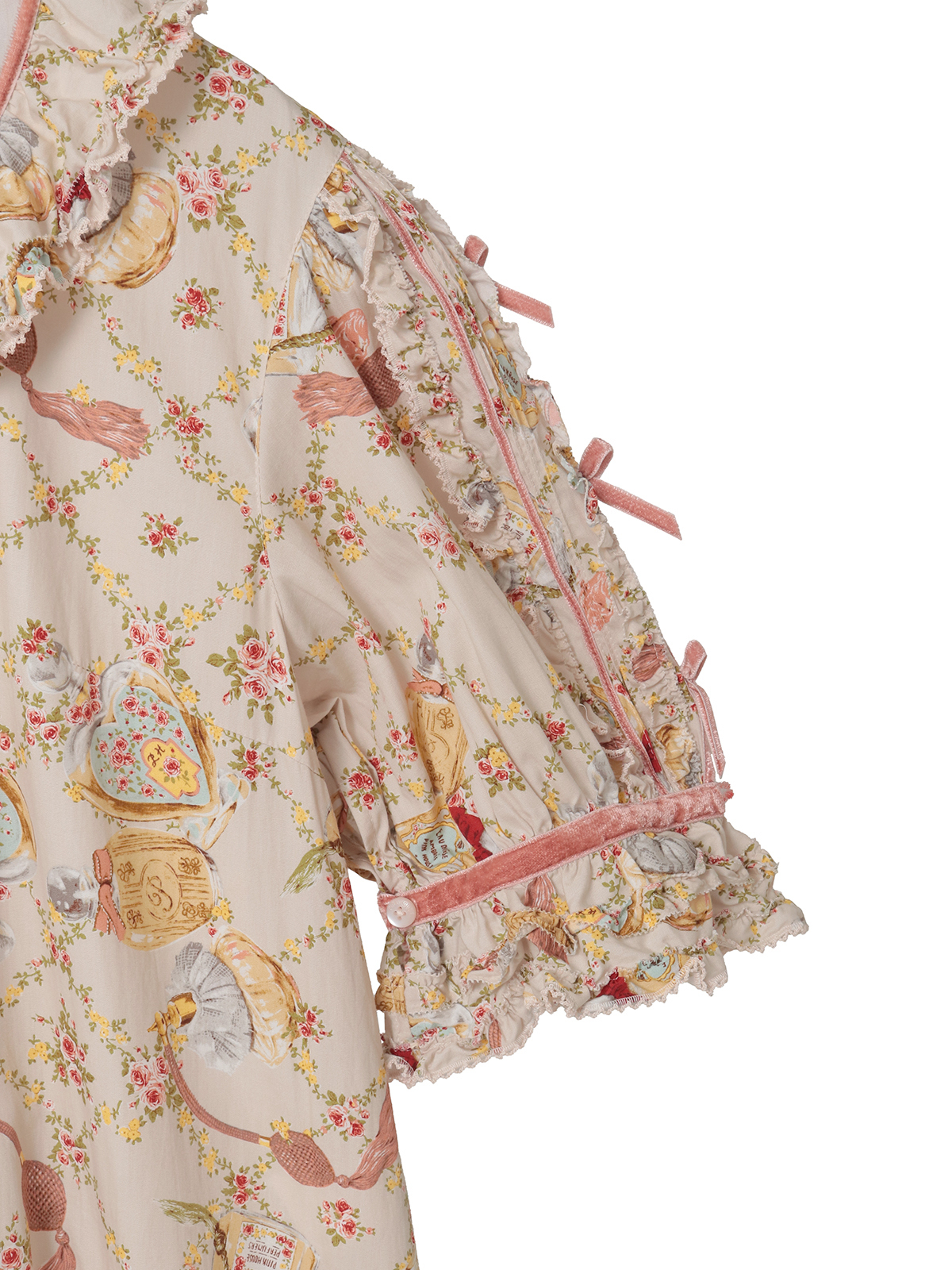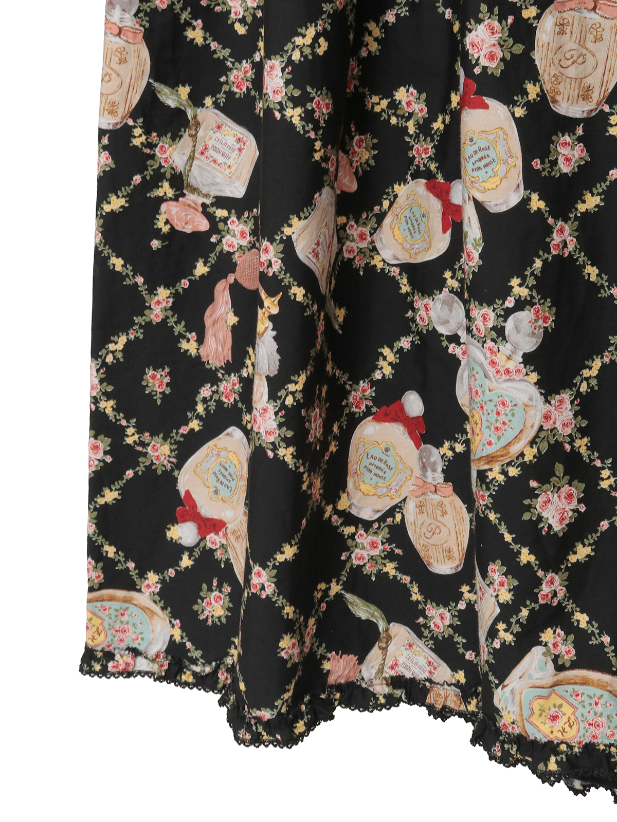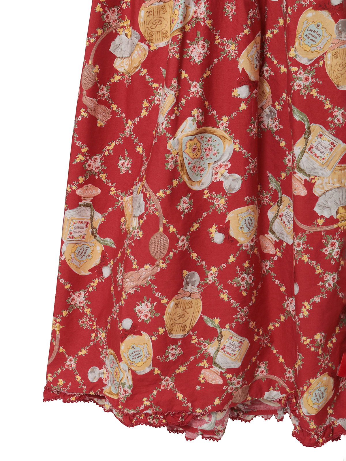 プリントに描かれたエレガントな香水瓶たちを飾り立てたベロアリボンを、そのままワンピースの装飾用に使用。