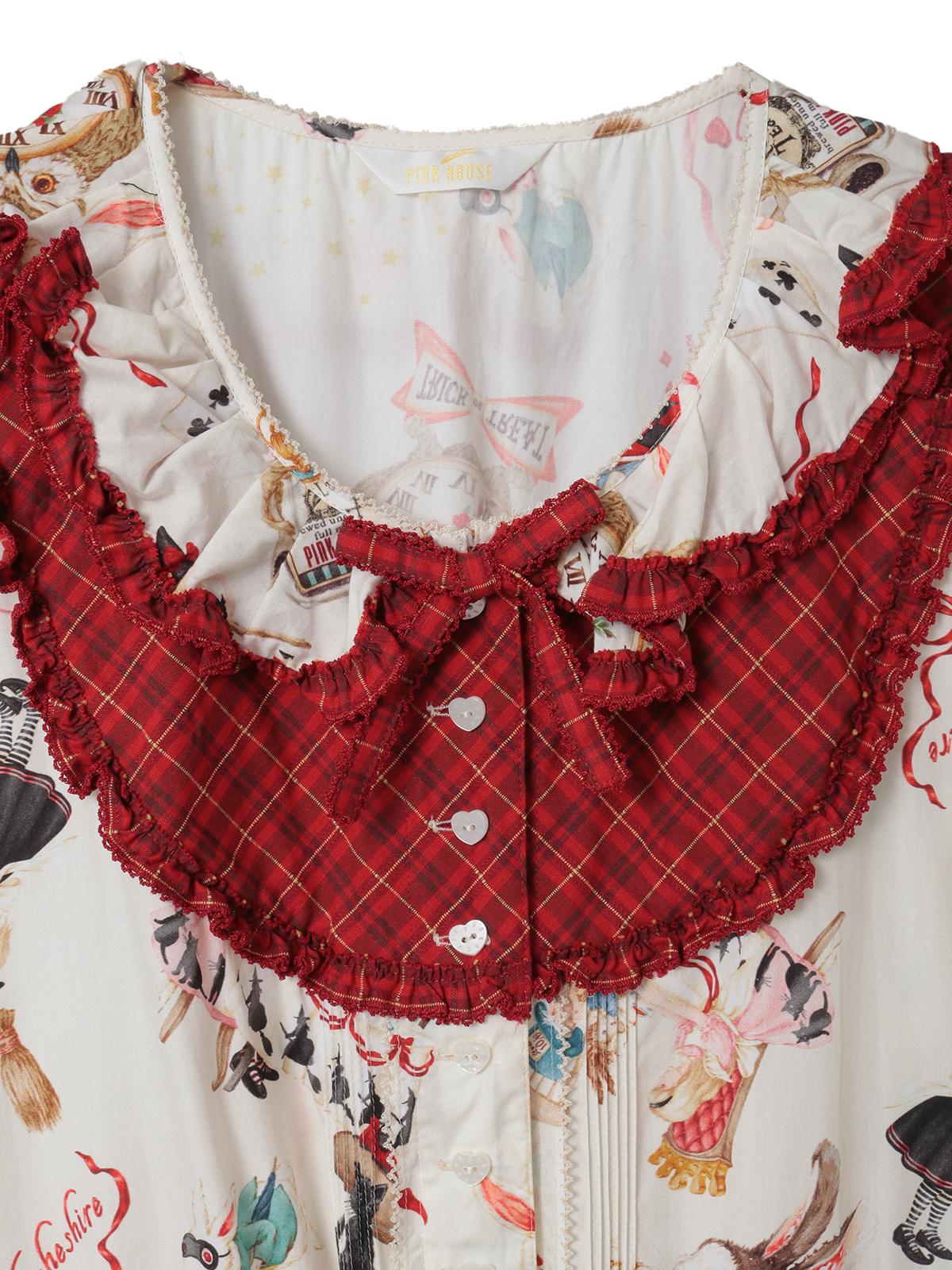 袖まわりや裾まわり、フロントのヨークのところにオリジナルのコードチェックをあしらって部分使いにしたパッチワーク風のデザインがなんとも可愛らしい。