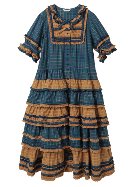 同じコードチェックをパーツやフリルごとに変えて配色使いにしたパッチワーク風のデザインがなんとも可愛らしい。