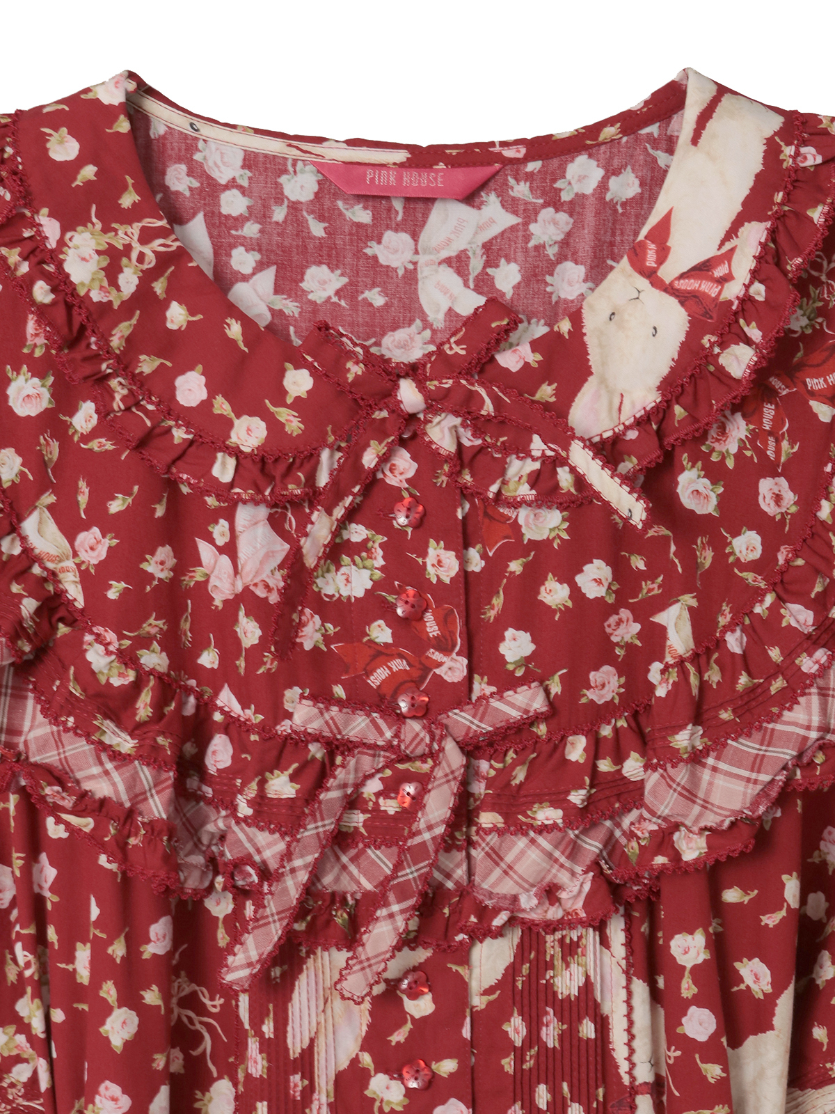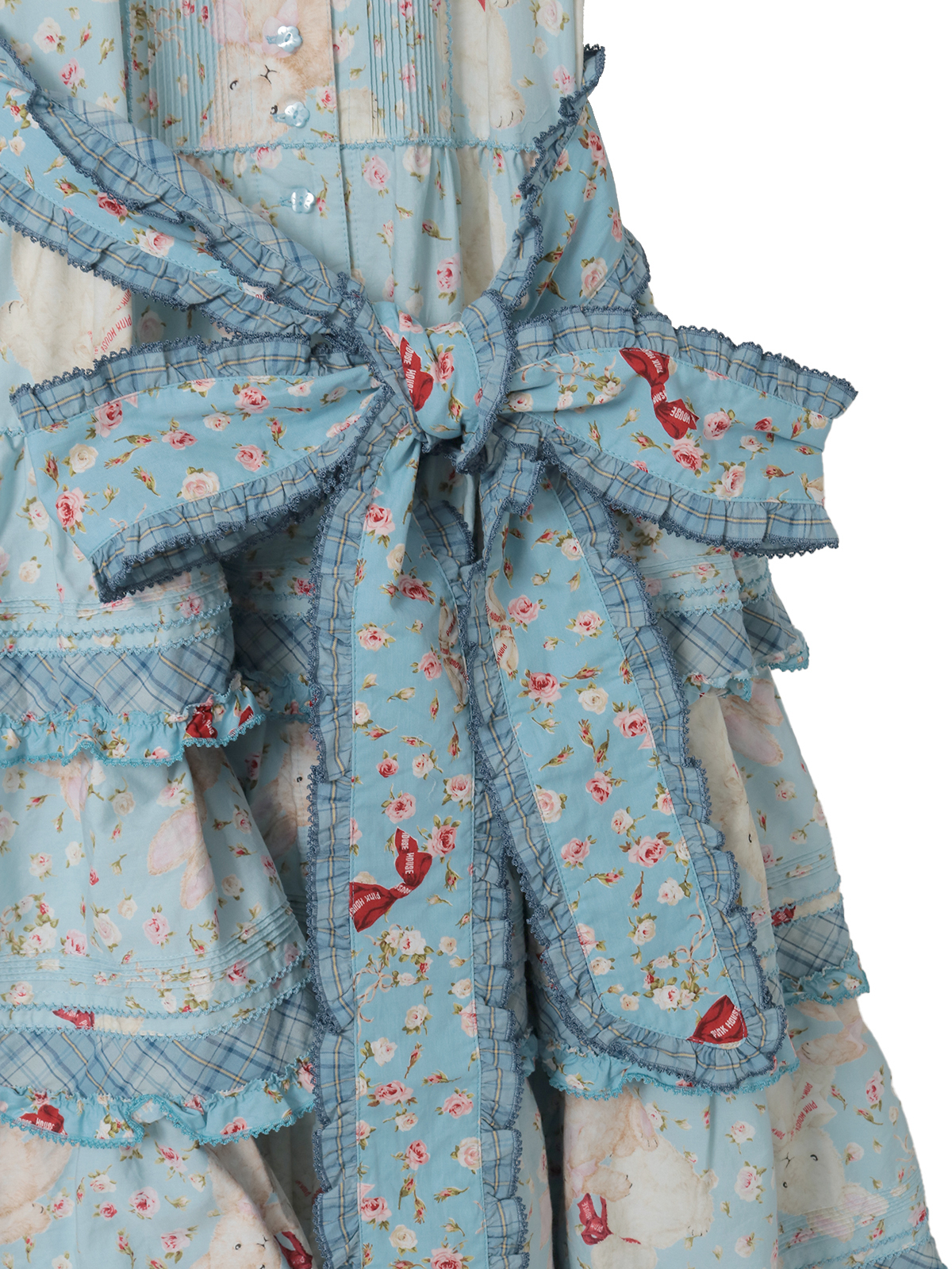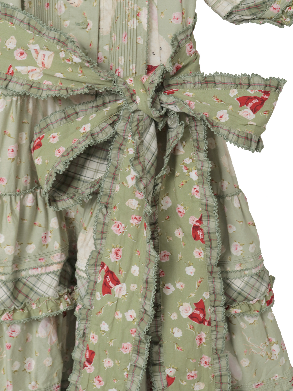 ヨークの部分やスカート部分の重ね合わせたフリルの先などに「バラとリボンプリント」を掛け合わせたパッチワークのデザイン。さらにオリジナルチェックも加えて華やかな装いに。