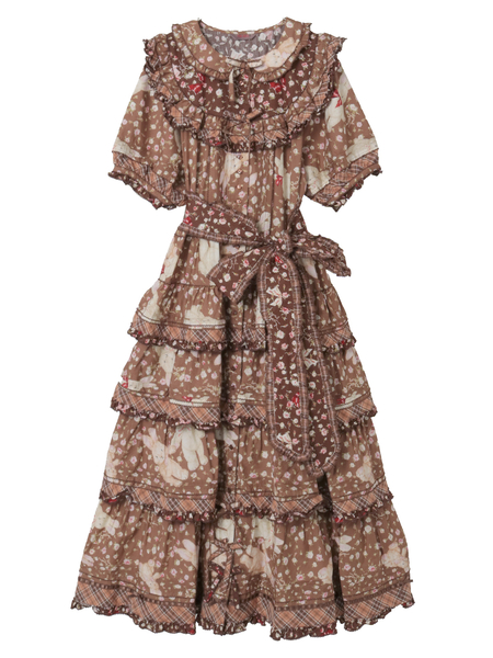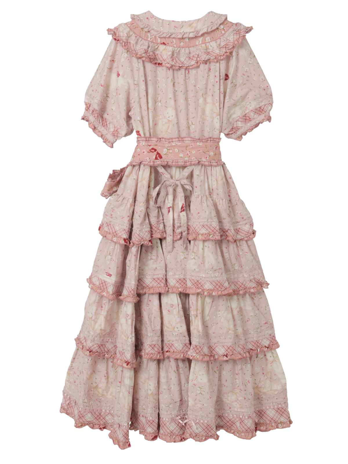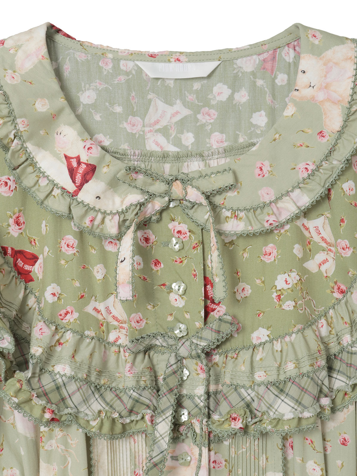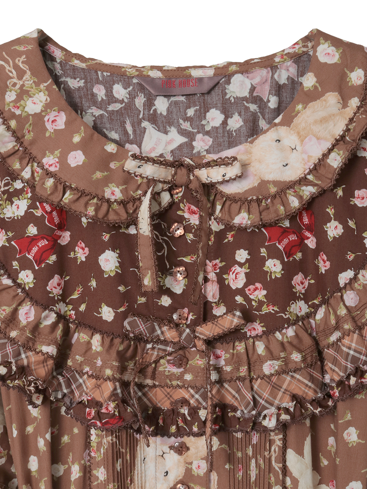 ヨークの部分やスカート部分の重ね合わせたフリルの先などに「バラとリボンプリント」を掛け合わせたパッチワークのデザイン。さらにオリジナルチェックも加えて華やかな装いに。