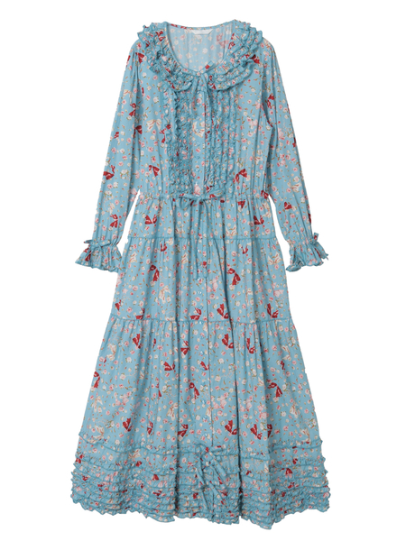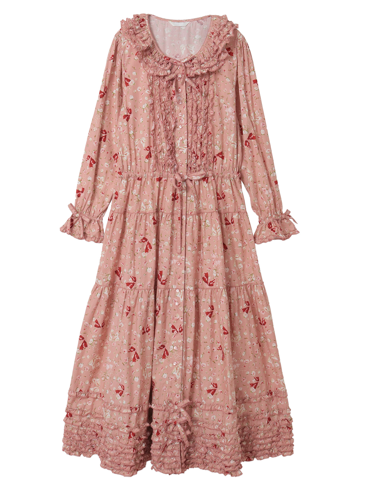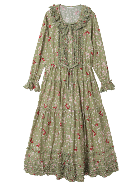 襟付き、長袖のロングティアードワンピース。