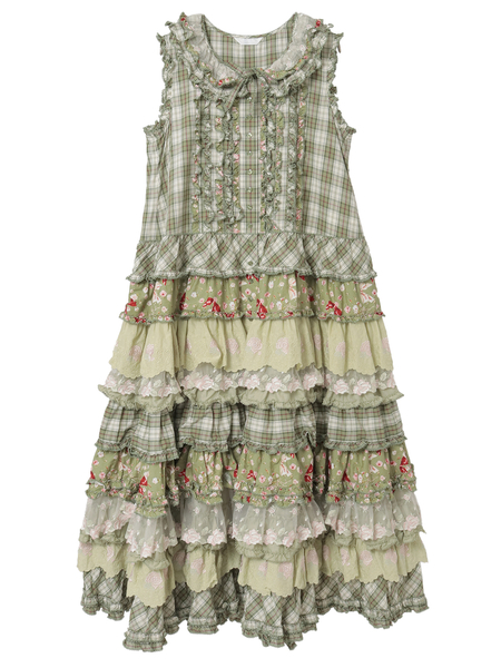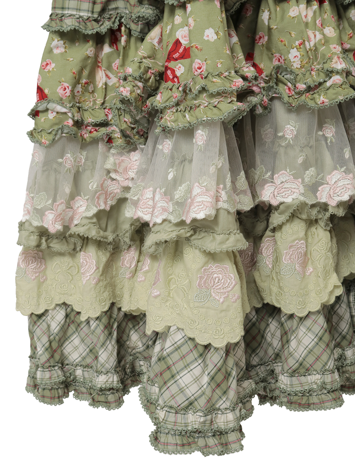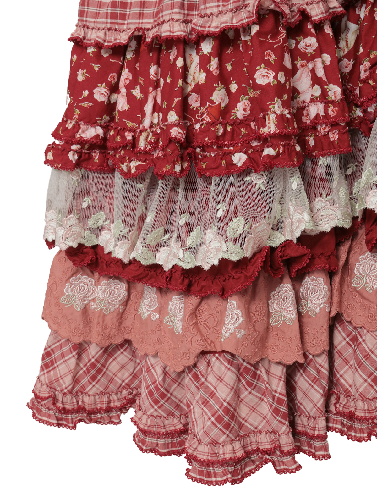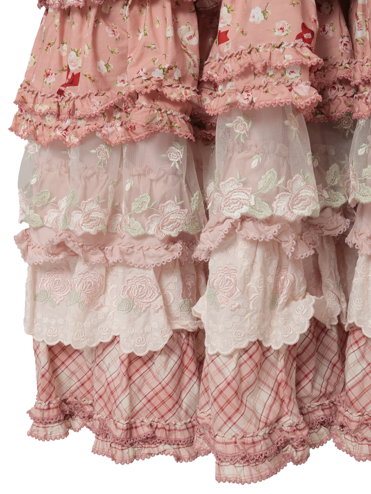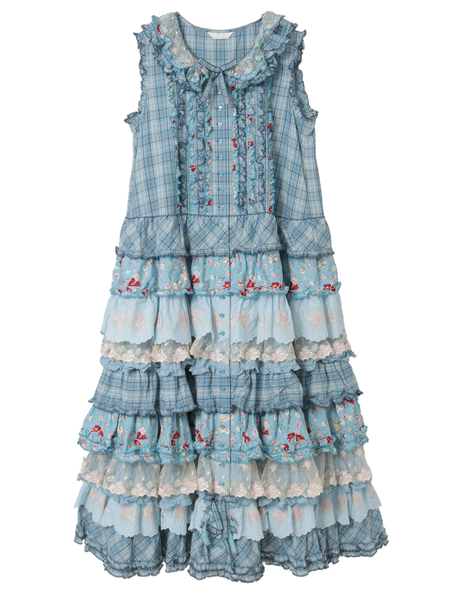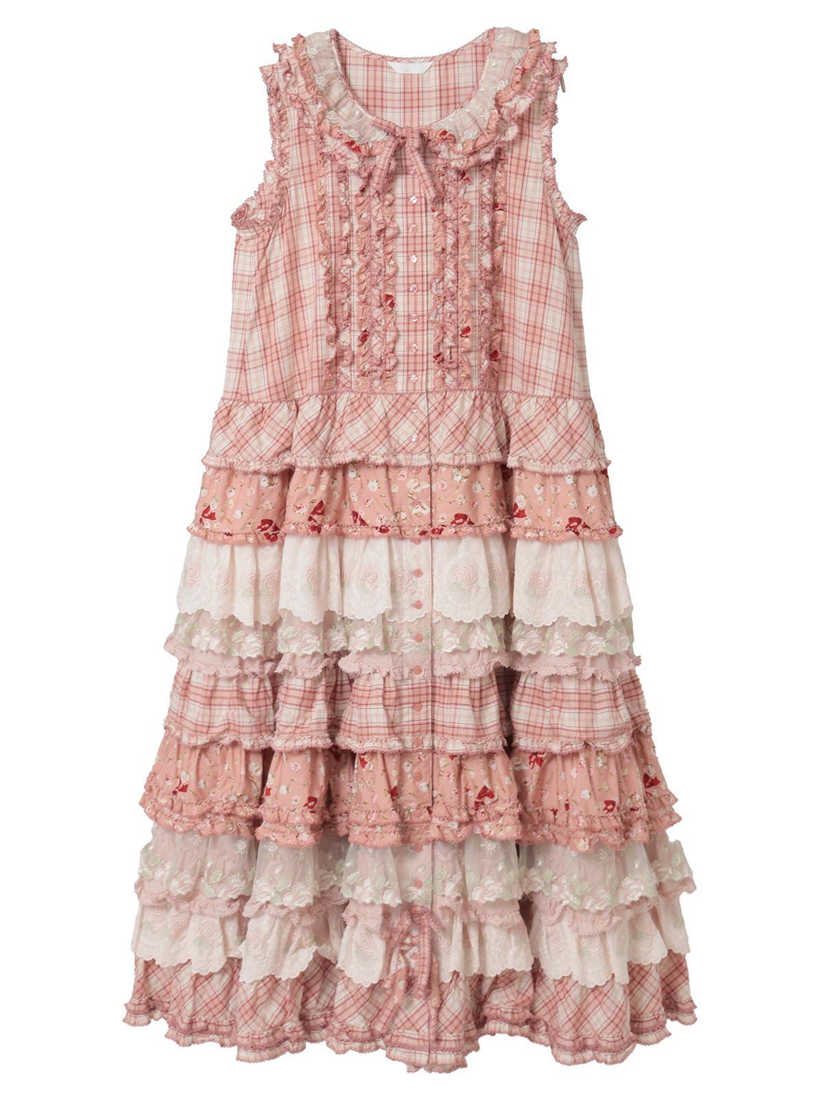 オリジナルチェックベースに、「バラとリボンプリント」、そして無地のブロード地に、さらにオリジナルのローズチュールレースとローズ刺繍を施したコットンレースをそれぞれフリルにして交互に重ね合わせたとっても豪華なミックスパッチワークのワンピース。