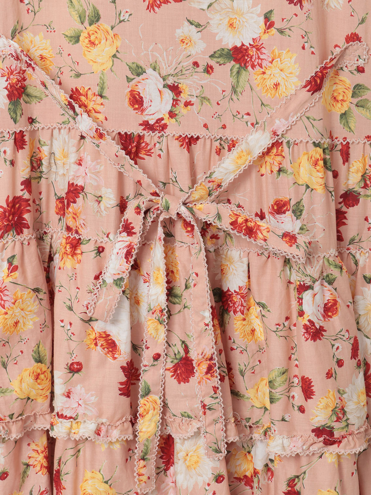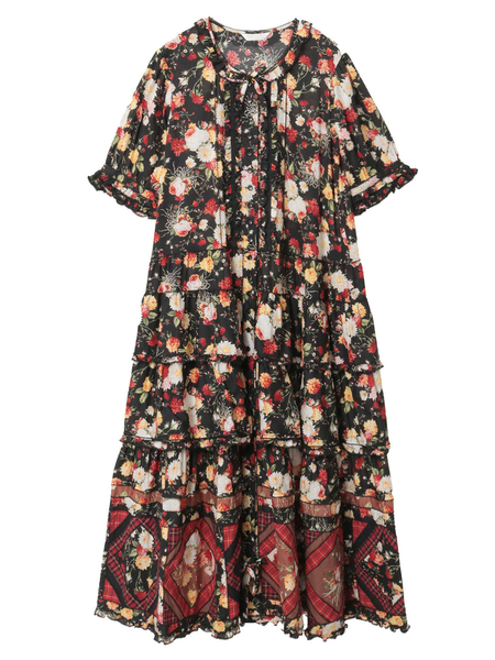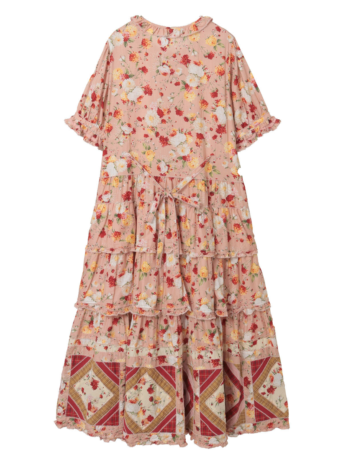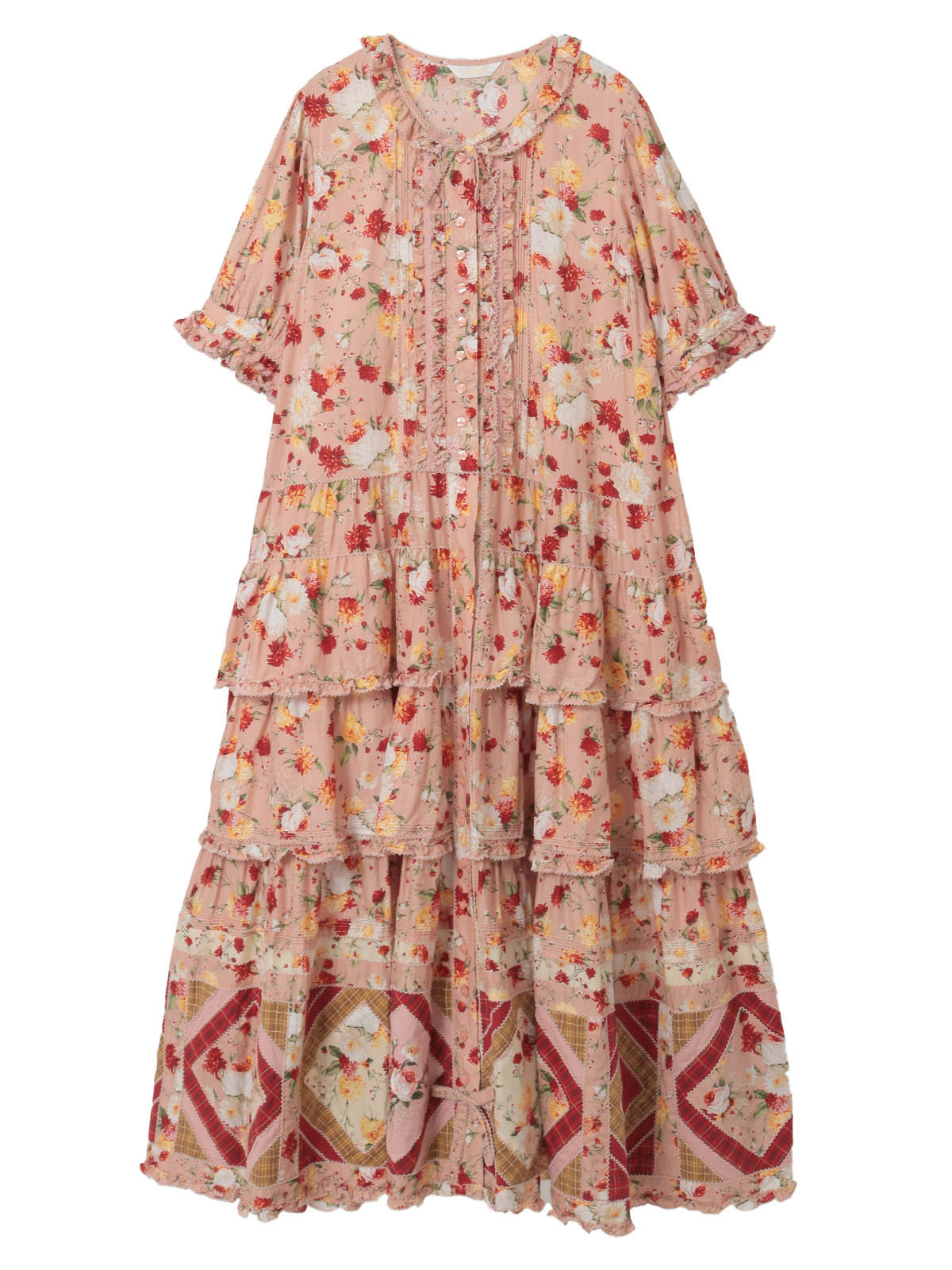 首まわりに軽くフリルをあしらったワンピースは、ウエストあたりから切り替えの入ったふんわりとしたティアードシルエット。後ろの背中あたりにリボン紐を結んでシルエット調節も可能です。