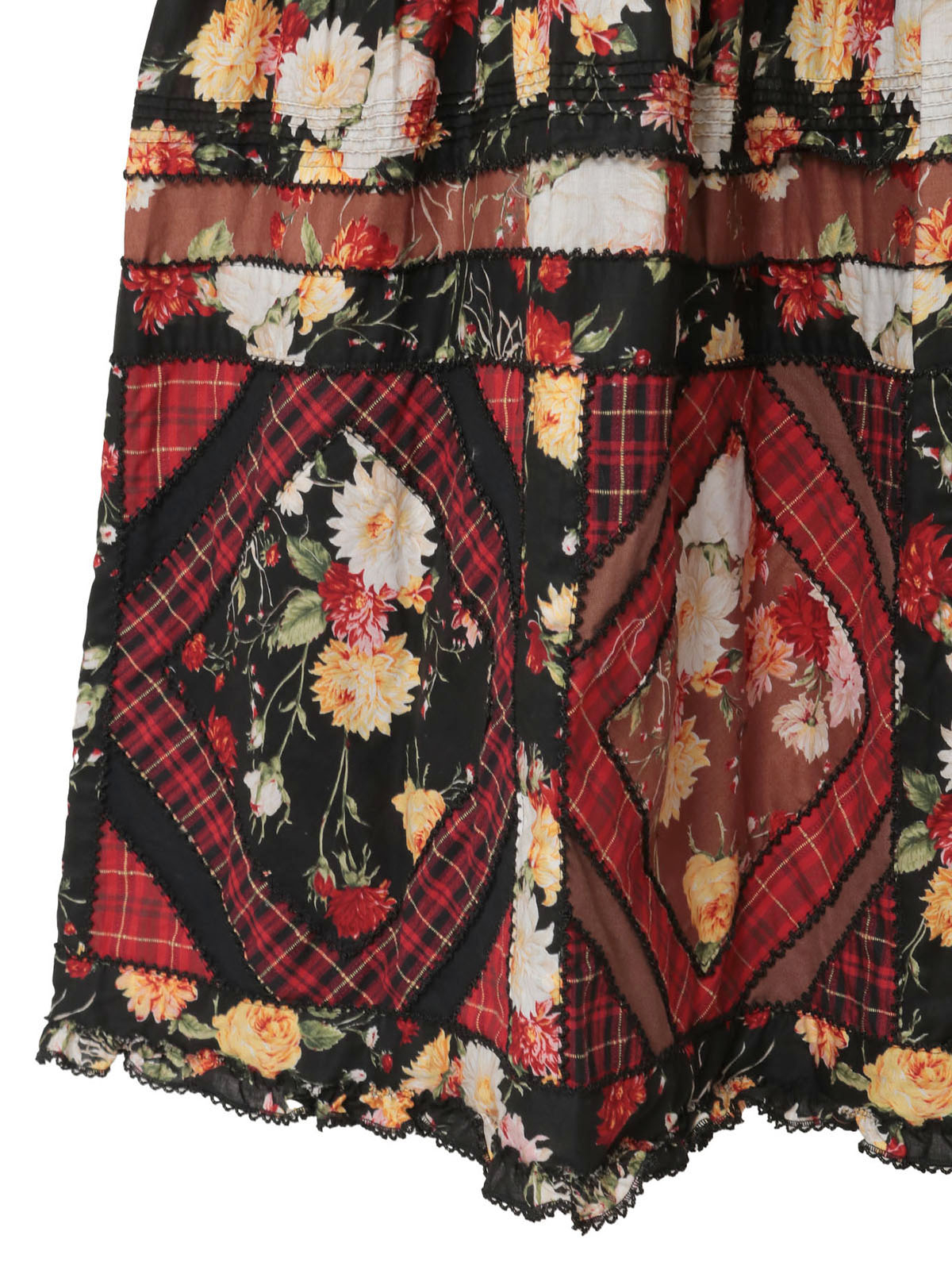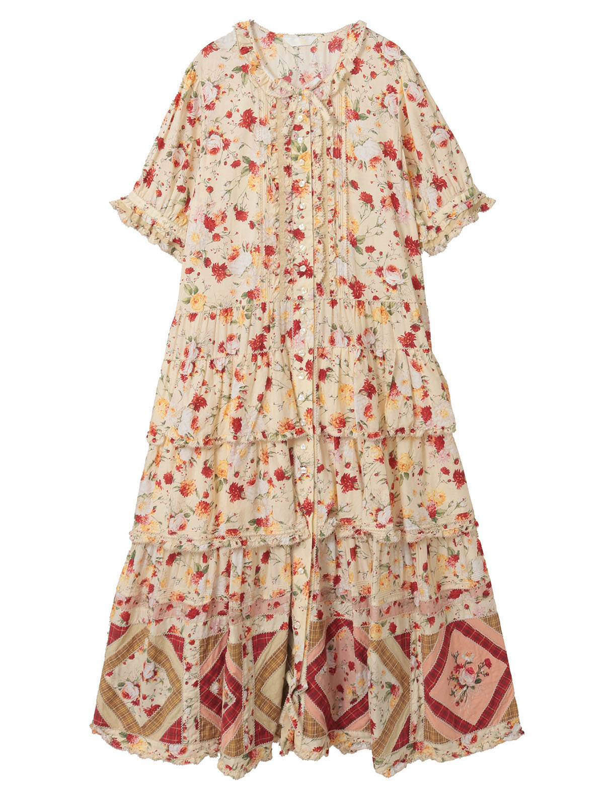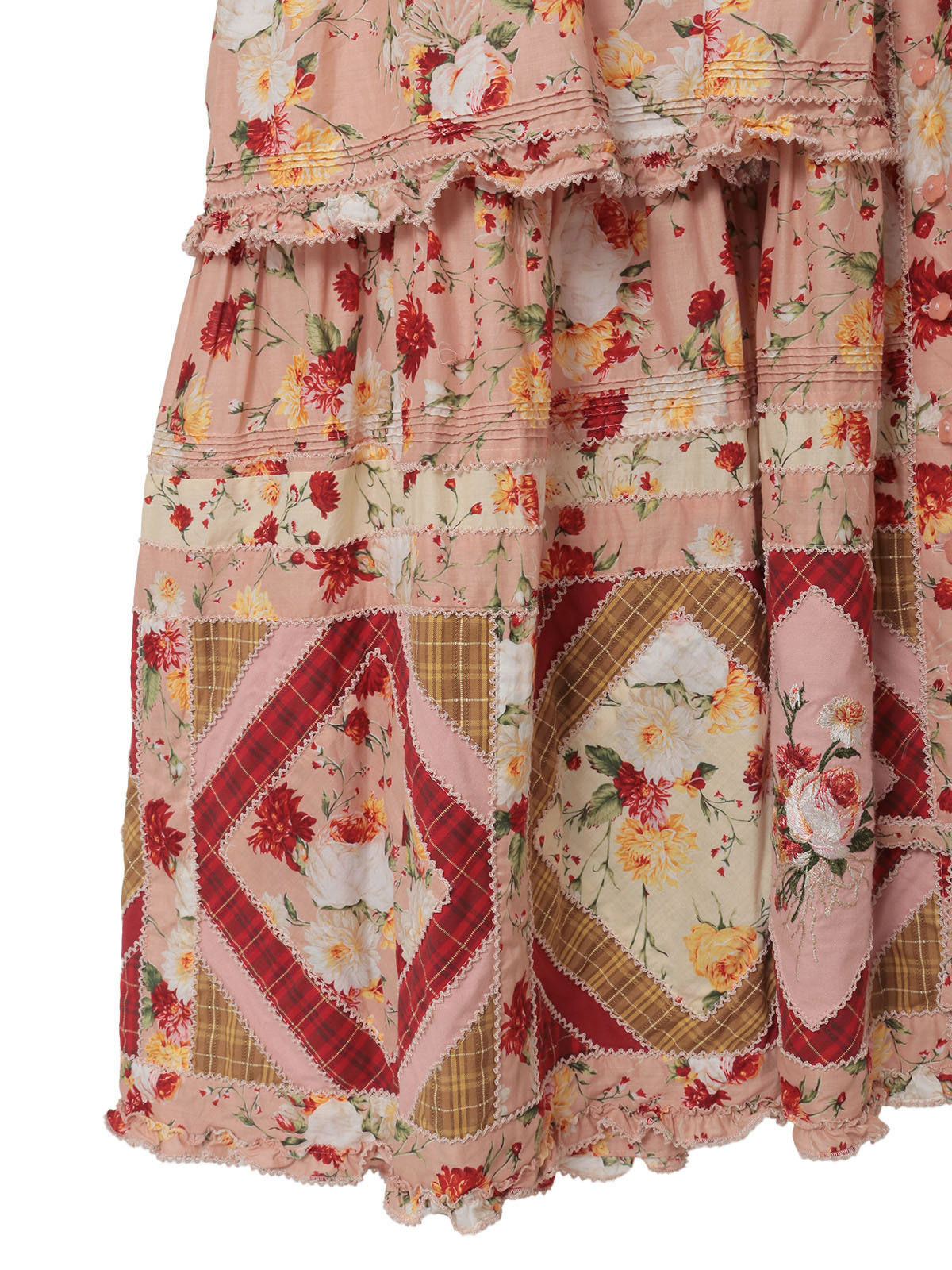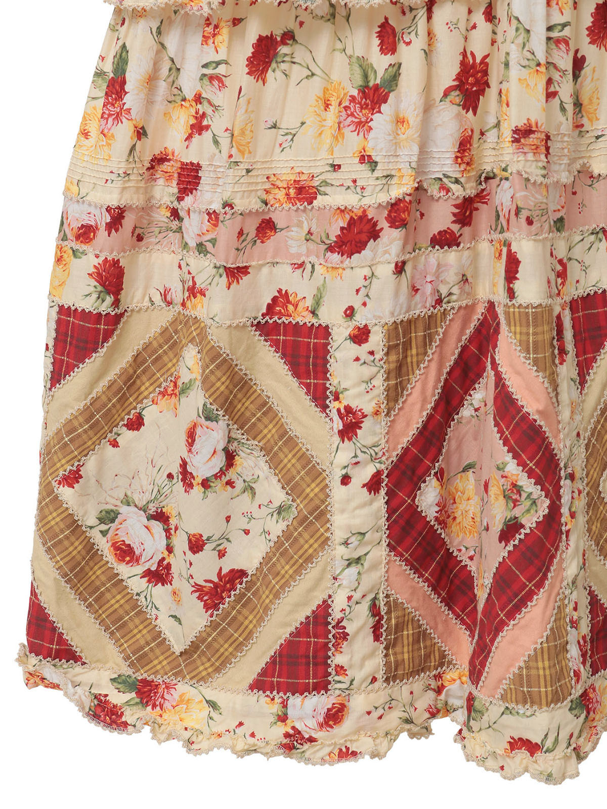 裾まわりには、「ジョセフィ―ヌプリント」をアップリケ風にしてコードチェックと無地ローンを組み合わせたパッチワーク風のデザインがとても華やか。