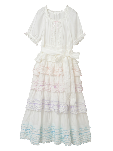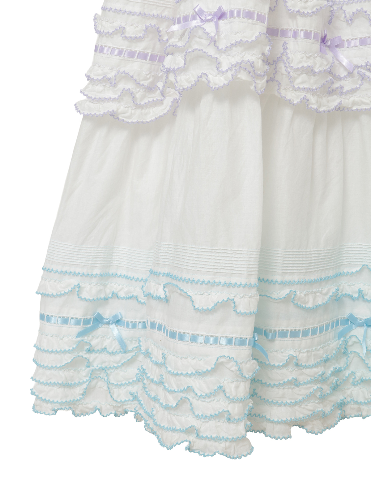 ピコット刺繍やサテンリボンなど配色使いにして、それぞれの段々フリルごとにカラーを変えたこだわりの1着をどうぞお楽しみください。