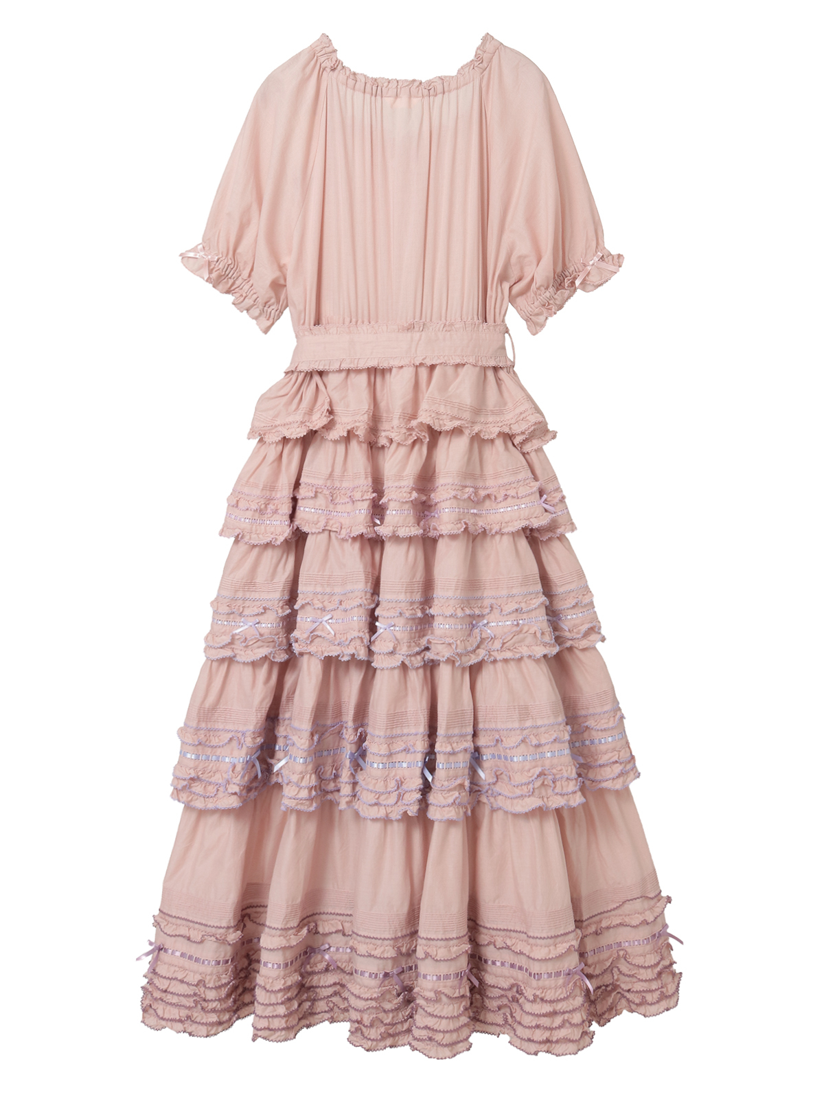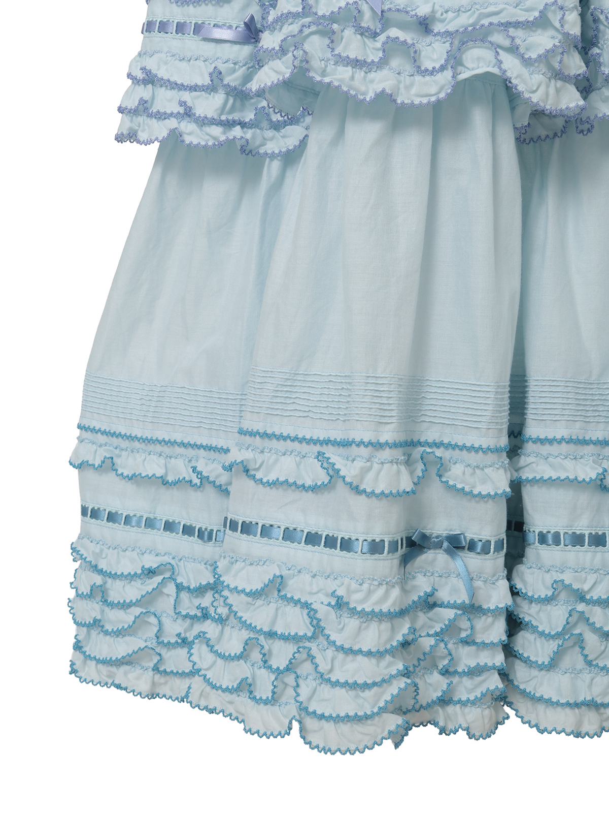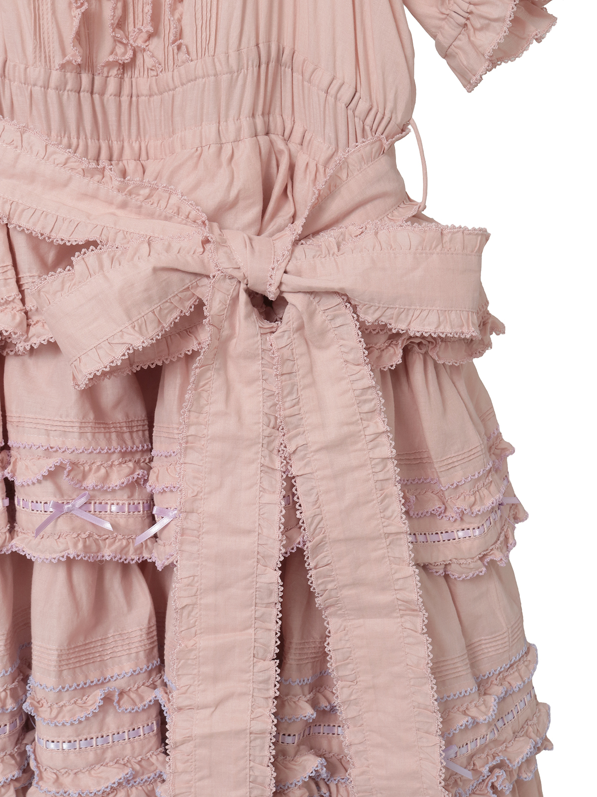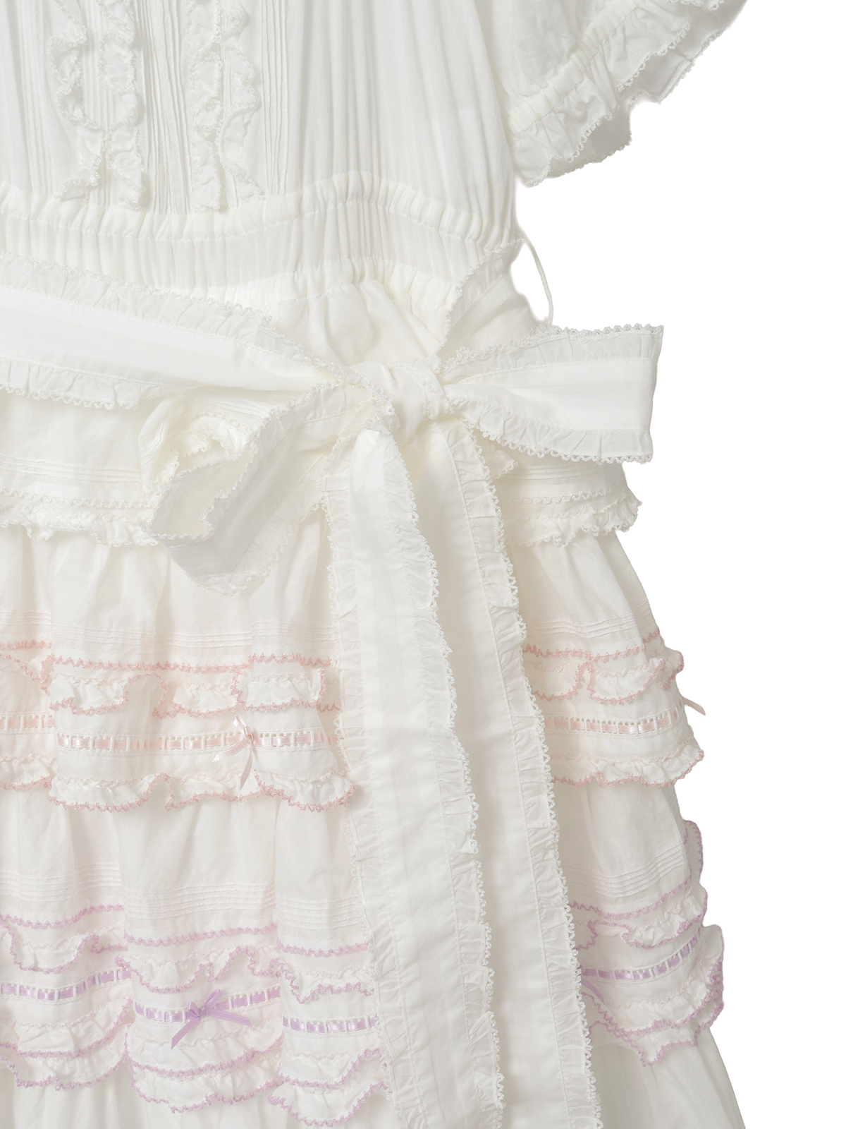 段々フリルを重ね合わせた華やかな綿ローンのワンピースは、それぞれの段々フリルにピンタック、ピコフリルそしてサテンリボンを通したはしごレースなどキュートなデティールを詰め込んだ華やかな仕上がりに。
