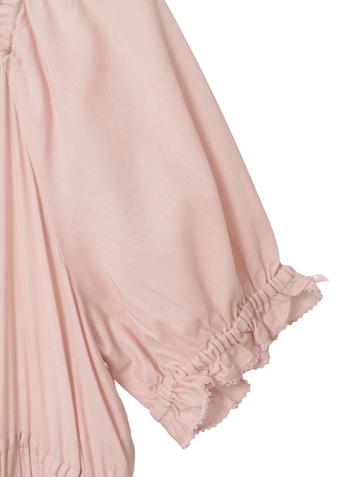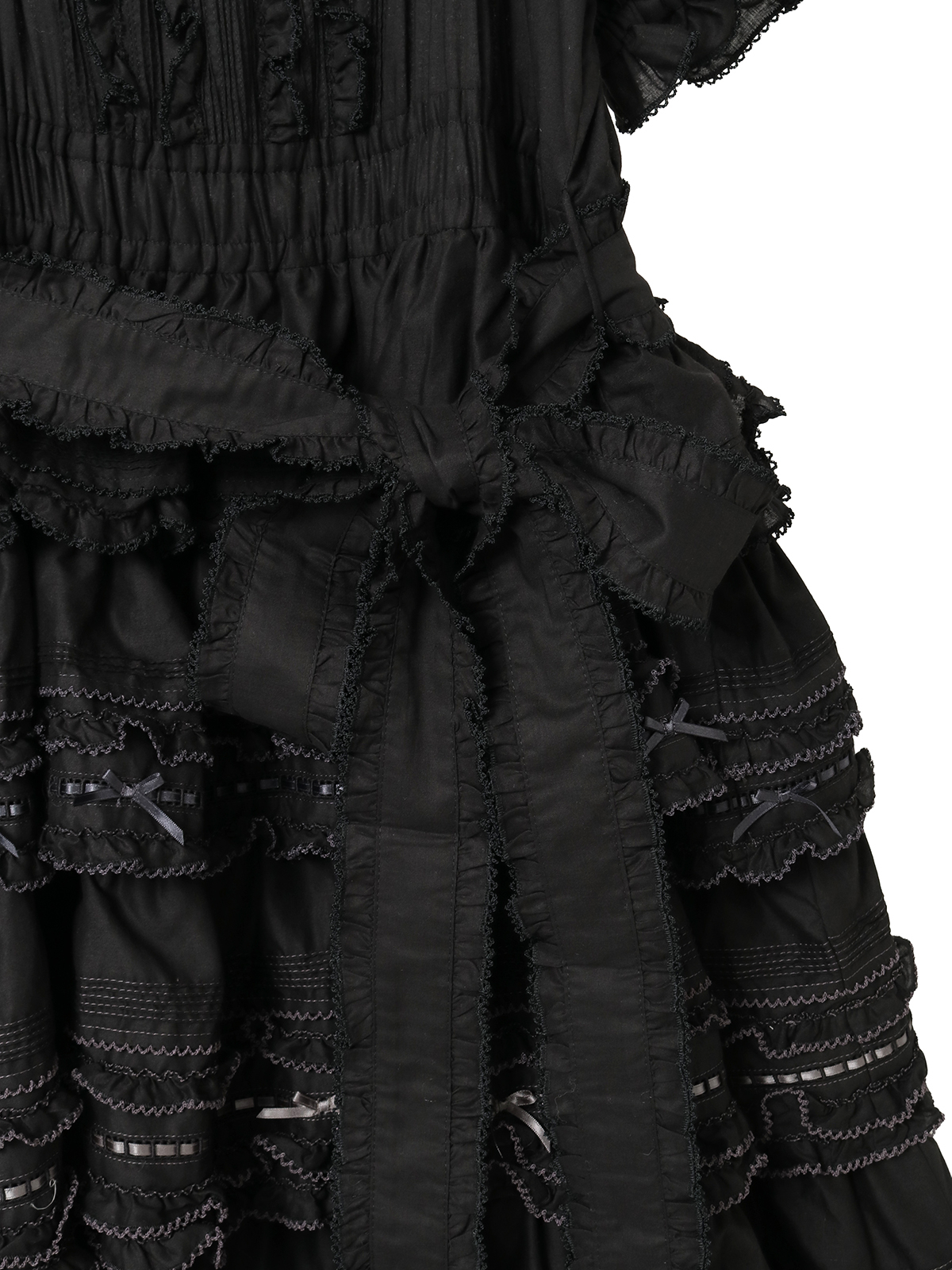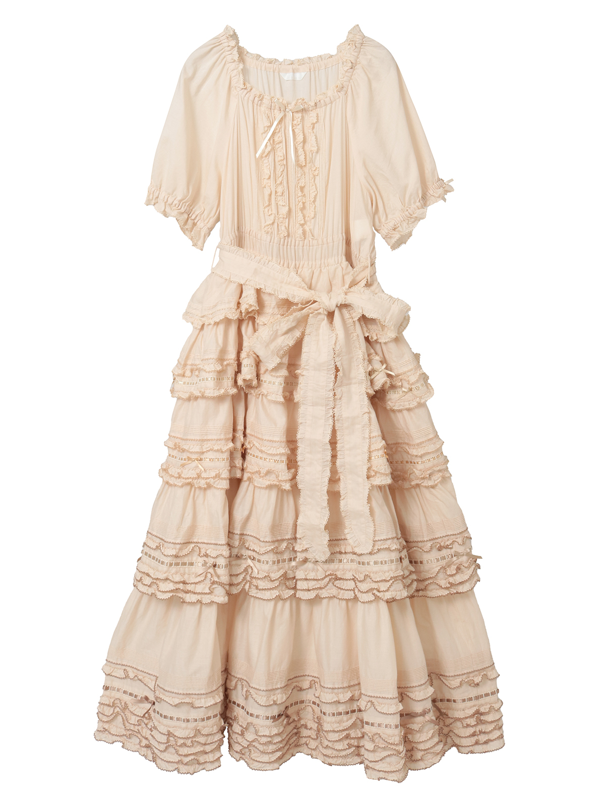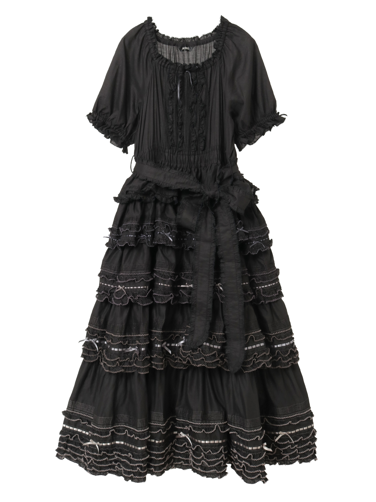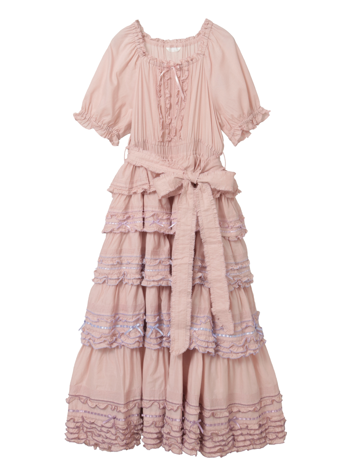 段々フリルを重ね合わせた華やかな綿ローンのワンピースは、それぞれの段々フリルにピンタック、ピコフリルそしてサテンリボンを通したはしごレースなどキュートなデティールを詰め込んだ華やかな仕上がりに。