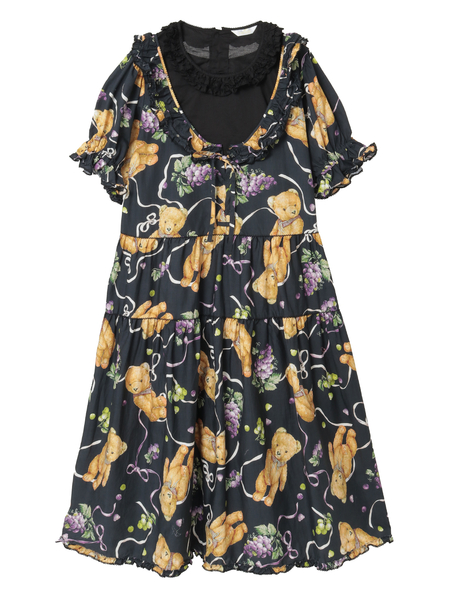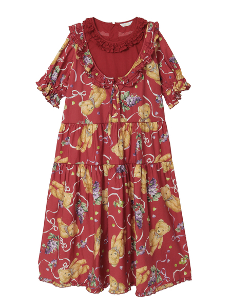 たわわに実った葡萄のあいだを流れるピンクハウスリボンのうえに、葡萄とお揃いの色合いが可愛らしいかぎ針編みの襟を付けたオールドテディベアが微笑むテキスタイル。収穫の時期を迎えてにっこりと微笑むすがたがなんとも愛くるしい。