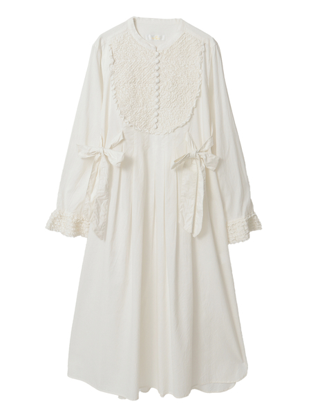 繊細なピコフリルをふんだんに放射線状に施したパーツをランダムにパッチワーク風に組み合わせて、より繊細で複雑なデティール使いが上品で華やかな仕上がりに。