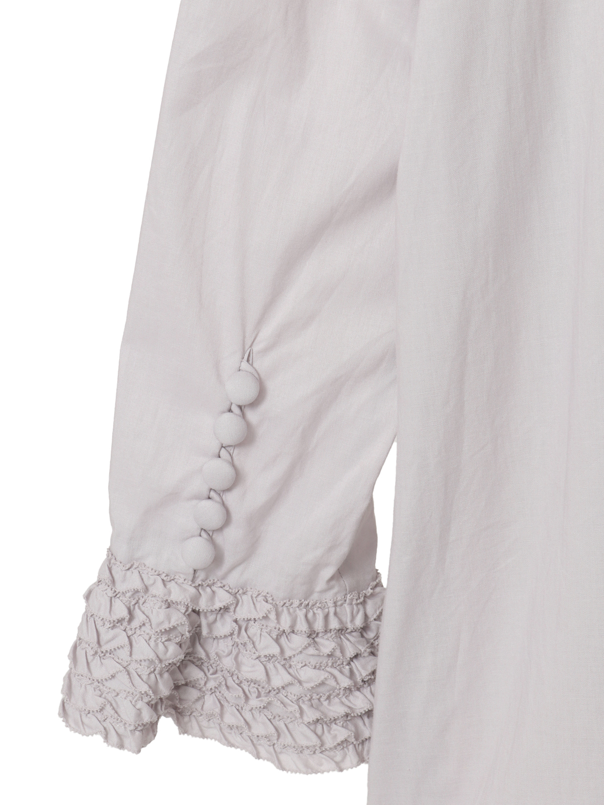 袖まわりのところにもさりげなくフェイクのくるみボタンをあしらってアクセント使いに。