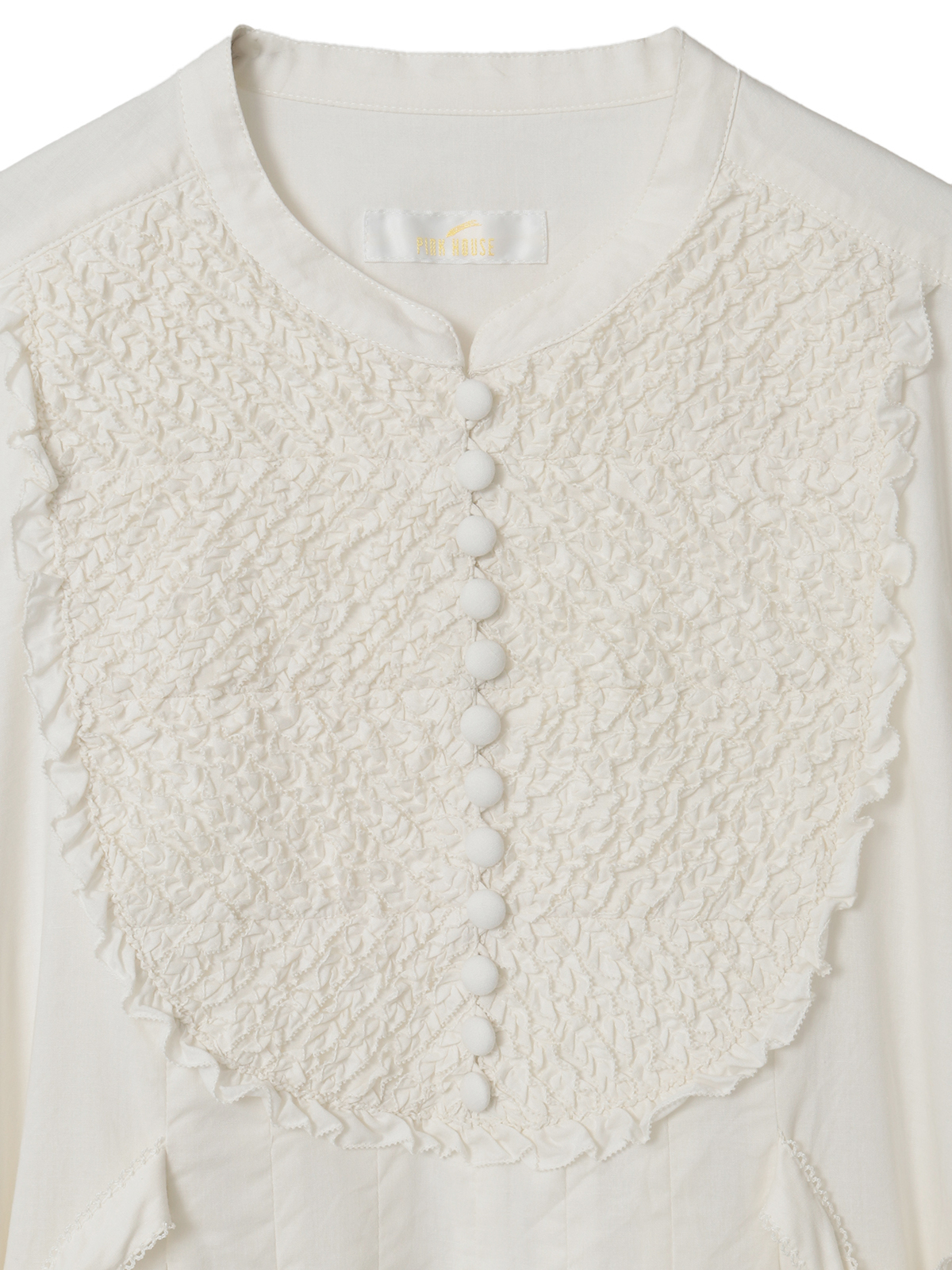 ほんのりスタンドカラーのシャツタイプのデザインがフロントの華やかさを引き締めています。