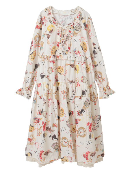 胸下あたりから切り替えの入ったティアードシルエットが可愛いミディワンピース。裾からは無地ローンのフリルをのぞかせた1枚でレイヤードスタイルが楽しめる人気のタイプです。