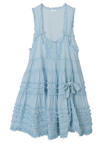 フリル感たっぷりのジャンパースカートタイプの綿ローンのタブリエは、左サイドにたくし上げリボンの付いたキュートでロマンティックな仕上がりに。