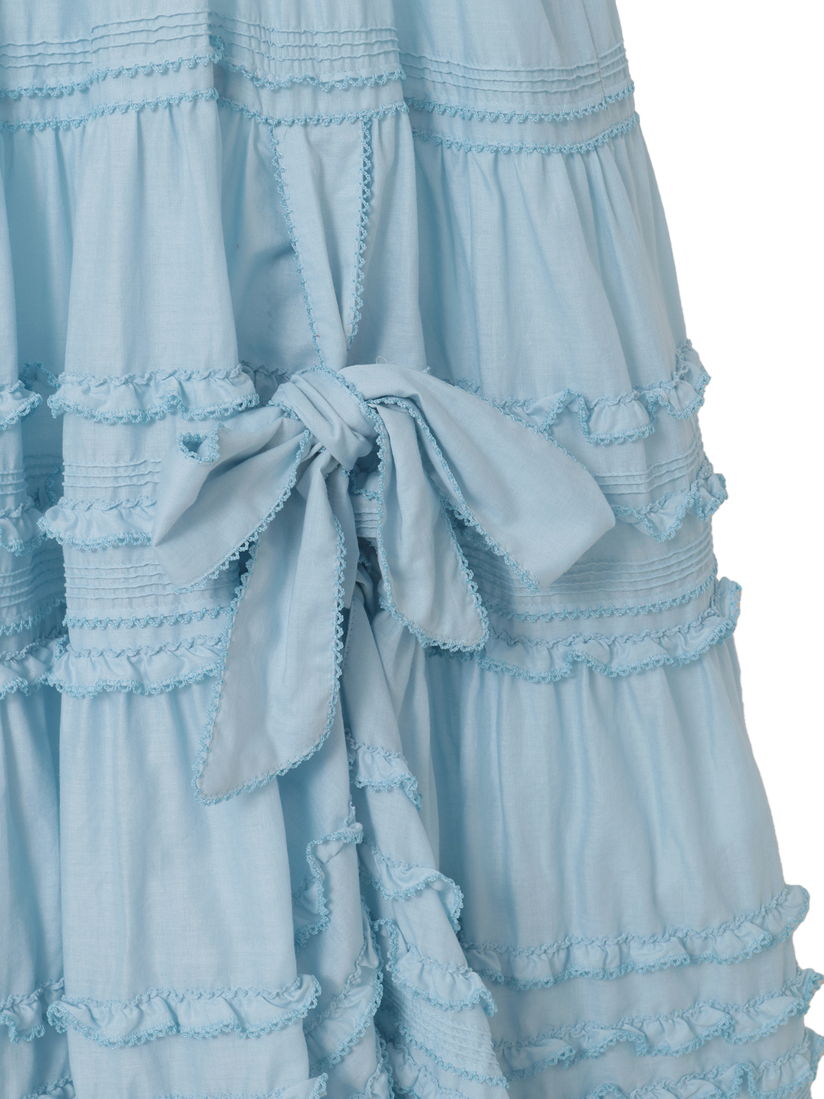 フリルとタックをふんだんにあしらって、裾ににかけて広がる分量感たっぷりのデザインはとても華やか。