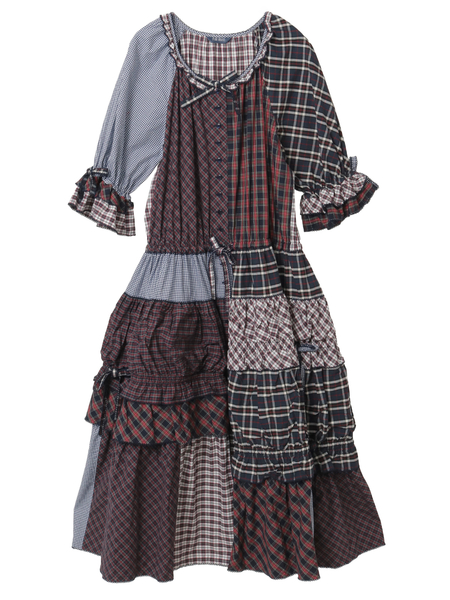 タータンチェックとギンガムチェック、それぞれ5種類のチェックをパーツごとに重ね合わせたパッチワークのデザインがとても華やかなワンピース。