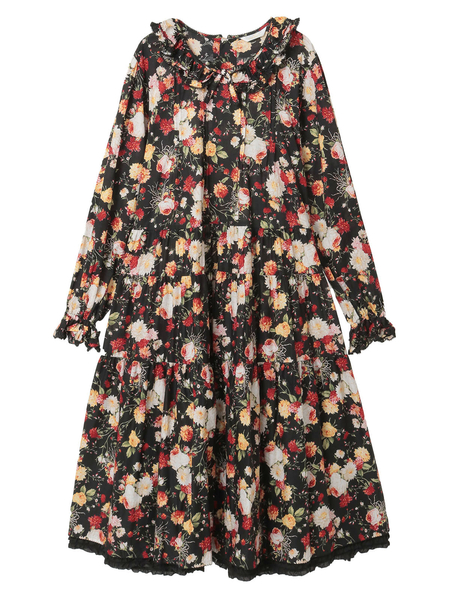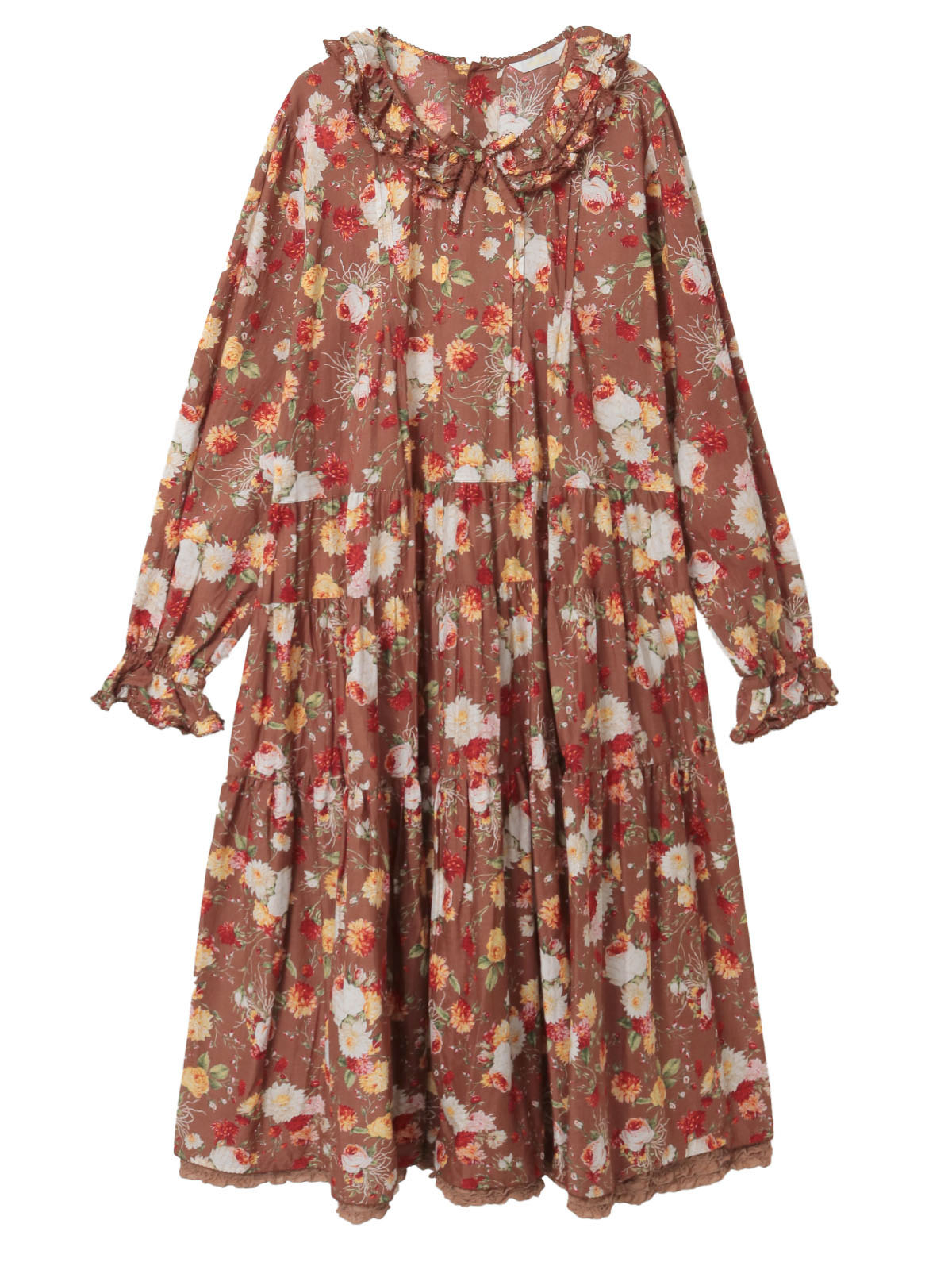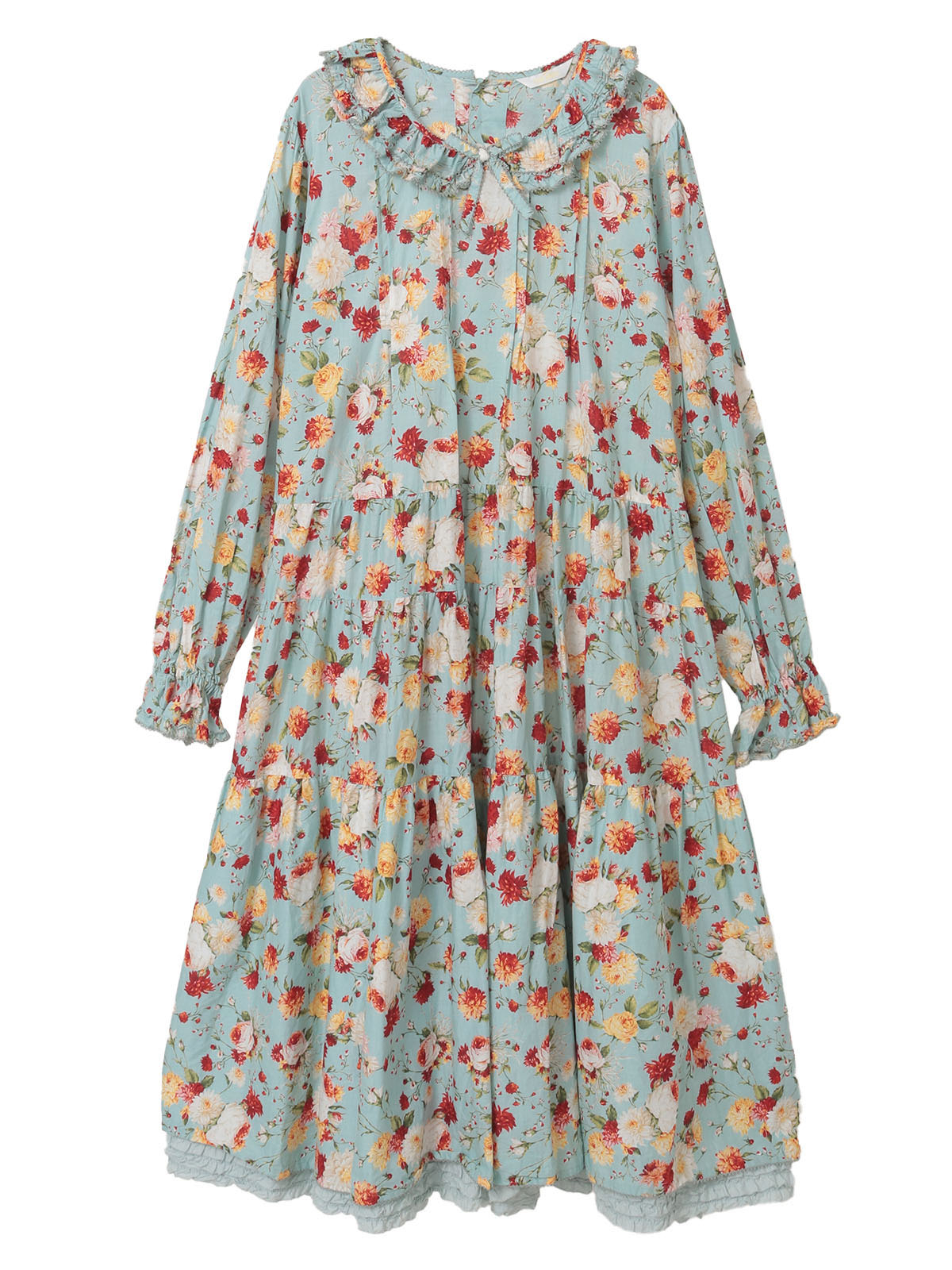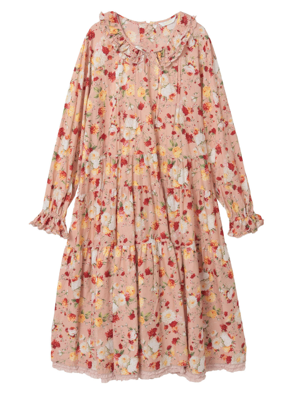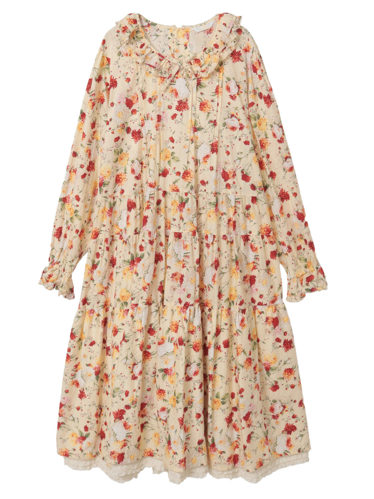 フリル襟の付いた長袖タイプのワンピースは、ウエストあたりから切り替えの入ったふんわりとしたティアードシルエット。後ろの背中あたりにリボン紐を結んでシルエット調節も可能です。