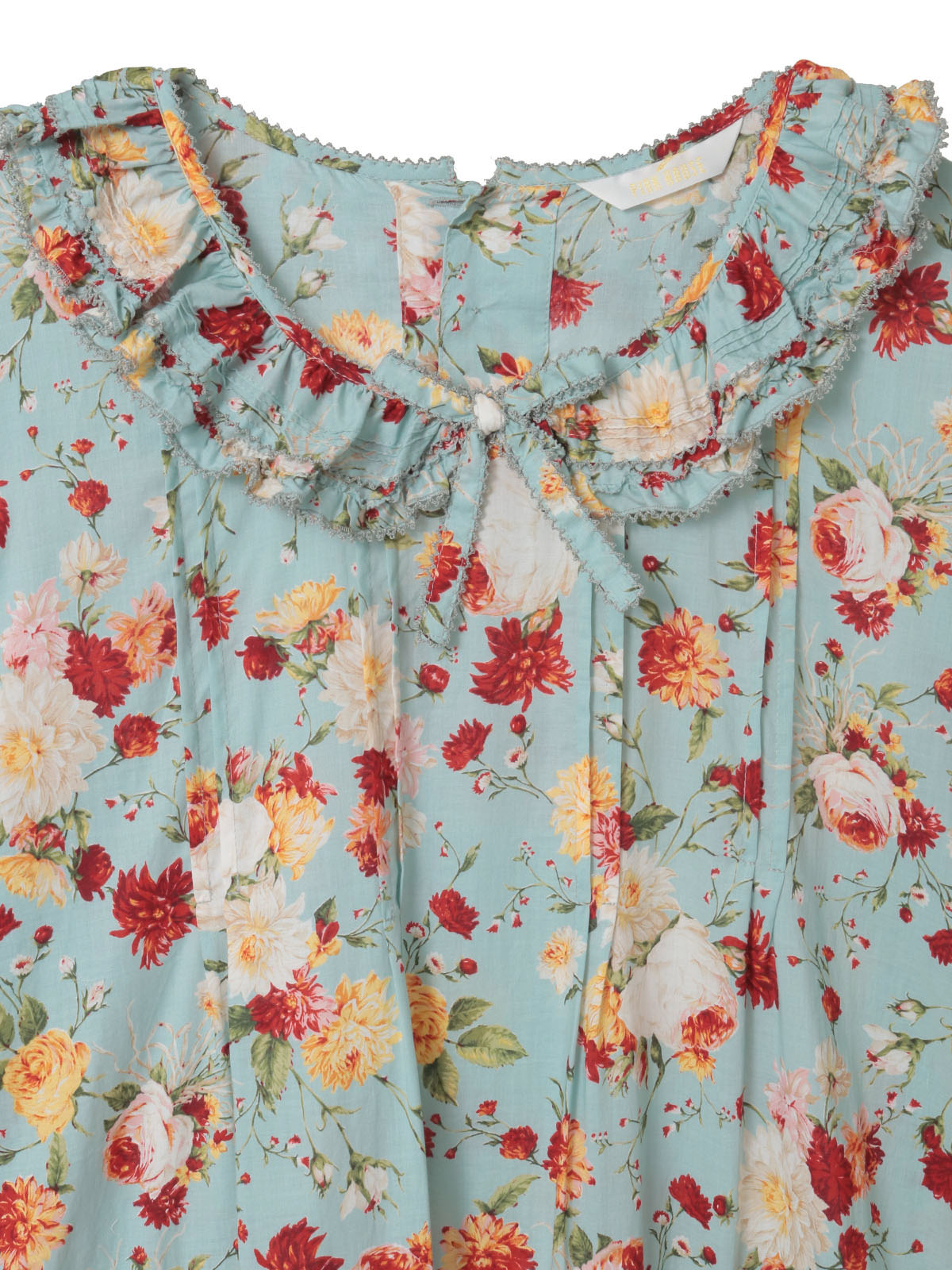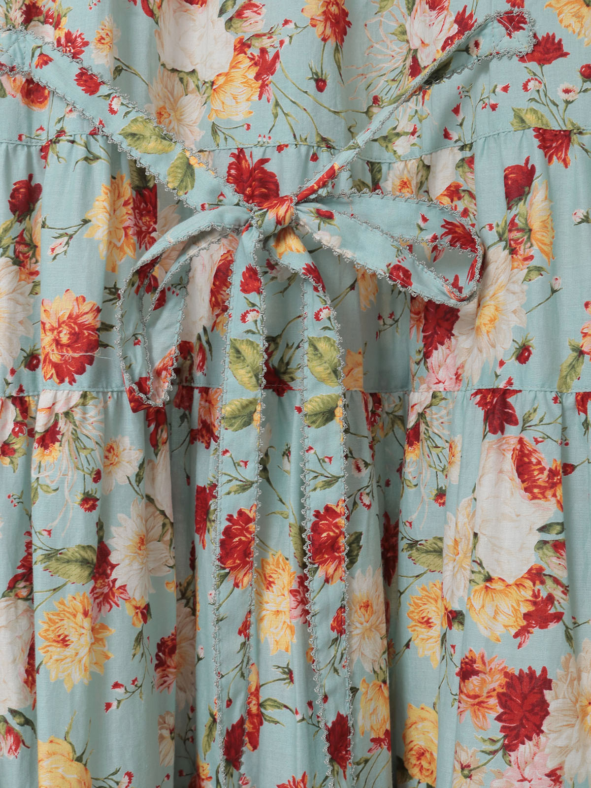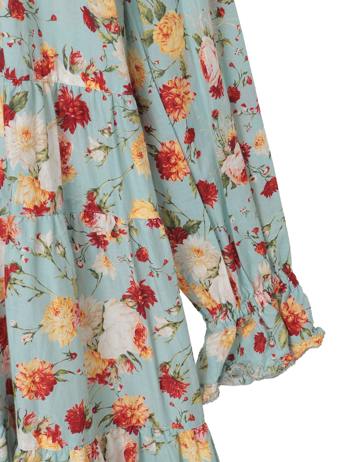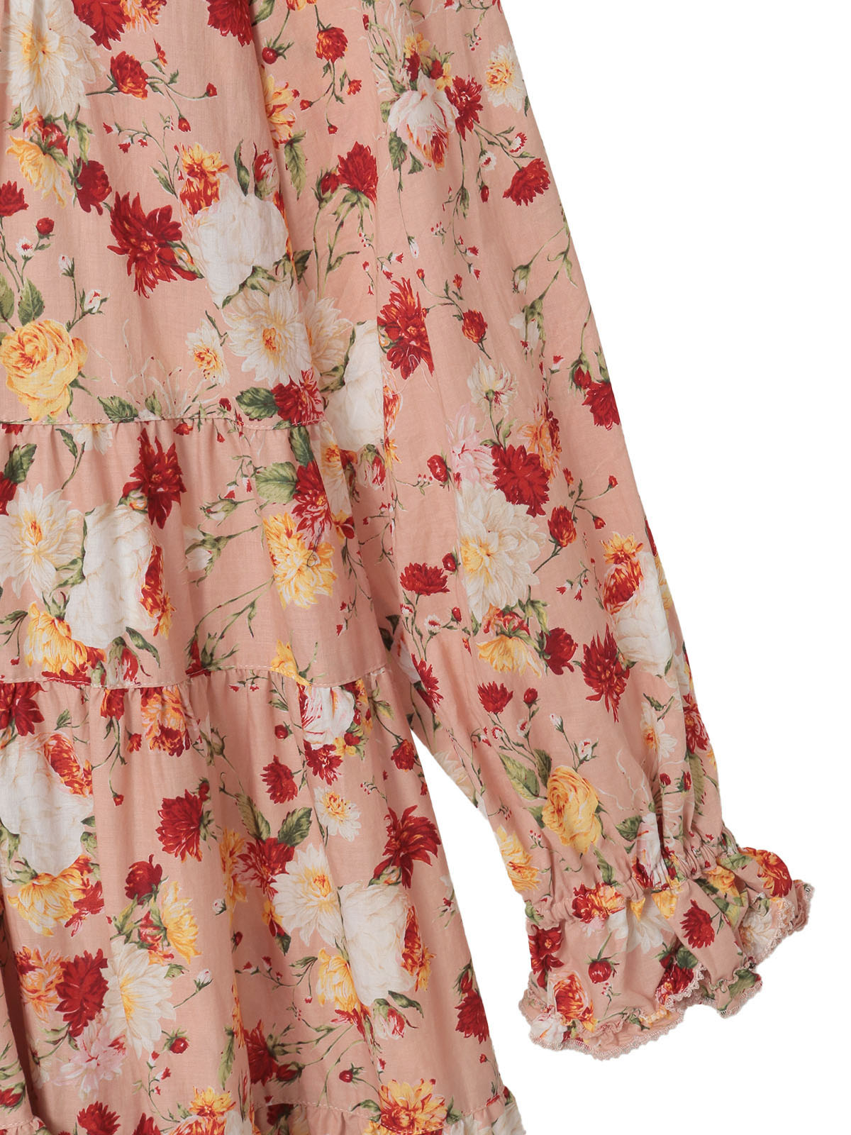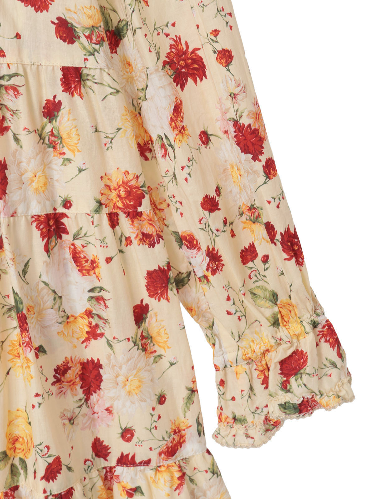 フリル襟の付いた長袖タイプのワンピースは、ウエストあたりから切り替えの入ったふんわりとしたティアードシルエット。後ろの背中あたりにリボン紐を結んでシルエット調節も可能です。