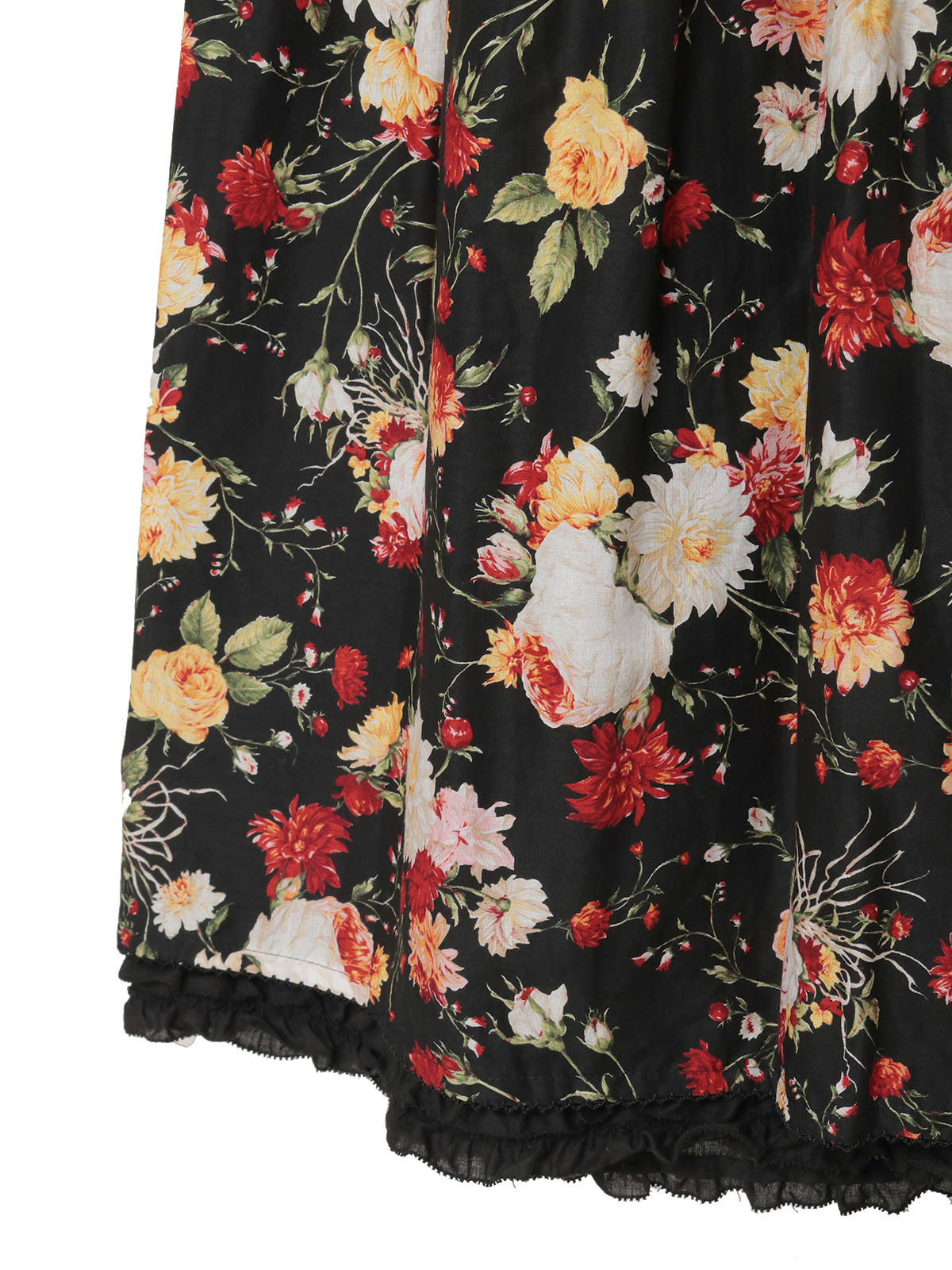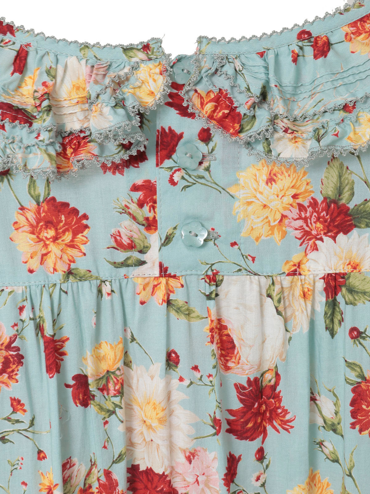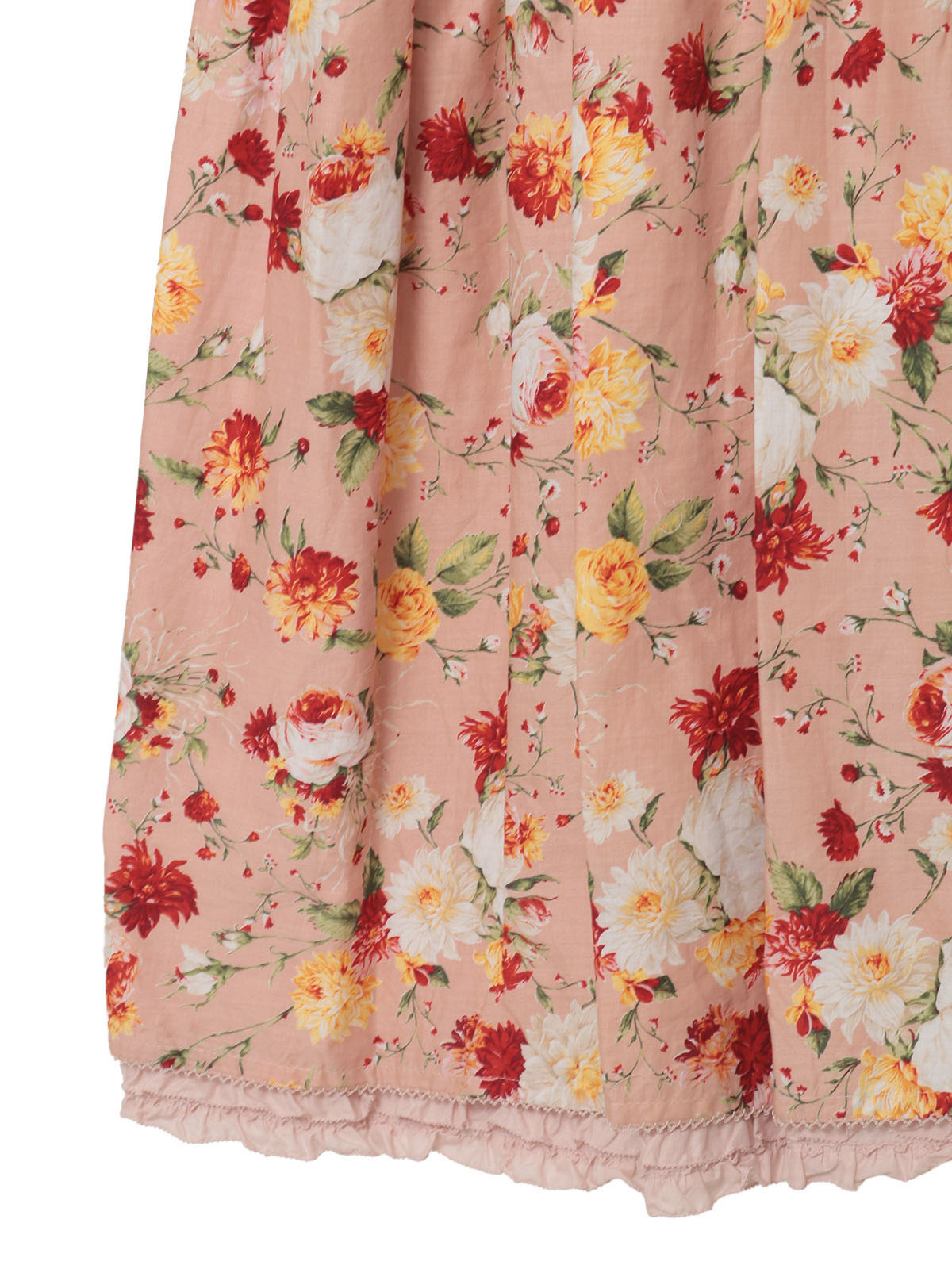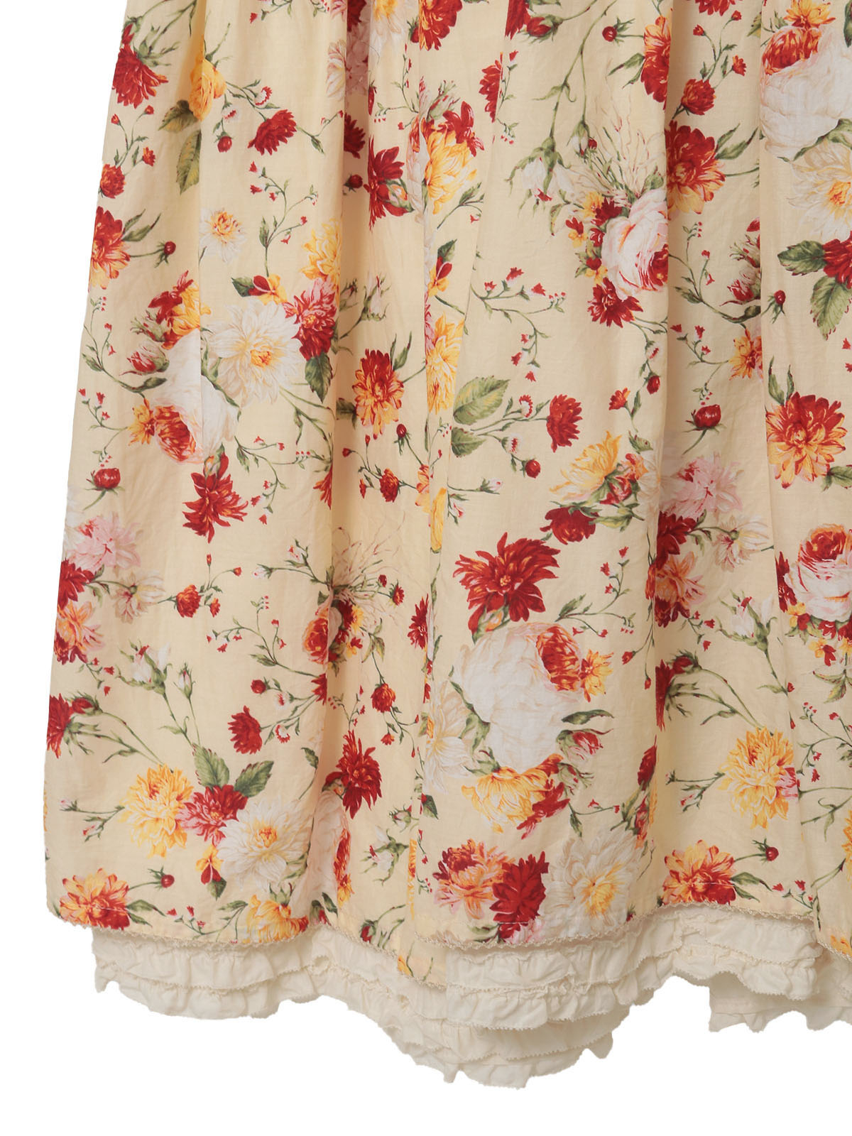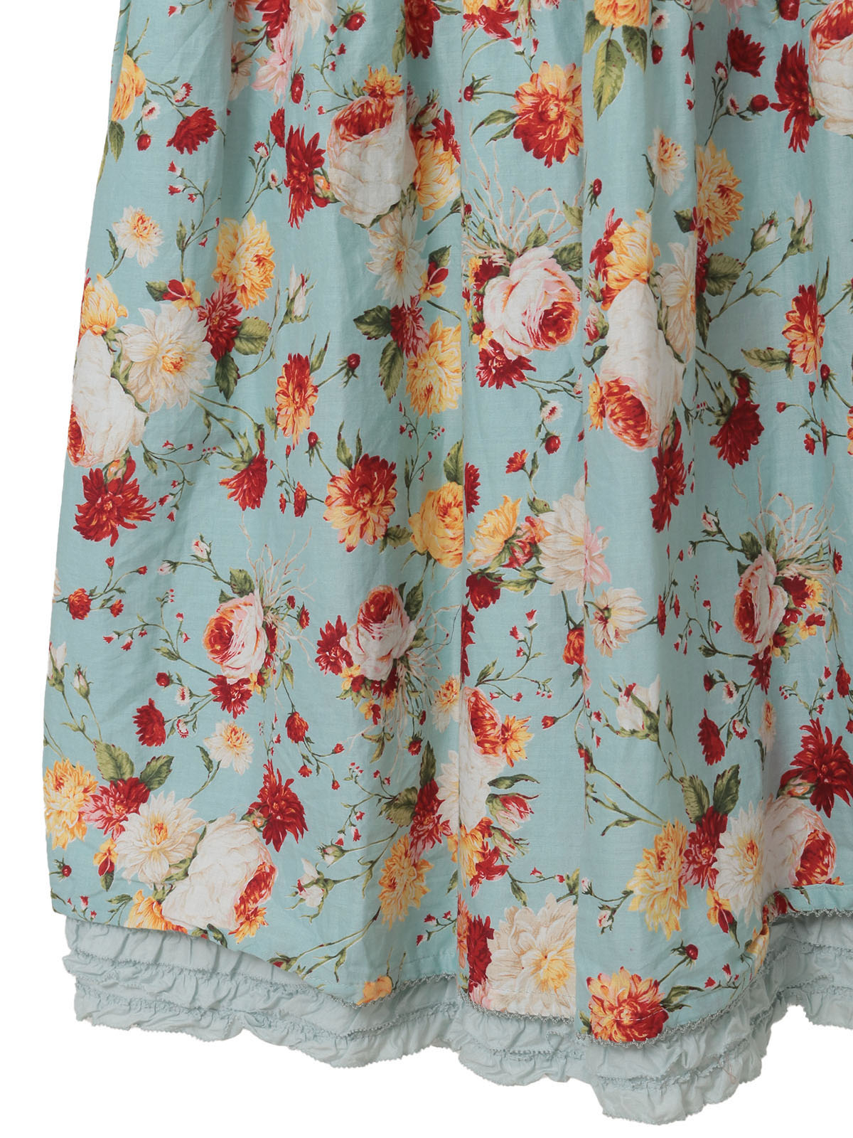 切り替え裏から無地ローンの裏地を重ねたデザインは、裾からフリルをのぞかせてペチコートを重ねなくても1枚で可愛く着られるお手軽ワンピースに。