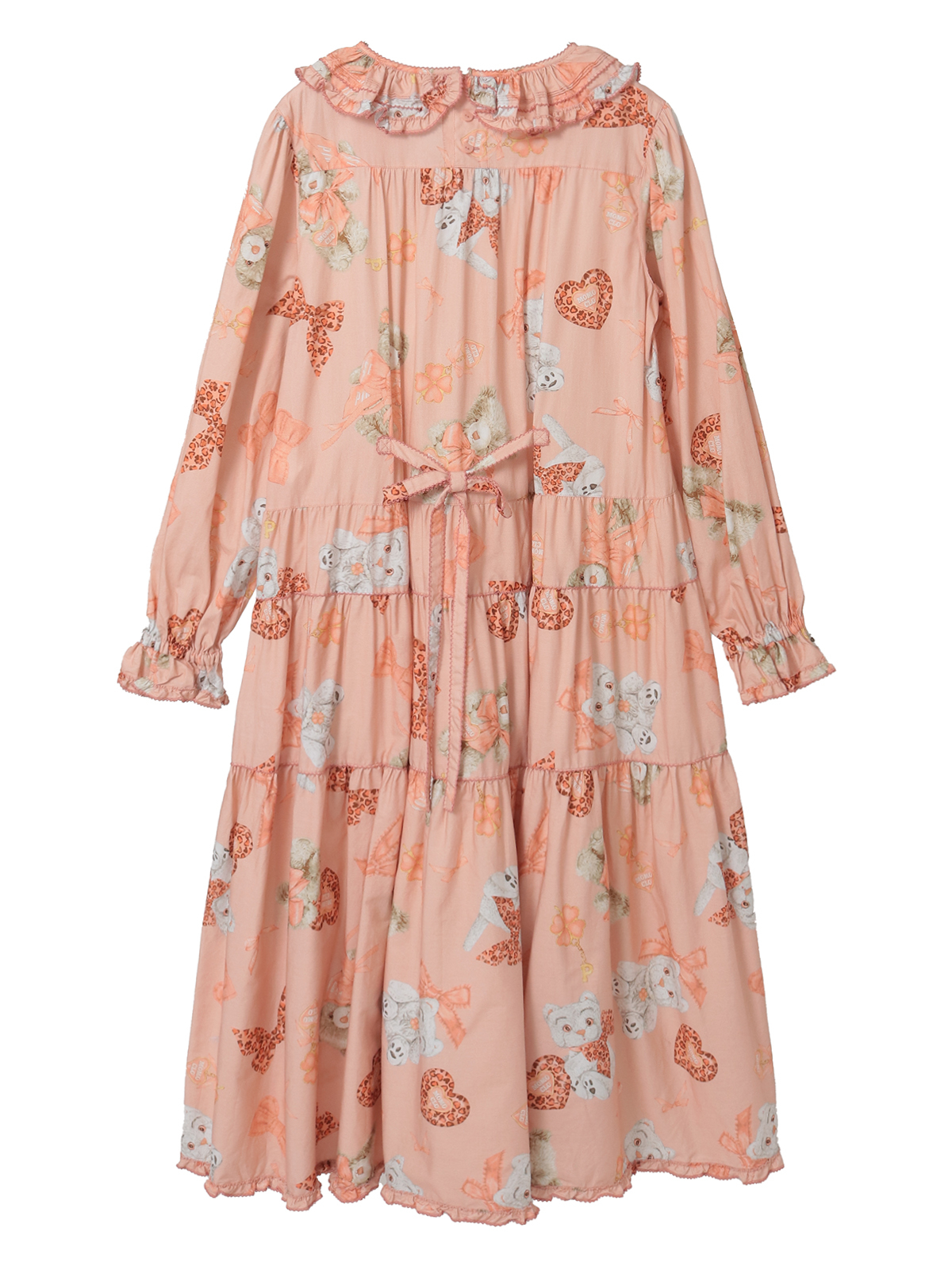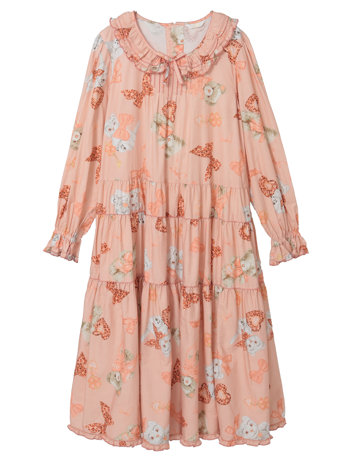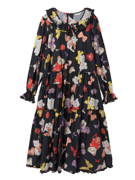 ウエストあたりから切り替えの入った分量感たっぷりティアードシルエットのミディワンピースは、フリル襟に首もとにリボンモチーフの付いた可愛らしいタイプ。