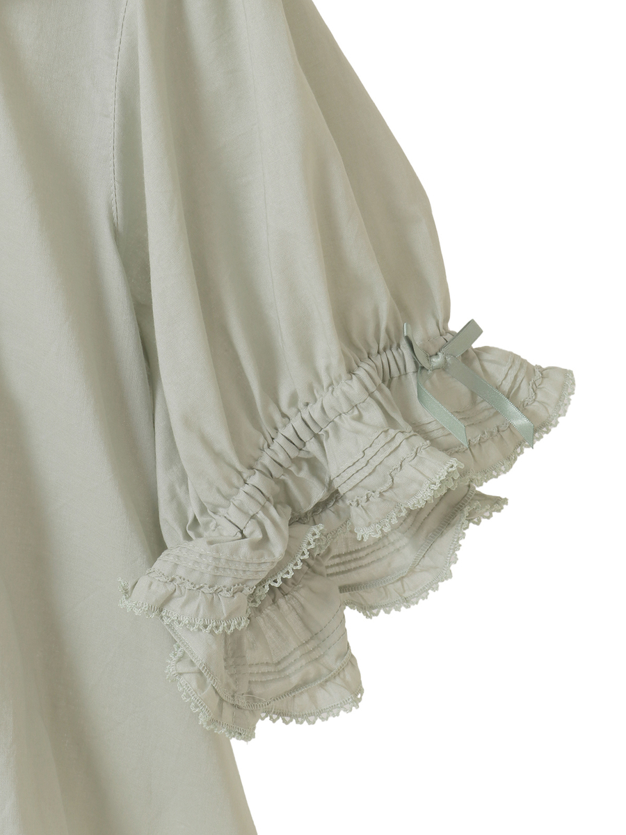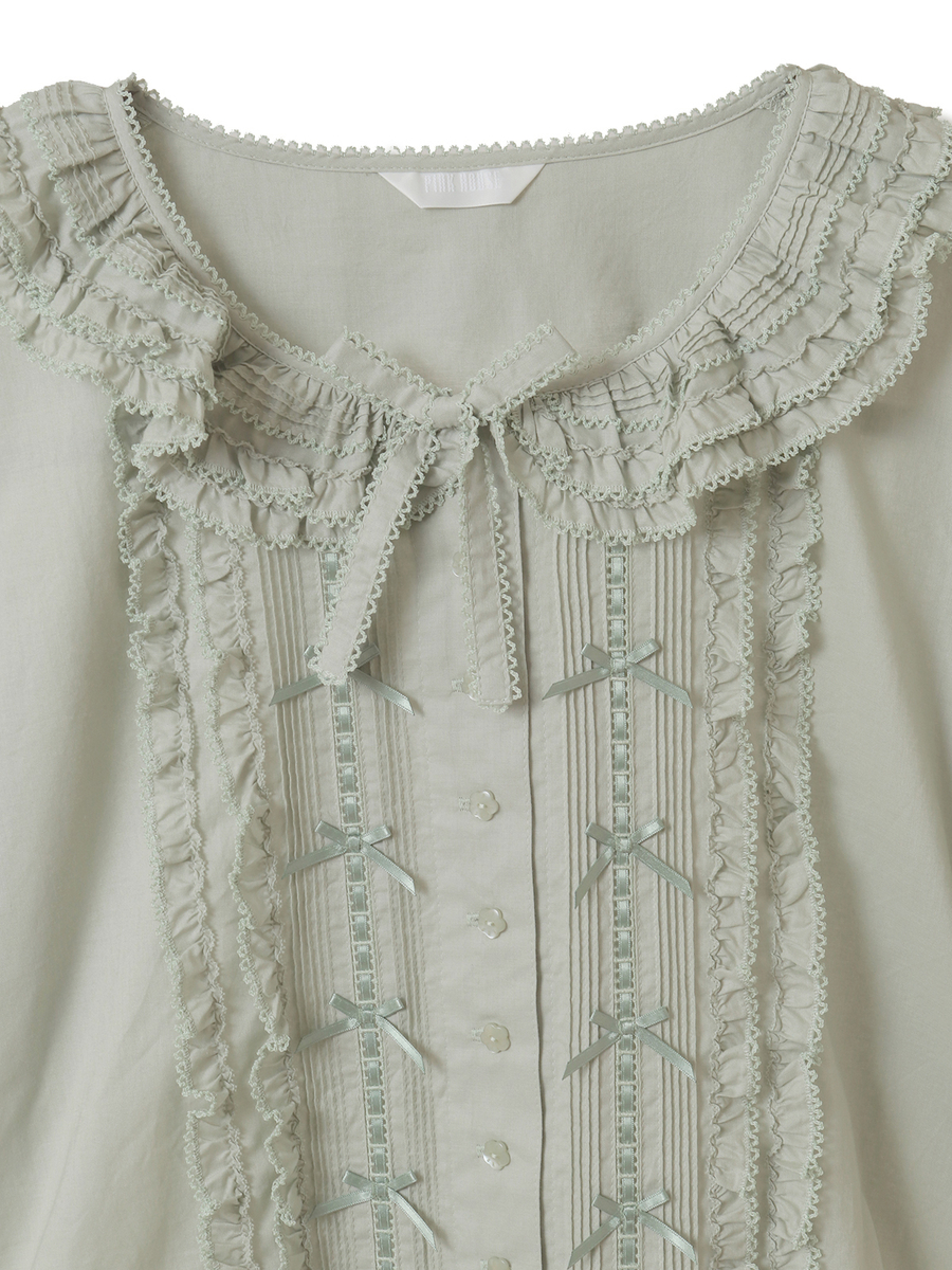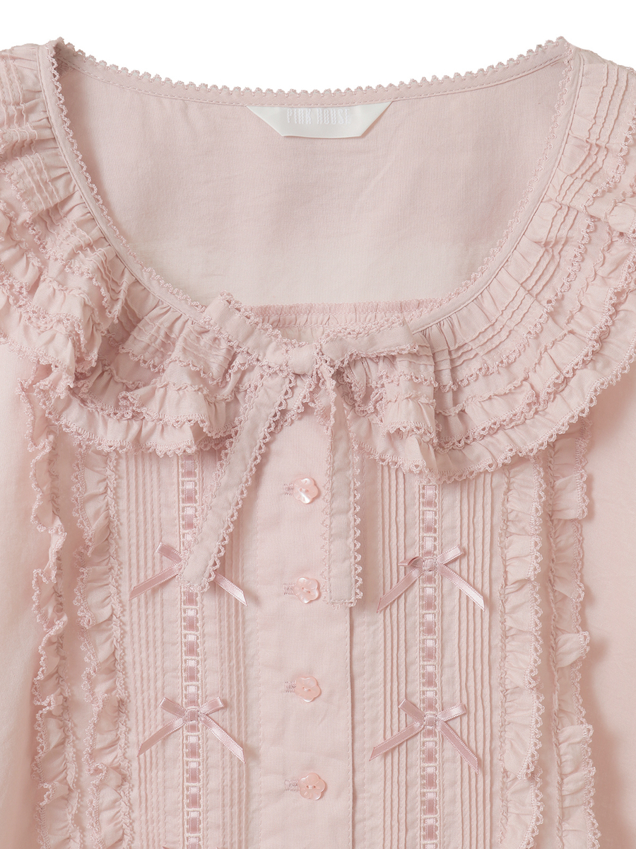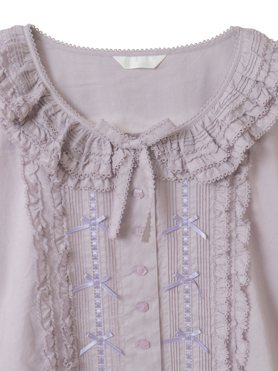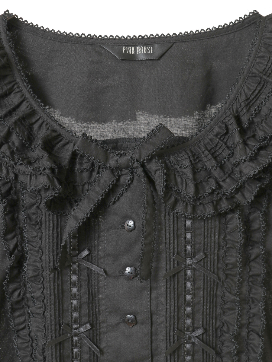 ピコフリルにピンタック、はしごレースにサテンリボン、さらにはリボンモチーフといったキュートで繊細なデティールをあしらった綿ローンのブラウス。